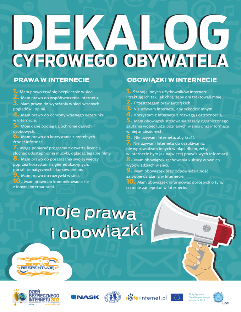 Prawa w Internecie Obowiązki w Internecie 1. Mam prawo czuć się bezpiecznie w sieci. 2. Mam prawo do współtworzenia Internetu. 3. Mam prawo do wyrażania w sieci własnych 1. Szanuję innych użytkowników Internetu poglądów i opinii. 4. Mam prawo do ochrony własnego wizerunku w Internecie. 5. Moje dane podlegają ochronie danych osobowych. Mam prawo do korzystania z rzetelnych źródeł informacji. 6. 7. Mogę pobierać programy z otwartą licencją, i traktuję ich tak, jak chcę, żeby oni traktowali mnie. 2. Przestrzegam praw autorskich. 3. Nie używam Internetu, aby szkodzić innym. 4. Korzystam z Internetu z rozwagą i ostrożnością. 5. Mam obowiązek stosowania zasady ograniczonego zaufania wobec ludzi poznanych w sieci oraz informacji w niej znalezionych. 6. Nie używam Internetu, aby kraść. 7. Nie używam Internetu do oszukiwania, słuchać udostępnionej muzyki, oglądać legalne filmy. nie wprowadzam innych w błąd, dbam, żeby w Internecie było jak najwięcej prawdziwych informacji. poprzez korzystanie z gier edukacyjnych, portali tematycznych i kursów online. wypowiedziach w sieci. 8. Mam prawo do poszerzania swojej wiedzy 9. Mam prawo do rozrywki w sieci. 10. Mam prawo do komunikowania się z innymi Internautami. 8. Mam obowiązek zachowania kultury w swoich 9. Mam obowiązek brać odpowiedzialność za swoje działania w Internecie. 10. Mam obowiązek informować dorosłych o tym, co mnie zaniepokoi w Internecie. moje prawa i k z ą i w o b o i Złoty Sponsor Dnia Bezpiecznego Internetu 2013