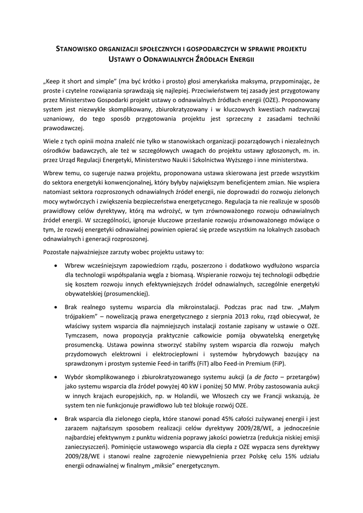 STANOWISKO ORGANIZACJI SPOŁECZNYCH I GOSPODARCZYCH W SPRAWIE PROJEKTU USTAWY O ODNAWIALNYCH ŹRÓDŁACH ENERGII „Keep it short and simple” (ma być krótko i prosto) głosi amerykańska maksyma, przypominając, że proste i czytelne rozwiązania sprawdzają się najlepiej. Przeciwieństwem tej zasady jest przygotowany przez Ministerstwo Gospodarki projekt ustawy o odnawialnych źródłach energii (OZE). Proponowany system jest niezwykle skomplikowany, zbiurokratyzowany i w kluczowych kwestiach nadzwyczaj uznaniowy, do tego sposób przygotowania projektu jest sprzeczny z zasadami techniki prawodawczej. Wiele z tych opinii można znaleźć nie tylko w stanowiskach organizacji pozarządowych i niezależnych ośrodków badawczych, ale też w szczegółowych uwagach do projektu ustawy zgłoszonych, m. in. przez Urząd Regulacji Energetyki, Ministerstwo Nauki i Szkolnictwa Wyższego i inne ministerstwa. Wbrew temu, co sugeruje nazwa projektu, proponowana ustawa skierowana jest przede wszystkim do sektora energetyki konwencjonalnej, który byłyby największym beneficjentem zmian. Nie wspiera natomiast sektora rozproszonych odnawialnych źródeł energii, nie doprowadzi do rozwoju zielonych mocy wytwórczych i zwiększenia bezpieczeństwa energetycznego. Regulacja ta nie realizuje w sposób prawidłowy celów dyrektywy, którą ma wdrożyć, w tym zrównoważonego rozwoju odnawialnych źródeł energii. W szczególności, ignoruje kluczowe przesłanie rozwoju zrównoważonego mówiące o tym, że rozwój energetyki odnawialnej powinien opierać się przede wszystkim na lokalnych zasobach odnawialnych i generacji rozproszonej. Pozostałe najważniejsze zarzuty wobec projektu ustawy to: Wbrew wcześniejszym zapowiedziom rządu, poszerzono i dodatkowo wydłużono wsparcia dla technologii współspalania węgla z biomasą. Wspieranie rozwoju tej technologii odbędzie się kosztem rozwoju innych efektywniejszych źródeł odnawialnych, szczególnie energetyki obywatelskiej (prosumenckiej). Brak realnego systemu wsparcia dla mikroinstalacji. Podczas prac nad tzw. „Małym trójpakiem” – nowelizacją prawa energetycznego z sierpnia 2013 roku, rząd obiecywał, że właściwy system wsparcia dla najmniejszych instalacji zostanie zapisany w ustawie o OZE. Tymczasem, nowa propozycja praktycznie całkowicie pomija obywatelską energetykę prosumencką. Ustawa powinna stworzyć stabilny system wsparcia dla rozwoju małych przydomowych elektrowni i elektrociepłowni i systemów hybrydowych bazujący na sprawdzonym i prostym systemie Feed-in tariffs (FiT) albo Feed-in Premium (FiP). Wybór skomplikowanego i zbiurokratyzowanego systemu aukcji (a de facto – przetargów) jako systemu wsparcia dla źródeł powyżej 40 kW i poniżej 50 MW. Próby zastosowania aukcji w innych krajach europejskich, np. w Holandii, we Włoszech czy we Francji wskazują, że system ten nie funkcjonuje prawidłowo lub też blokuje rozwój OZE. Brak wsparcia dla zielonego ciepła, które stanowi ponad 45% całości zużywanej energii i jest zarazem najtańszym sposobem realizacji celów dyrektywy 2009/28/WE, a jednocześnie najbardziej efektywnym z punktu widzenia poprawy jakości powietrza (redukcja niskiej emisji zanieczyszczeń). Pominięcie ustawowego wsparcia dla ciepła z OZE wypacza sens dyrektywy 2009/28/WE i stanowi realne zagrożenie niewypełnienia przez Polskę celu 15% udziału energii odnawialnej w finalnym „miksie” energetycznym. Nie zapewnienie osiągnięcia celów dyrektywy OZE 2009/28/WE ze względu na brak poprawy funkcjonowania kluczowych wymogów tej dyrektywy dotyczących transparentności i niedyskryminującego dostępu do sieci. Powyższe zarzuty sprawiają, że w opinii sygnatariuszy niniejszego stanowiska, projekt w prezentowanym kształcie nie spełnia warunków do dalszego procedowania. Ustawa o Odnawialnych Źródłach Energii powinna przyspieszyć rozwój rynku energii odnawialnej i stać się katalizatorem innowacyjności, rozwoju technologicznego oraz kołem zamachowym polskiej gospodarki. Aby to mogło się dokonać, niezbędne jest utrzymanie kierunku zmian zaproponowanych przez Ministerstwo Gospodarki w projekcie ustawy o odnawialnych źródłach energii w wersji z 4.10.2012 r. w zakresie wsparcia dla mikro i małych instalacji OZE, kosztem wprowadzenia ograniczeń dla technologii współspalania węgla z biomasą (znaczące ograniczenie wysokości i okresu wsparcia istniejących i nowych instalacji „spalania wielopaliwowego”). Projekt ustawy z dnia 4 października 2012 roku został przygotowany w oparciu o żmudne i niezwykle szerokie konsultacje społeczne i uwzględnia uwagi oraz rzeczywiste potrzeby sektora energetyki odnawialnej. W naszej opinii, projekt ten tworzy fundamenty dla powstania w Polsce energetyki rozproszonej, która będzie stanowić bodziec do rozwoju małych i średnich przedsiębiorstw, zwłaszcza na obszarach wiejskich, które z natury rzeczy stają się na świecie kolebką energetyki prosumenckiej (decydują istniejące potrzeby na tych obszarach i zasoby, w Polsce dodatkowo bardzo słabe sieci), a także zwiększy ogólnie bezpieczeństwo energetyczne. Dodatkowo, dzięki znacznemu zmniejszeniu wsparcia dla współspalania węgla z biomasą, proponowane wcześniej rozwiązania umożliwią rozwój nowych mocy i dywersyfikację źródeł energii, zapewniając liczne korzyści społeczne, ekonomiczne i ekologiczne. Powyższe stanowisko jest powodowane odpowiedzialnością niżej podpisanych za zrównoważony, pluralistyczny i partycypacyjny model rozwoju energetyki, który będzie dostosowany do warunków krajowych i zarazem zgodny z polityką Unii Europejskiej. Model, który daje wszystkim podmiotom na rynku szanse działania i pozwala na maksymalizację korzyści w kraju, na rzecz obywateli i gospodarki. Sygnatariusze: Związek Pracodawców Forum Energetyki Odnawialnej Grzegorz Wiśniewski, prezes Polska Organizacja Rozwoju Technologii Pomp Ciepła Paweł L