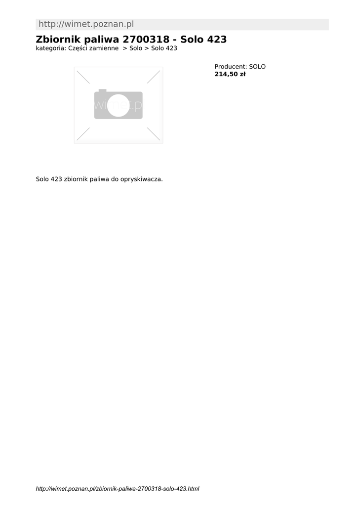 http://wimet.poznan.pl Zbiornik paliwa 2700318 - Solo 423 kategoria: Części zamienne > Solo > Solo 423 Producent: SOLO 214,50 zł Solo 423 zbiornik paliwa do opryskiwacza. http://wimet.poznan.pl/zbiornik-paliwa-2700318-solo-423.html