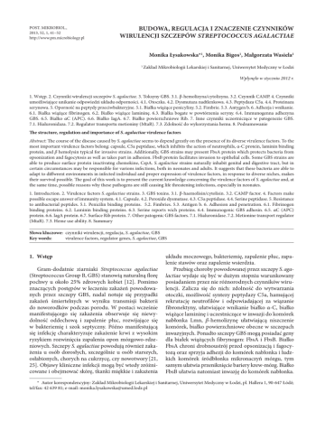 POST. MIKROBIOL., 2013, 52, 1, 41–52 http://www.pm.microbiology.pl BUDOWA, REGULACJA I ZNACZENIE CZYNNIKÓW WIRULENCJI SZCZEPÓW STREPTOCOCCUS AGALACTIAE Monika Łysakowska*1, Monika Bigos1, Małgorzata Wasiela1 1 Zakład Mikrobiologii Lekarskiej i Sanitarnej, Uniwersytet Medyczny w Łodzi Wpłynęło w styczniu 2012 r. 1. Wstęp. 2. Czynniki wirulencji szczepów S. agalactiae. 3. Toksyny GBS. 3.1. β-hemolizyna/cytolizyna. 3.2. Czynnik CAMP. 4. Czynniki umożliwiające unikanie odpowiedzi układu odporności. 4.1. Otoczka. 4.2. Dysmutaza nadtlenkowa. 4.3. Peptydaza C5a. 4.4. Proteinaza serynowa. 5. Oporność na peptydy przeciwbakteryjne. 5.1. Białka wiążące penicyliny. 5.2. Fimbrie. 5.3. Antygen b. 6. Adhezja i wnikanie. 6.1. Białka wiążące fibrinogen. 6.2. Białko wiążące lamininę. 6.3. Białka bogate w powtórzenia seryny. 6.4. Immunogenna adhezyna GBS. 6.5. Białko αC (APC). 6.6. Białko IagA. 6.7. Białko powierzchniowe Rib. 7. Inne czynniki uczestniczące w patogenezie GBS. 7.1. Hialuronidaza. 7.2. Regulator transportu metioniny (MtaR). 7.3. Zdolność do wykorzystania hemu. 8. Podsumowanie The structure, regulation and importance of S. agalactiae virulence factors Abstract: The course of the disease caused by S. agalactiae seems to depend greatly on the presence of its diverse virulence factors. To the most important virulence factors belong: capsule, C5a peptidase, which inhibits the action of neutrophils, α-C protein, laminin binding protein, and β hemolysin typical for invasive strains. Additionally, GBS strains may present FbsA protein which protects bacteria from opsonization and fagocytosis as well as takes part in adhesion. FbsB protein facilitates invasion to epithelial cells. Some GBS strains are able to produce surface protein inactivatng chemokine, CspA. S. agalactiae strains naturally inhabit genital and digestive tract, but in certain circumstances may be responsible for varions infections, both in neonates and adults. It suggests that these bacteria are able to adapt to diffwrent environments in infected individual and proper expression of virulence factors, in response to diverse niches, makes their survival possible. The goal of this work is to present the current knowledge concerning the virulence factors of S. agalactiae and, at the same time, possible reasons why these pathogens are still causing life threatening infections, especially in neonates. 1. Introduction. 2. Virulence factors S. agalactiae strains. 3. GBS toxins. 3.1. β-haemolisin/cytolisin. 3.2. CAMP factor. 4. Factors make possible escape answer of immunity system. 4.1. Capsule. 4.2. Peroxide dysmutase. 4.3. C5a peptidase. 4.4. Serine peptidase. 5. Resistance to antibacterial peptides. 5.1. Penicilin binding proteins. 5.2. Fimbries. 5.3. Antigen b. 6. Adhesion and penetration. 6.1. Fibrinogen binding proteins. 6.2. Laminin binding proteins. 6.3. Serine reports wich proteins. 6.4. Immunogenic GBS adhesin. 6.5. αC (APC) protein. 6.6. IagA protein. 6.7. Surface Rib protein. 7. Other patogenic GBS factors. 7.1. Hialuronidase. 7.2. Metionine transport regulator (MtaR). 7.3. Heme use ability. 8. Summary Słowa kluczowe: czynniki wirulencji, regulacja, S. agalactiae, GBS Key words: virulence factors, regulator genes, S. agalactiae, GBS 1. Wstęp Gram-dodatnie ziarniaki Streptococcus agalactiae (Streptococcus Group B, GBS) stanowią naturalną florę pochwy u około 25% zdrowych kobiet [12]. Pomimo znaczących postępów w leczeniu zakażeń powodowanych przez szczepy GBS, nadal notuje się przypadki zakażeń śmiertelnych w wyniku transmisji bakterii do noworodków podczas porodu. W postaci wcześnie manifestującego się zakażenia obserwuje się niewydolność oddechową i zapalenie płuc, rozwijające się w bakteriemię i szok septyczny. Późno manifestującą się infekcję charakteryzuje zakażenie krwi z wysokim ryzykiem rozwinięcia zapalenia opon mózgowo-rdzeniowych. Szczepy S. agalactiae powodują również zakażenia u osób dorosłych, szczególnie u osób starszych, osłabionych, chorych na cukrzycę, czy nowotwory [21, 25]. Objawy kliniczne infekcji mogą być wtedy zróżnicowane i obejmować skórę, tkanki miękkie i zakażenia układu moczowego, bakteriemię, zapalenie płuc, zapalenie stawów oraz zapalenie wsierdzia. Przebieg choroby powodowanej przez szczepy S. agalactiae wydaje się być w dużym stopniu warunkowany posiadaniem przez nie różnorodnych czynników wirulencji. Zalicza się do nich: zdolność do wytwarzania otoczki, możliwość syntezy peptydazy C5a, hamującej rekrutację neutrofilów i odpowiadającej za wiązanie fibronektyny, ułatwiające wnikanie białko α-C, białko wiążące lamininę i uczestniczące w inwazji do komórek nabłonka Lmn, β-hemolizynę ułatwiającą niszczenie komórek, białko powierzchniowe obecne w szczepach inwazyjnych. Ponadto szczepy GBS mogą posiadać geny dla białek wiążących fibrynogen: FbsA i FbsB. Białko FbsA chroni drobnoustrój przed opsonizacją i fagocytozą oraz sprzyja adhezji do komórek nabłonka i ludzkich komórek śródbłonka mikronaczyń mózgu, tym samym ułatwia przeniknięcie bariery krew-mózg. Białko FbsB ułatwia natomiast inwazję do komórek nabłonka. * Autor korespondencyjny: Zakład Mikrobiologii Lekarskiej i Sanitarnej, Uniwersytet Medyczny w Łodzi, pl. Hallera 1, 90-647 Łódź; tel/fax: 42 639 81; e-mail: [email protected] 42 MONIKA ŁYSAKOWSKA, MONIKA BIGOS, MAŁGORZATA WASIELA Niektóre szczepy są zdolne także do wytwarzania białka powierzchniowego CspA uczestniczącego w degradacji chemokin. Szczepy GBS naturalnie bytują w przewodzie rozrodczym i dalszych odcinkach przewodu pokarmowego, jako patogeny natomiast mogą powodować różnego rodzaju zakażenia. Sugeruje to, że bakterie te są zdolne do adaptowania się do zmieniających się warunków otoczenia, a właściwa ekspresja czynników wirulencji w odpowiedzi na środowisko bytowania umożliwia szczepom GBS prze