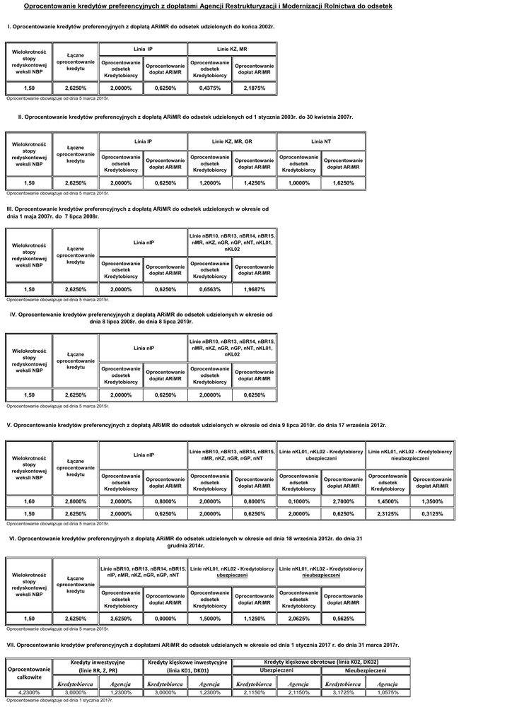 Oprocentowanie kredytów preferencyjnych z dopłatami Agencji Restrukturyzacji i Modernizacji Rolnictwa do odsetek I. Oprocentowanie kredytów preferencyjnych z dopłatą ARiMR do odsetek udzielonych do końca 2002r. Linia IP Wielokrotność stopy redyskontowej weksli NBP Łączne oprocentowanie kredytu 1,50 2,6250% Linie KZ, MR Oprocentowanie odsetek Kredytobiorcy Oprocentowanie dopłat ARiMR Oprocentowanie odsetek Kredytobiorcy Oprocentowanie dopłat ARiMR 2,0000% 0,6250% 0,4375% 2,1875% Oprocentowanie obowiązuje od dnia 5 marca 2015r. II. Oprocentowanie kredytów preferencyjnych z dopłatą ARiMR do odsetek udzielonych od 1 stycznia 2003r. do 30 kwietnia 2007r. Linia IP Wielokrotność stopy redyskontowej weksli NBP Łączne oprocentowanie kredytu 1,50 2,6250% Linie KZ, MR, GR Linia NT Oprocentowanie odsetek Kredytobiorcy Oprocentowanie dopłat ARiMR Oprocentowanie odsetek Kredytobiorcy Oprocentowanie dopłat ARiMR Oprocentowanie odsetek Kredytobiorcy Oprocentowanie dopłat ARiMR 2,0000% 0,6250% 1,2000% 1,4250% 1,0000% 1,6250% Oprocentowanie obowiązuje od dnia 5 marca 2015r. III. Oprocentowanie kredytów preferencyjnych z dopłatą ARiMR do odsetek udzielonych w okresie od dnia 1 maja 2007r. do 7 lipca 2008r. Linie nBR10, nBR13, nBR14, nBR15, nMR, nKZ, nGR, nGP, nNT, nKL01, nKL02 Linia nIP Wielokrotność stopy redyskontowej weksli NBP Łączne oprocentowanie kredytu 1,50 2,6250% Oprocentowanie odsetek Kredytobiorcy Oprocentowanie dopłat ARiMR Oprocentowanie odsetek Kredytobiorcy Oprocentowanie dopłat ARiMR 2,0000% 0,6250% 0,6563% 1,9687% Oprocentowanie obowiązuje od dnia 5 marca 2015r. IV. Oprocentowanie kredytów preferencyjnych z dopłatą ARiMR do odsetek udzielonych w okresie od dnia 8 lipca 2008r. do dnia 8 lipca 2010r. Linie nBR10, nBR13, nBR14, nBR15, nMR, nKZ, nGR, nGP, nNT, nKL01, nKL02 Linia nIP Wielokrotność stopy redyskontowej weksli NBP Łączne oprocentowanie kredytu 1,50 2,6250% Oprocentowanie odsetek Kredytobiorcy Oprocentowanie dopłat ARiMR Oprocentowanie odsetek Kredytobiorcy Oprocentowanie dopłat ARiMR 2,0000% 0,6250% 2,0000% 0,6250% Oprocentowanie obowiązuje od dnia 5 marca 2015r. V. Oprocentowanie kredytów preferencyjnych z dopłatą ARiMR do odsetek udzielonych w okresie od dnia 9 lipca 2010r. do dnia 17 września 2012r. Linia nIP Wielokrotność stopy redyskontowej weksli NBP Łączne oprocentowanie kredytu 1,60 1,50 Linie nBR10, nBR13, nBR14, nBR15, Linie nKL01, nKL02 - Kredytobiorcy nMR, nKZ, nGR, nGP, nNT ubezpieczeni Linie nKL01, nKL02 - Kredytobiorcy nieubezpieczeni Oprocentowanie odsetek Kredytobiorcy Oprocentowanie dopłat ARiMR Oprocentowanie odsetek Kredytobiorcy Oprocentowanie dopłat ARiMR Oprocentowanie odsetek Kredytobiorcy Oprocentowanie dopłat ARiMR Oprocentowanie odsetek Kredytobiorcy Oprocentowanie dopłat ARiMR 2,8000% 2,0000% 0,8000% 2,0000% 0,8000% 0,1000% 2,7000% 1,4500% 1,3500% 2,6250% 2,0000% 0,6250% 2,0000% 0,6250% 2,0000% 0,6250% 2,3125% 0,3125% Oprocentowanie obowiązuje od dnia 5 marca 2015r. VI. Oprocentowanie kredytów preferencyjnych z dopłatą ARiMR do odsetek udzielonych w okresie od dnia 18 września 2012r. do dnia 31 grudnia 2014r. Wielokrotność stopy redyskontowej weksli NBP Łączne oprocentowanie kredytu 1,50 2,6250% Linie nBR10, nBR13, nBR14, nBR15, Linie nKL01, nKL02 - Kredytobiorcy nIP, nMR, nKZ, nGR, nGP, nNT ubezpieczeni Linie nKL01, nKL02 - Kredytobiorcy nieubezpieczeni Oprocentowanie odsetek Kredytobiorcy Oprocentowanie dopłat ARiMR Oprocentowanie odsetek Kredytobiorcy Oprocentowanie dopłat ARiMR Oprocentowanie odsetek Kredytobiorcy Oprocentowanie dopłat ARiMR 2,6250% 0,0000% 1,5000% 1,1250% 2,0625% 0,5625% Oprocentowanie obowiązuje od dnia 5 marca 2015r. VII. Oprocentowanie kredytów preferencyjnych z dopłatami ARiMR do odsetek udzielanych w okresie od dnia 1 stycznia 2017 r. do dnia 31 marca 2017r. Oprocentowanie całkowite 4,2300% Kredyty inwestycyjne (linie RR, Z, PR) Kredyty klęskowe inwestycyjne (linia K01, DK01) Kredyty klęskowe obrotowe (linia K02, DK02) Ubezpieczeni Nieubezpieczeni Kredytobiorca Agencja Kredytobiorca Agencja Kredytobiorca Agencja Kredytobiorca Agencja 3,0000% 1,2300% 3,0000% 1,2300% 2,1150% 2,1150% 3,1725% 1,0575% Oprocentowanie obowiązuje od dnia 1 stycznia 2017r.