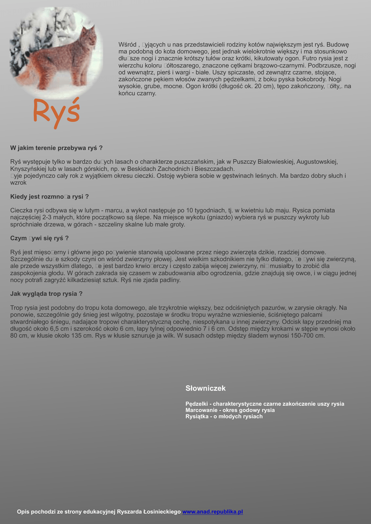 Wśród , żyjących u nas przedstawicieli rodziny kotów największym jest ryś. Budowę ma podobną do kota domowego, jest jednak wielokrotnie większy i ma stosunkowo dłuższe nogi i znacznie krótszy tułów oraz krótki, kikutowaty ogon. Futro rysia jest z wierzchu koloru żółtoszarego, znaczone cętkami brązowo-czarnymi. Podbrzusze, nogi od wewnątrz, pierś i wargi - białe. Uszy spiczaste, od zewnątrz czarne, stojące, zakończone pękiem włosów zwanych pędzelkami, z boku pyska bokobrody. Nogi wysokie, grube, mocne. Ogon krótki (długość ok. 20 cm), tępo zakończony, żółty,. na końcu czarny. Ryś W jakim terenie przebywa ryś ? Ryś występuje tylko w bardzo dużych lasach o charakterze puszczańskim, jak w Puszczy Białowieskiej, Augustowskiej, Knyszyńskiej lub w lasach górskich, np. w Beskidach Zachodnich i Bieszczadach. Żyje pojedynczo cały rok z wyjątkiem okresu cieczki. Ostoję wybiera sobie w gęstwinach leśnych. Ma bardzo dobry słuch i wzrok Kiedy jest rozmnoża rysi ? Cieczka rysi odbywa się w lutym - marcu, a wykot następuje po 10 tygodniach, tj. w kwietniu lub maju. Rysica pomiata najczęściej 2-3 małych, które początkowo są ślepe. Na miejsce wykotu (gniazdo) wybiera ryś w puszczy wykroty lub spróchniałe drzewa, w górach - szczeliny skalne lub małe groty. Czym żywi się ryś ? Ryś jest mięsożerny i główne jego pożywienie stanowią upolowane przez niego zwierzęta dzikie, rzadziej domowe. Szczególnie duże szkody czyni on wśród zwierzyny płowej. Jest wielkim szkodnikiem nie tylko dlatego, że żywi się zwierzyną, ale przede wszystkim dlatego, że jest bardzo krwiożerczy i często zabija więcej zwierzyny, niż musiałby to zrobić dla zaspokojenia głodu. W górach zakrada się czasem w zabudowania albo ogrodzenia, gdzie znajdują się owce, i w ciągu jednej nocy potrafi zagryźć kilkadziesiąt sztuk. Ryś nie zjada padliny. Jak wygląda trop rysia ? Trop rysia jest podobny do tropu kota domowego, ale trzykrotnie większy, bez odciśniętych pazurów, w zarysie okrągły. Na ponowie, szczególnie gdy śnieg jest wilgotny, pozostaje w środku tropu wyraźne wzniesienie, ściśniętego palcami stwardniałego śniegu, nadające tropowi charakterystyczną cechę, niespotykana u innej zwierzyny. Odcisk łapy przedniej ma długość około 6,5 cm i szerokość około 6 cm, łapy tylnej odpowiednio 7 i 6 cm. Odstęp między krokami w stępie wynosi około 80 cm, w kłusie około 135 cm. Rys w kłusie sznuruje ja wilk. W susach odstęp między śladem wynosi 150-700 cm. Słowniczek Pędzelki - charakterystyczne czarne zakończenie uszy rysia Marcowanie - okres godowy rysia Rysiątka - o młodych rysiach Opis pochodzi ze strony edukacyjnej Ryszarda Łosinieckiego www.anad.republika.pl