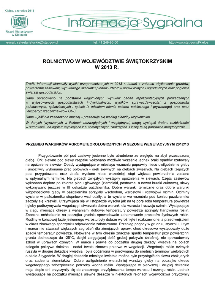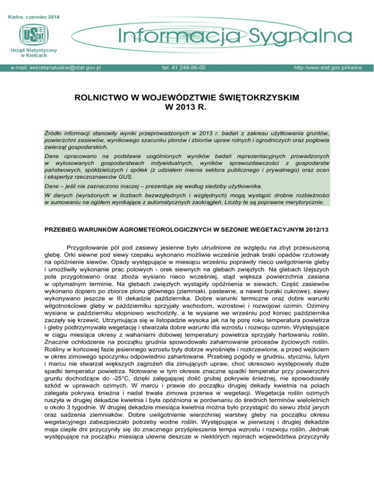 ROLNICTWO W WOJEWÓDZTWIE ŚWIĘTOKRZYSKIM W 2013 R. Źródło informacji stanowiły wyniki przeprowadzonych w 2013 r. badań z zakresu użytkowania gruntów, powierzchni zasiewów, wynikowego szacunku plonów i zbiorów upraw rolnych i ogrodniczych oraz pogłowia zwierząt gospodarskich. Dane opracowano na podstawie uogólnionych wyników badań reprezentacyjnych prowadzonych w wylosowanych gospodarstwach indywidualnych, wyników sprawozdawczości z gospodarstw państwowych, spółdzielczych i spółek (z udziałem mienia sektora publicznego i prywatnego) oraz ocen i ekspertyz rzeczoznawców GUS. Dane – jeśli nie zaznaczono inaczej – prezentuje się według siedziby użytkownika. W danych (wyrażonych w liczbach bezwzględnych i względnych) mogą wystąpić drobne rozbieżności w sumowaniu na ogółem wynikające z automatycznych zaokrągleń. Liczby te są poprawne merytorycznie. PRZEBIEG WARUNKÓW AGROMETEOROLOGICZNYCH W SEZONIE WEGETACYJNYM 2012/13 Przygotowanie pól pod zasiewy jesienne było utrudnione ze względu na zbyt przesuszoną glebę. Orki siewne pod siewy rzepaku wykonano możliwie wcześnie jednak braki opadów rzutowały na opóźnienie siewów. Opady występujące w miesiącu wrześniu poprawiły nieco uwilgotnienie gleby i umożliwiły wykonanie prac polowych - orek siewnych na glebach zwięzłych. Na glebach lżejszych pola przygotowano oraz zboża wysiano nieco wcześniej, stąd większa powierzchnia zasiana w optymalnym terminie. Na glebach zwięzłych wystąpiły opóźnienia w siewach. Część zasiewów wykonano dopiero po zbiorze plonu głównego (ziemniaki, pastewne, a nawet buraki cukrowe), siewy wykonywano jeszcze w III dekadzie października. Dobre warunki termiczne oraz dobre warunki wilgotnościowe gleby w październiku sprzyjały wschodom, wzrostowi i rozwojowi ozimin. Oziminy wysiane w październiku stopniowo wschodziły, a te wysiane we wrześniu pod koniec października zaczęły się krzewić. Utrzymująca się w listopadzie wysoka jak na tę porę roku temperatura powietrza i gleby podtrzymywała wegetację i stwarzała dobre warunki dla wzrostu i rozwoju ozimin. Występujące w ciągu miesiąca okresy z wahaniami dobowej temperatury powietrza sprzyjały hartowaniu roślin. Znaczne ochłodzenie na początku grudnia spowodowało zahamowanie procesów życiowych roślin. Rośliny w końcowej fazie jesiennego wzrostu były dobrze wyrośnięte i rozkrzewione, a przed wejściem w okres zimowego spoczynku odpowiednio zahartowane. Przebieg pogody w grudniu, styczniu, lutym i marcu nie stwarzał większych zagrożeń dla zimujących upraw, choć okresowo występowały duże spadki temperatur powietrza. Notowane w tym okresie znaczne spadki temperatur przy powierzchni gruntu dochodzące do -25°C, dzięki zalęgającej dość grubej pokrywie śnieżnej, nie spowodowały szkód w uprawach ozimych. W marcu i prawie do początku drugiej dekady kwietnia na polach zalegała pokrywa śnieżna i nadal trwała zimowa przerwa w wegetacji. Wegetacja roślin ozimych ruszyła w drugiej dekadzie kwietnia i była opóźniona w porównaniu do średnich terminów wieloletnich o około 3 tygodnie. W drugiej dekadzie miesiąca kwietnia można było przystąpić do siewu zbóż jarych oraz sadzenia ziemniaków. Dobre uwilgotnienie wierzchniej warstwy gleby na początku okresu wegetacyjnego zabezpieczało potrzeby wodne roślin. Występujące w pierwszej i drugiej dekadzie maja ciepłe dni przyczyniły się do znacznego przyśpieszenia tempa wzrostu i rozwoju roślin. Jednak występujące na początku miesiąca ulewne deszcze w niektórych rejonach województwa przyczyniły się do strat w zasiewach warzyw, powodując wymycie nasion na pochyłościach oraz namulenie w obniżeniach terenu. W tych rejonach rolnicy zmuszeni byli dokonać ponownych siewów. W trzeciej dekadzie miesiąca maja wystąpiło ochłodzenie mające wpływ na zahamowanie tempa wzrostu i rozwoju roślin. W tym okresie występowały obfite i ulewne opady deszczu z nawałnicami powodując w niektórych rejonach województwa podtopienia i zastoiska wodne, a przez to uszkodzenia w uprawach, brak możliwości zastosowania prawidłowej ochrony roślin przed chorobami i szkodnikami. W czerwcu występujące ulewne deszcze połączone z burzami i silnymi wiatrami oraz w wielu rejonach województwa gradobicia spowodowały nadmierne uwilgotnienie gleby oraz podtopienia pól. W rejonach gdzie opadów było znacznie mniej, wysoka temperatura powietrza w ciągu miesiąca sprzyjała rozwojowi i dojrzewaniu roślin uprawnych. W miesiącu lipcu brak opadów deszczu i wysokie temperatury przyczyniały się do wzrostu niedoborów wilgoci w glebie. Taki przebieg pogody w miesiącu lipcu bardzo niekorzystnie wpłynął na rozwój i wzrost ziemniaków powodując zmniejszenie plonowania wielu odmian. Wysokie temperatury i brak opadów przyspieszyły dojrzewanie zbóż, żniwa rozpoczęto w trzeciej dekadzie lipca, zebrane ziarno było suche i dobrej jakości. Pomimo spiętrzenia prac żniwnych (równocześnie przeprowadzano zbiór rzepaku oraz zbóż ozimych i jarych), żniwa przebiegały sprawnie i pod koniec sierpnia zostały zakończone. Suchy sierpień sprzyjał zbiorom zbóż, ale niekorzystnie wpływał na wegetację okopowych, warzyw, a nawet na wykształcenie i wzrost owoców w sadach. W drugiej połowie miesiąca sierpnia występujące opady deszczu poprawiły stan uwilgotnienia gleby, a słoneczna i ciepła pogoda sprzyjała dalszej wegetacji upraw. We wrześniu dalsza poprawa uwilgotnienia gleby przyspieszyła wykonywanie prac polowych. Ciepła, słoneczna pogoda we wrześniu i październiku stwarzała dobre warunki dla prowadzenia zbioru upraw okopowych, pastewnych, warzyw i owoców. UŻYTKOWANIE GRUNTÓW W GOSPODARSTWACH ROLNYCH W czerwcu 2013 r. ogólna powierzchnia gruntów użytkowanych w gospodarstwach rolnych w województwie świętokrzyskim wyniosła 576,0 tys. ha i w porównaniu z rokiem poprzednim była 