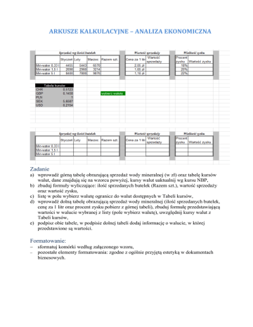 ARKUSZE KALKULACYJNE – ANALIZA EKONOMICZNA Zadanie a) wprowadź górną tabelę obrazującą sprzedaż wody mineralnej (w zł) oraz tabelę kursów walut, dane znajdują się na wzorcu powyżej, kursy walut uaktualnij wg kursu NBP, b) zbuduj formuły wyliczające: ilość sprzedanych butelek (Razem szt.), wartość sprzedaży oraz wartość zysku, c) listę w polu wybierz walutę ogranicz do walut dostępnych w Tabeli kursów, d) wprowadź dolną tabelę obrazującą sprzedaż wody mineralnej (ilość sprzedanych butelek, cenę za 1 litr oraz procent zysku pobierz z górnej tabeli), zbuduj formułę przedstawiającą wartości w walucie wybranej z listy (pole wybierz walutę), uwzględnij kursy walut z Tabeli kursów, e) podpisz obie tabele, w podpisie dolnej tabeli dodaj informację o walucie, w której przedstawione są wartości. Formatowanie: sformatuj komórki według załączonego wzoru, pozostałe elementy formatowania: zgodne z ogólnie przyjętą estetyką w dokumentach biznesowych.