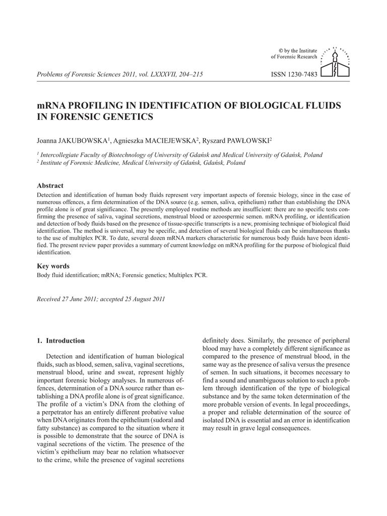 Problems of Forensic Sciences 2011, vol. LXXXVII, 204–215 mRNA profiling in identification of biological fluids in forensic genetics Joanna Jakubowska1, Agnieszka Maciejewska2, Ryszard Pawłowski2 Intercollegiate Faculty of Biotechnology of University of Gdańsk and Medical University of Gdańsk, Poland Institute of Forensic Medicine, Medical University of Gdańsk, Gdańsk, Poland 1 2 Abstract Detection and identification of human body fluids represent very important aspects of forensic biology, since in the case of numerous offences, a firm determination of the DNA source (e.g. semen, saliva, epithelium) rather than establishing the DNA profile alone is of great significance. The presently employed routine methods are insufficient: there are no specific tests confirming the presence of saliva, vaginal secretions, menstrual blood or azoospermic semen. mRNA profiling, or identification and detection of body fluids based on the presence of tissue-specific transcripts is a new, promising technique of biological fluid identification. The method is universal, may be specific, and detection of several biological fluids can be simultaneous thanks to the use of multiplex PCR. To date, several dozen mRNA markers characteristic for numerous body fluids have been identified. The present review paper provides a summary of current knowledge on mRNA profiling for the purpose of biological fluid identification. Key words Body fluid identification; mRNA; Forensic genetics; Multiplex PCR. Received 27 June 2011; accepted 25 August 2011 1. Introduction Detection and identification of human biological fluids, such as blood, semen, saliva, vaginal secretions, menstrual blood, urine and sweat, represent highly important forensic biology analyses. In numerous offences, determination of a DNA source rather than establishing a DNA profile alone is of great significance. The profile of a victim’s DNA from the clothing of a perpetrator has an entirely different probative value when DNA originates from the epithelium (sudoral and fatty substance) as compared to the situation where it is possible to demonstrate that the source of DNA is vaginal secretions of the victim. The presence of the victim’s epithelium may bear no relation whatsoever to the crime, while the presence of vaginal secretions definitely does. Similarly, the presence of peripheral blood may have a completely different significance as compared to the presence of menstrual blood, in the same way as the presence of saliva versus the presence of semen. In such situations, it becomes necessary to find a sound and unambiguous solution to such a problem through identification of the type of biological substance and by the same token determination of the more probable version of events. In legal proceedings, a proper and reliable determination of the source of isolated DNA is essential and an error in identification may result in grave legal consequences. mRNA profiling in identification of biological fluids in forensic genetics 2. Methods of biological fluid identification Numerous tests, both preliminary and specific, are employed in identification of particular biological fluids. Unfortunately, specific detection is possible solely for blood and semen. Identification of blood is based on immunochromatographic assays with antihemoglobin A or anti-glycophorin A monoclonal antibodies (e.g. HemCheck, Hexagon Obti Test, RSIDBlood), microscopy, spectrometric tests, and previously microcrystalline tests. The most reliable method of semen identification is sperm cell visualization; immunochromatic tests detecting the presence of semenogelin (RSID-Semen) and prostate-specific antigen (PSA) (e.g. Hexagon PSA, OneStep ABAcard) are also popular. PSA tests, however, are not fully specific in view of the presence of small amounts of the protein in biological fluids other than semen [26, 30]. On the other hand, we lack specific tests confirming the presence of saliva, vaginal secretions, menstrual blood and azoospermic semen, the latter being increasingly common in males. Only preliminary (non-specific) tests are employed, such as tests detecting salivary amylase activity or presence (e.g. Phadebas, RSID-Saliva) and periodic acid Schiff (PAS) staining for detection of vaginal secretion and the presence of glycogen-rich cells [26, 30]. The presently employed methods of identification of human biological fluids are insufficient not only in view of their frequent lack of specificity, but also in the aspect of the high sensitivity of methods of DNA amplification. No universal method is available that would identify various biological fluids. Another problem is the destructive character of numerous preliminary tests, especially when the amount of evidentiary material is scant [9, 10]. Investigations carried out over the past few years have resulted in considerable progress in identification of biological fluids. Of particular interest is a detection technique based on the presence in biological evidence of mRNA molecules specific for given tissues. The paper is focused on this issue, aiming at systematizing and summing up the present body of knowledge. 3. Messenger RNA and procedures employed in mRNA analysis mRNA (messenger ribonucleic acid) is a single strand nucleic acid involved in transcription and translation processes. It provides a matrix for protein synthesis. A typical mammalian cell contains 10–30 pg of total RNA, of which only 1–5% is mRNA. A single cell 205 contains approximately 360,000 mRNA molecules, which constitute 12,000 different transcripts that differ in their percentage representation in the general mRNA pool. While DNA is identical in each cell of an organism, the mRNA profile demonstrates what genes are expressed and what proteins are synthesized [1]. The method of biological fluid identification through mRNA profiling takes advantage of the fact that cells present in various biological fluids show specific patterns of gene expression and
