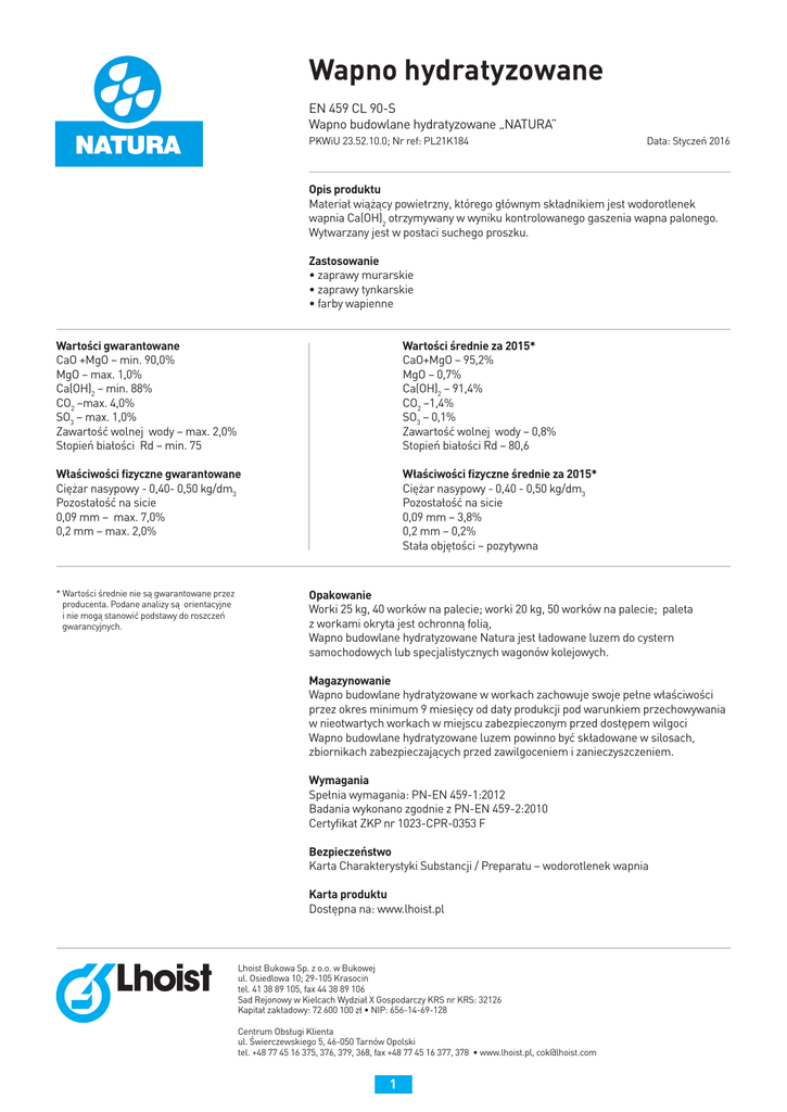 Wapno hydratyzowane EN 459 CL 90-S Wapno budowlane hydratyzowane „NATURA” PKWiU 23.52.10.0; Nr ref: PL21K184 Data: Styczeń 2016 Opis produktu Materiał wiążący powietrzny, którego głównym składnikiem jest wodorotlenek wapnia Ca(OH)2 otrzymywany w wyniku kontrolowanego gaszenia wapna palonego. Wytwarzany jest w postaci suchego proszku. Zastosowanie • zaprawy murarskie • zaprawy tynkarskie • farby wapienne Wartości gwarantowane CaO +MgO – min. 90,0% MgO – max. 1,0% Ca(OH)2 – min. 88% CO2 –max. 4,0% SO3 – max. 1,0% Zawartość wolnej wody – max. 2,0% Stopień białości Rd – min. 75 Wartości średnie za 2015* CaO+MgO – 95,2% MgO – 0,7% Ca(OH)2 – 91,4% CO2 –1,4% SO3 – 0,1% Zawartość wolnej wody – 0,8% Stopień białości Rd – 80,6 Właściwości fizyczne gwarantowane Ciężar nasypowy - 0,40- 0,50 kg/dm3 Pozostałość na sicie 0,09 mm – max. 7,0% 0,2 mm – max. 2,0% Właściwości fizyczne średnie za 2015* Ciężar nasypowy - 0,40 - 0,50 kg/dm3 Pozostałość na sicie 0,09 mm – 3,8% 0,2 mm – 0,2% Stała objętości – pozytywna * Wartości średnie nie są gwarantowane przez producenta. Podane analizy są orientacyjne i nie mogą stanowić podstawy do roszczeń gwarancyjnych. Opakowanie Worki 25 kg, 40 worków na palecie; worki 20 kg, 50 worków na palecie; paleta z workami okryta jest ochronną folią, Wapno budowlane hydratyzowane Natura jest ładowane luzem do cystern samochodowych lub specjalistycznych wagonów kolejowych. Magazynowanie Wapno budowlane hydratyzowane w workach zachowuje swoje pełne właściwości przez okres minimum 9 miesięcy od daty produkcji pod warunkiem przechowywania w nieotwartych workach w miejscu zabezpieczonym przed dostępem wilgoci Wapno budowlane hydratyzowane luzem powinno być składowane w silosach, zbiornikach zabezpieczających przed zawilgoceniem i zanieczyszczeniem. Wymagania Spełnia wymagania: PN-EN 459-1:2012 Badania wykonano zgodnie z PN-EN 459-2:2010 Certyfikat ZKP nr 1023-CPR-0353 F Bezpieczeństwo Karta Charakterystyki Substancji / Preparatu – wodorotlenek wapnia Karta produktu Dostępna na: www.lhoist.pl Lhoist Bukowa Sp. z o.o. w Bukowej ul. Osiedlowa 10; 29-105 Krasocin tel. 41 38 89 105, fax 44 38 89 106 Sad Rejonowy w Kielcach Wydział X Gospodarczy KRS nr KRS: 32126 Kapitał zakładowy: 72 600 100 zł • NIP: 656-14-69-128 Centrum Obsługi Klienta ul. Świerczewskiego 5, 46-050 Tarnów Opolski tel. +48 77 45 16 375, 376, 379, 368, fax +48 77 45 16 377, 378 • www.lhoist.pl, [email protected] 1 Wapno hydratyzowane Wapno hydratyzowane EN 459 CL 90-S EN 459 CL 90-S Wapno budowlane hydratyzowane „NATURA” Wapno budowlane hydratyzowane „NATURA” PKWiU 23.52.10.0; Nr ref:NrPL21K184 2016 Wapno hydratyzowane EN 459 Data: CLStyczeń 90-S PKWiU 23.52.10.0; ref: PL21K184 Wapno hydratyzowane EN 459 CL 90-S Data: Styczeń 2016 Wapno budowlane hydratyzowane „BIAŁE” Wapno budowlane hydratyzowane „BIAŁE” PKWiU Nr ref: PL21K185 Rola23.52.10.0; wapna w zaprawach PKWiU 23.52.10.0; PL21K185 Data: Styczeń 2016 Nr ref: poprawia Wapno hydratyzowane urabialność zaprawy, a w konstrukcji murowej Data: Styczeń 2016 Rola wapna w zaprawach nadaje jej większą elastyczność i przyczepność do materiałów ściennych. Poprzez Wapno hydratyzowane poprawia urabialność zaprawy, a w produktem konstrukcji do murowej swoje parametry wapno budowlane Natura jest uniwersalnym zapraw nadaje jej większą elastyczność i przyczepność do materiałów ściennych. Poprzez murarskich i tynkarskich. swoje parametry budowlane Natura jest uniwersalnym produktem do zapraw Rola wapna Białego wwapno zaprawach murarskich i tynkarskich. Najważniejszym zaprawyurabialność murarskiej jest jej przyczepność do podłoża. Rola •wapna Białego wparametrem zaprawach Wapno hydratyzowane Białe poprawia zaprawy, a w konstrukcji Zaprawa przyczepiająca się do elementu murowego na całej jego powierzchni Wapno hydratyzowane Białe poprawiai przyczepność urabialność zaprawy, a wściennych. konstrukcji murowej nadaje jej większą elastyczność do materiałów uzyskanieparametrem szczelnego połączenia murarskiego. jej przyczepność do zapewnia Najważniejszym zaprawy murarskiej Wodożądność murowej nadaje jej większą elastyczność i przyczepność do jest materiałów ściennych. podłoża. Zaprawa przyczepiająca się do elementu murowego na całej jego Wapno Białe wytwarzane na bazie wyselekcjonowanego kamienia Retencja Stopień W zaprawach hydratyzowane Naturawapiennego ma powierzchnicementowo-wapiennych, zapewnia uzyskaniewapno szczelnego połączenia murarskiego. wody białości dzięki Wapno Białe wytwarzane na bazie wyselekcjonowanego kamienia wapiennego starannemu procesowi wypału i hydratacji ma wysoki stopień białości najmniejsze, co do wielkości, cząsteczki. Wypełnia ono hydratyzowane wszelkie pory i nierówności W zaprawach cementowo-wapiennych, wapno Natura Rd ma dzięki starannemu procesowi wypału i hydratacji ma wysoki stopień białości Rd i oraz podwyższoną zawartość CaO znacznie przekraczającą wymagania określone w podłożu, na które jest zaprawa murarska. Dzięki ono temuwszelkie uzyskuje się najmniejsze, co kładziona do wielkości, cząsteczki. Wypełnia pory oraz podwyższoną CaO znacznie przekraczającą wymagania określone normą PN-EN 459-1 wysoce szczelne połączenia murarskie, charakteryzujące się wysoką trwałością nierówności wzawartość podłożu, na które kładziona jest zaprawa murarska. Dzięki temu Elastyczność Urabilaność normą PN-EN 459-1 Jednymi zkilkaset ważniejszych parametrów zaprawy murarskiej jest jej urabialność i (nawet uzyskuje się lat). wysoce szczelne połączenia murarskie, charakteryzujące się wysoką retencja Jednymi z ważniejszych parametrów zaprawy murarskiej jest jej urabialność i wody. trwałością (nawet kilkaset lat). • Zaprawy i tynkarskie Natura retencja wody.murarskie Dzięki odpow