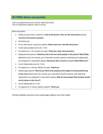 W CYRKU (karta nauczyciela) Czas na przygotowanie przez ucznia: około pół minuty Czas na wykonanie zadania: około 3 minuty Rola nauczyciela Podaj uczniowi kartę z zadaniem: Look at this picture. Here are the instructions (wskaż). You have 30 seconds to prepare. Kontroluj czas. Po ok. pół minuty, rozpocznij zadanie: Please start now. Describe the picture. Uczeń opisuje zdjęcie przez ok. 1 min. Po upływie ok. 1 min zakończ tę część: Thank you. Now some questions. Zadaj pierwsze pytanie: Would you like to be one of the people in the picture? Why?/Why not? (jeśli uczeń nie rozumie, po 5 sekundach powtórz pytanie, jeśli dalej brak odpowiedzi, po następnych 5 sekundach zapytaj: Would you like to work in a circus? Why?/Why not?) Uczeń odpowiada przez ok. 1 min. Po upływie ok. 1 minuty zakończ tę część: Thank you. Zadaj drugie pytanie: Why do you think some people protest against animals performing in the circus? (jeśli uczeń nie rozumie, po 5 sekundach powtórz pytanie, jeśli dalej brak odpowiedzi, po następnych 5 sekundach zapytaj: Why do some people think animals should not be shown in the circus?) Uczeń odpowiada ok. 1 min. Po upływie ok. 1 minuty zakończ zadanie: Thank you. Poniżej znajduje się karta ucznia zawierająca zdjęcie oraz treść zadań. W CYRKU (karta ucznia) Masz 30 sekund na przygotowanie się do tego zadania. Zapoznaj się z przedstawionym zdjęciem. Zadanie 1. Opisz zdjęcie (na przykład miejsce, osoby, czynności). Zadanie 2. Odpowiedz na dwa pytania, które zada Ci nauczyciel. http://www.flickr.com/photos/aellinger/3015752732/