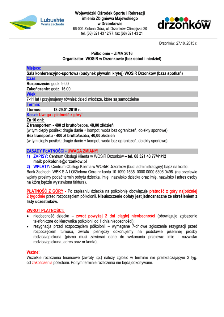 Wojewódzki Ośrodek Sportu i Rekreacji imienia Zbigniewa Majewskiego w Drzonkowie 66-004 Zielona Góra, ul. Drzonków-Olimpijska 20 tel. (68) 321 43 12/77, fax (68) 321 43 21 Drzonków, 27.10..2015 r. Półkolonie – ZIMA 2016 Organizator: WOSiR w Drzonkowie (bez sobót i niedziel) Miejsce: Sala konferencyjno-sportowa (budynek pływalni krytej) WOSiR Drzonków (baza spotkań) Czas: Rozpoczęcie: godz. 9.00 Zakończenie: godz. 15.00 Wiek: 7-11 lat / przyjmujemy również dzieci młodsze, które są samodzielne Termin: I turnus: 18-29.01.2016 r. Koszt: Uwaga - płatność z góry! Za 10 dni: Z transportem - 480 zł brutto/osoba, 48,00 zł/dzień (w tym ciepły posiłek: drugie danie + kompot, woda bez ograniczeń, obiekty sportowe) Bez transportu - 400 zł brutto/osoba, 40,00 zł/dzień (w tym ciepły posiłek: drugie danie + kompot, woda bez ograniczeń, obiekty sportowe) ZASADY PŁATNOŚCI - UWAGA ZMIANY! 1) ZAPISY: Centrum Obsługi Klienta w WOSiR Drzonków – tel. 68 321 43 77/41/12 mail: [email protected] 2) WPŁATY: Centrum Obsługi Klienta w WOSiR Drzonków (bud. administracyjny) bądź na konto: Bank Zachodni WBK S.A I O/Zielona Góra nr konta 10 1090 1535 0000 0000 5306 0498 (na przelewie wpłaty prosimy podać termin pobytu dziecka, imię i nazwisko dziecka oraz imię, nazwisko i adres osoby na którą będzie wystawiona faktura). PŁATNOŚĆ Z GÓRY - Po zapisaniu dziecka na półkolonię obowiązuje płatność z góry najpóźniej 2 tygodnie przed rozpoczęciem półkolonii. Nieuiszczenie opłaty jest jednoznaczne ze skreśleniem z listy uczestników. ZWROT PŁATNOŚCI: nieobecność dziecka – zwrot powyżej 2 dni ciągłej nieobecności (obowiązuje zgłoszenie telefoniczne do kierownika półkolonii od 1 dnia nieobecności); rezygnacja przed rozpoczęciem półkolonii – wymagane 7-dniowe zgłoszenie rezygnacji przed rozpoczęciem turnusu, zwrotu pieniędzy dokonujemy na podstawie pisemnej prośby rodzica/opiekuna (pismo musi zawierać dane do wykonania przelewu: imię i nazwisko rodzica/opiekuna, adres oraz nr konta); Ważne! Wszelkie rozliczenia finansowe (zwroty itp.) należy zgłosić w terminie nie przekraczającym 2 tyg. od zakończenia półkolonii. Po tym terminie rozliczenia nie będą dokonywane. OPIS PÓŁKOLONII: Dzieci uczestniczą w takich zajęciach jak: pływalnia kryta codziennie podstawy szermierki 8 razy w trakcie turnusu strzelanie 6 razy w trakcie turnusu jazda konna (prowadzanie) 8 razy w trakcie turnusu gry i zabawy na sali konferencyjno-sportowej codziennie nauka tenisa ziemnego 6 razy w trakcie turnusu + drugie danie obiadowe + kompot + woda mineralna bez ograniczeń SPOTKANIE ORGANIZACYJNE - Pierwszego dnia turnusu! rodzice przywożą dzieci własnym transportem, WOSiR zapewnia powrót do Zielonej Góry spotkanie z rodzicami godz. 9.00 (pierwszy dzień turnusu) / sala konferencyjno-sportowa (budynek pływalni krytej) RODZIC MA OBOWIĄZEK PRZYNIEŚĆ UZUPEŁNIONĄ KARTĘ KWALIFIKACYJNĄ DZIECKA Z PODPISANĄ ZGODĄ NA PRZETWARZANIE DANYCH OSOBOWYCH. KARTĘ MOŻNA POBRAĆ ZE STRONY INTERNETOWEJ: www.drzonkow.pl LUB UZUPEŁNIĆ NA SALI KONFERENCYJNOSPORTOWEJ W DNIU SPOTKANIA. Co dzieci powinny mieć: strój kąpielowy/kąpielówki, ręcznik, klapki zmienne obuwie sportowe, najlepiej z białą podeszwą strój sportowy/dresy, koszulkę na przebranie opcjonalnie: II śniadanie/suchy prowiant dobry humor Organizator zaleca nie przynosić na półkolonie cennych przedmiotów, np. telefonów komórkowych, odtwarzaczy muzyki itp. Organizator nie odpowiada za rzeczy zagubione/zniszczone. Osoby prowadzące zajęcia z dziećmi: ilość prowadzących uzależniona jest od ilości zgłoszeń - 1 opiekun / 15 dzieci instruktorzy strzelania, jazdy konnej, tenisa ziemnego, szermierki oraz ratownik wodny
