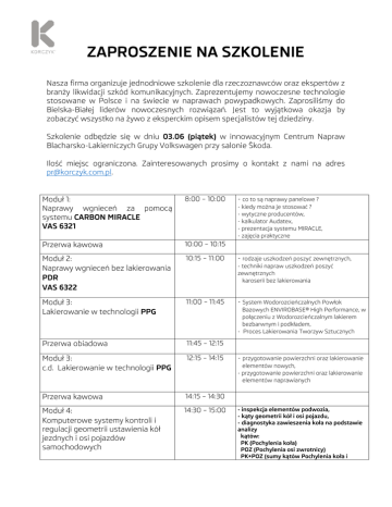 ZAPROSZENIE NA SZKOLENIE Nasza firma organizuje jednodniowe szkolenie dla rzeczoznawców oraz ekspertów z branży likwidacji szkód komunikacyjnych. Zaprezentujemy nowoczesne technologie stosowane w Polsce i na świecie w naprawach powypadkowych. Zaprosiliśmy do Bielska-Białej liderów nowoczesnych rozwiązań. Jest to wyjątkowa okazja by zobaczyć wszystko na żywo z eksperckim opisem specjalistów tej dziedziny. Szkolenie odbędzie się w dniu 03.06 (piątek) w innowacyjnym Centrum Napraw Blacharsko-Lakierniczych Grupy Volkswagen przy salonie Škoda. Ilość miejsc ograniczona. Zainteresowanych prosimy o kontakt z nami na adres [email protected]. Moduł 1: Naprawy wgnieceń za pomocą systemu CARBON MIRACLE VAS 6321 8:00 – 10:00 Przerwa kawowa 10:00 – 10:15 Moduł 2: Naprawy wgnieceń bez lakierowania PDR VAS 6322 10:15 – 11:00 Moduł 3: Lakierowanie w technologii PPG 11:00 – 11:45 Przerwa obiadowa 11:45 – 12:15 Moduł 3: c.d. Lakierowanie w technologii PPG 12:15 – 14:15 Przerwa kawowa 14:15 – 14:30 Moduł 4: Komputerowe systemy kontroli i regulacji geometrii ustawienia kół jezdnych i osi pojazdów samochodowych 14:30 – 15:00 - co to są naprawy panelowe ? - kiedy można je stosować ? - wytyczne producentów, - kalkulator Audatex, - prezentacja systemu MIRACLE, - zajęcia praktyczne - rodzaje uszkodzeń poszyć zewnętrznych, - techniki napraw uszkodzeń poszyć zewnętrznych karoserii bez lakierowania - System Wodorozcieńczalnych Powłok Bazowych ENVIROBASE® High Performance, w połączeniu z Wodorozcieńczalnym lakierem bezbarwnym i podkładem, - Proces Lakierowania Tworzyw Sztucznych - przygotowanie powierzchni oraz lakierowanie elementów nowych, - przygotowanie powierzchni oraz lakierowanie elementów naprawianych - inspekcja elementów podwozia, - kąty geometrii kół i osi pojazdu, - diagnostyka zawieszenia koła na podstawie analizy kątów: PK (Pochylenia koła) POZ (Pochylenia osi zwrotnicy) PK+POZ (sumy kątów Pochylenia koła i HUNTER WA/WQ 360 Pochylenia osi zwrotnicy), - wymagania dla stanowisk do pomiaru geometrii kół i osi, - podstawowe warunki prawidłowego pomiaru geometrii, - ściąganie boczne pojazdu i jego przyczyny, - pomiar geometrii samochodu na stanowisku z wykorzystaniem bazy danych regulacyjnych, - pomiar prześwitów, - interpretacja pierwotnych wyników pomiarów, - wydruk wyników pomiarów i ich interpretacja, VAS 6292 Moduł 4: c.d. -zerowanie czujnika kąta skrętu kierownicy SAS (CodeLink). Moduł 5: Komputerowy System Pomiaru wibracji koła HUNTER RFT 00 E VAS 6230B 15:00 – 15:30 - wyważanie statyczne, - wyważanie dynamiczne, - wyważanie z wykorzystaniem funkcji „Road Force”, - program SmartWeight®, -opcja ukrywania ciężarków Split Spoke® - pomiar sztywności opony – RFT, - pomiar siły bocznej koła – LFM, - pomiar bicia obręczy, - ekran „Wyjaśnienie Diagnozy” oraz „Szczegóły” Moduł 6: Systemy ACC VAS 6430 15:30 – 16:00 - co to są systemy ACC, - w jakie systemy wspomagające kierowcę wyposażone są współczesne samochody, - kiedy musimy kalibrować systemy ACC, - kalibracja systemu ACC na stanowisku Podczas szkolenia przedstawione zostaną techniki napraw a także kryteria graniczne a więc możliwości stosowania tych technik przy naprawie pojazdów w serwisach, zgodnie z technologią koncernu Volkswagen. Każdy z uczestników szkolenia otrzyma certyfikat potwierdzający zapoznanie się przedstawionymi zagadnieniami technicznymi. Dla uczestników będzie serwowany catering. miejsce szkolenia: Aleja gen. Andersa 586 , Bielsko-Biała Centrum Napraw Blacharsko-Lakierniczych (obok salonu Škoda KORCZYK) Kontakt: +48 604 933 830, www.korczyk.com.pl Serdecznie zapraszamy! Tomasz Nitoń, Dyrektor ds. Dyrektor ds. Techniki i Rozwoju
