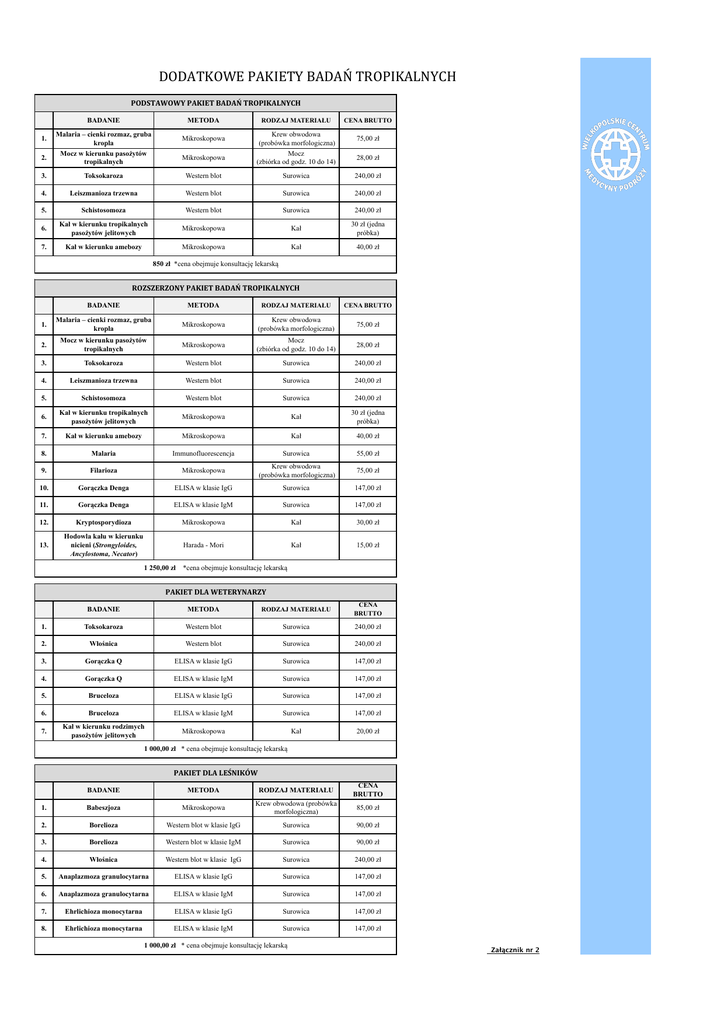 DODATKOWE PAKIETY BADAŃ TROPIKALNYCH PODSTAWOWY PAKIET BADAŃ TROPIKALNYCH BADANIE 1. 2. METODA Malaria – cienki rozmaz, gruba kropla Mocz w kierunku pasożytów tropikalnych Mikroskopowa Mikroskopowa RODZAJ MATERIAŁU Krew obwodowa (probówka morfologiczna) Mocz (zbiórka od godz. 10 do 14) CENA BRUTTO 75,00 zł 28,00 zł 3. Toksokaroza Western blot Surowica 240,00 zł 4. Leiszmanioza trzewna Western blot Surowica 240,00 zł 5. Schistosomoza Western blot Surowica 240,00 zł 6. Kał w kierunku tropikalnych pasożytów jelitowych Mikroskopowa Kał 30 zł (jedna próbka) 7. Kał w kierunku amebozy Mikroskopowa Kał 40,00 zł 850 zł *cena obejmuje konsultację lekarską ROZSZERZONY PAKIET BADAŃ TROPIKALNYCH BADANIE METODA RODZAJ MATERIAŁU CENA BRUTTO 75,00 zł 1. Malaria – cienki rozmaz, gruba kropla Mikroskopowa Krew obwodowa (probówka morfologiczna) 2. Mocz w kierunku pasożytów tropikalnych Mikroskopowa Mocz (zbiórka od godz. 10 do 14) 28,00 zł 3. Toksokaroza Western blot Surowica 240,00 zł 4. Leiszmanioza trzewna Western blot Surowica 240,00 zł 5. Schistosomoza Western blot Surowica 240,00 zł 6. Kał w kierunku tropikalnych pasożytów jelitowych Kał 30 zł (jedna próbka) 7. Kał w kierunku amebozy Mikroskopowa Kał 40,00 zł 8. Malaria Immunofluorescencja Surowica 55,00 zł 75,00 zł Mikroskopowa 9. Filarioza Mikroskopowa Krew obwodowa (probówka morfologiczna) 10. Gorączka Denga ELISA w klasie IgG Surowica 147,00 zł 11. Gorączka Denga ELISA w klasie IgM Surowica 147,00 zł 12. Kryptosporydioza Mikroskopowa Kał 30,00 zł 13. Hodowla kału w kierunku nicieni (Strongyloides, Ancylostoma, Necator) Harada - Mori Kał 15,00 zł 1 250,00 zł *cena obejmuje konsultację lekarską PAKIET DLA WETERYNARZY BADANIE METODA RODZAJ MATERIAŁU CENA BRUTTO 1. Toksokaroza Western blot Surowica 240,00 zł 2. Włośnica Western blot Surowica 240,00 zł 3. Gorączka Q ELISA w klasie IgG Surowica 147,00 zł 4. Gorączka Q ELISA w klasie IgM Surowica 147,00 zł 5. Bruceloza ELISA w klasie IgG Surowica 147,00 zł 6. Bruceloza ELISA w klasie IgM Surowica 147,00 zł 7. Kał w kierunku rodzimych pasożytów jelitowych Mikroskopowa Kał 20,00 zł METODA RODZAJ MATERIAŁU CENA BRUTTO Mikroskopowa Krew obwodowa (probówka morfologiczna) 85,00 zł 1 000,00 zł * cena obejmuje konsultację lekarską PAKIET DLA LEŚNIKÓW BADANIE 1. Babeszjoza 2. Borelioza Western blot w klasie IgG Surowica 90,00 zł 3. Borelioza Western blot w klasie IgM Surowica 90,00 zł 4. Włośnica Western blot w klasie IgG Surowica 240,00 zł 5. Anaplazmoza granulocytarna ELISA w klasie IgG Surowica 147,00 zł 6. Anaplazmoza granulocytarna ELISA w klasie IgM Surowica 147,00 zł 7. Ehrlichioza monocytarna ELISA w klasie IgG Surowica 147,00 zł 8. Ehrlichioza monocytarna ELISA w klasie IgM Surowica 147,00 zł 1 000,00 zł * cena obejmuje konsultację lekarską Załącznik nr 2