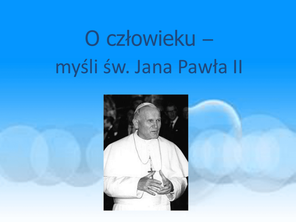 O człowieku – myśli św. Jana Pawła II Człowiek jest wielki nie przez to, co posiada, lecz przez to, kim jest; nie przez to, co ma, lecz przez to, czym dzieli się z innymi Źródło: przemówienie do mieszkańców Tondo, dzielnicy slumsów. Manila, 18 lutego 1981 Człowiek nie jest tylko sprawcą swoich czynów, ale przez te czyny jest zarazem w jakiś sposób „twórcą siebie samego” Źródło: homilia Jana Pawła II wygłoszona podczas mszy św. na placu Zwycięstwa, Warszawa, 2 czerwca 1979 Człowieka trzeba mierzyć miarą serca – sercem Źródło: http://pl.wikiquote.org/wiki/Jan_Paweł_II Źródło: http://commons.wikimedia.org Człowiek szuka miłości, bo w głębi serca wie, że tylko miłość może uczynić go szczęśliwym Źródło: Homilia w czasie mszy św., Sopot, 5 czerwca 1999 Jest w ciele ludzkim zdolność wyrażania miłości, tej miłości, w której człowiek staje się darem Źródło: http://pl.wikiquote.org/wiki/Jan_Paweł_II Nie można żyć tylko na próbę, nie można umierać tylko na próbę. Nie można kochać tylko na próbę, przyjmować tylko na próbę i na czas człowieka Źródło: homilia w czasie mszy św. Królestwo Boże i rodzina chrześcijańska, Kolonia, 15 listopada 1980 Człowiek rodzi się, kocha i umiera nie na próbę Źródło: http://pl.wikiquote.org/wiki/Jan_Paweł_II Źródło: http://pl.wikipedia.org/wiki/Jan_Paweł_II Prawo do życia nie jest tylko kwestią światopoglądu, nie jest tylko prawem religijnym, ale jest prawem człowieka Źródło: Kalisz, 4 czerwca 1997 Różnymi drogami biegnie życie ludzkie, ale wszyscy szukają szczęścia i miłości Źródło: http://pl.wikiquote.org/wiki/Jan_Paweł_II Wczoraj do ciebie nie należy. Jutro niepewne… Tylko dziś jest twoje Źródło: http://pl.wikiquote.org/wiki/Jan_Paweł_II Źródło: http://tomek3618.deviantart.com Za to, co się we mnie dzieje, najczęściej nie jestem odpowiedzialny, ale ponoszę odpowiedzialność za to, co z tym zrobię Źródło: o. Joachim Badeni OP, Sekrety mnichów czyli sprawdzone przepisy na szczęśliwe życie, Rafael, Kraków 2007, s. 61.