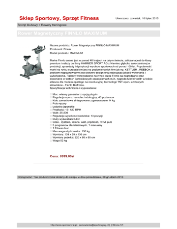 Sklep Sportowy, Sprzęt Fitness Utworzono: czwartek, 16 lipiec 2015 Sprzęt klubowy > Rowery treningowe Rower Magnetyczny FINNLO MAXIMUM Nazwa produktu: Rower Magnetyczny FINNLO MAXIMUM Producent: Finnlo Model produktu: MAXIMUM Marka Finnlo znana jest w ponad 40 krajach na całym świecie, zaliczana jest do klasy premium i należy do firmy HAMMER SPORT AG z Niemiec głęboko zakorzenionej w produkcji, sprzedaży i dystrybucji wyrobow sportowych od ponad 100 lat. Popularność marki na rynku europejskim jest na poziomie takich firm jak np. KETTLER , REEBOK a znakiem rozpoznawczym jest ciekawy design oraz najwyższa jakość wykonania i wykończenia. Patenty wprowadzane na rynek przez Finnlo są nagradzane oraz doceniane w testach i prestiżowych czasopismach m.in. nagroda Men'sHealth w teście atlasow dla modelu opartego na rewolucyjnej technologii TNT oporu azotowych siłownikow - Finnlo BioForce. Specyfikacja techniczna i wyposażenie: Moc: własny generator z opcją plug-in Regulacja oporu: hamulec indukcyjny, 40 poziomow Koło zamachowe zintegrowane z generatorem 14 kg Puls ręczny Łożyska japońskie Prędkość: 15- 120 RPM Watt: 25-200 Regulacja wysokości siedziska: 13 pozycji Duży wyświetlacz LED Czas , dystans, kalorie, watt, prędkość, RPM, puls 5 programow standardowych, 1 manualny 1 Fitness test Max.waga użytkownika: 150 kg Wymiary: 108 x 55 x 136 cm Wymiary pudełka: 220 x 95 x 50 cm Waga 52 kg Cena: 6999.00zł Dostępność: Ten produkt został dodany do sklepu w dniu poniedziałek, 09 grudzień 2013 http://www.sportowyraj.pl | [email protected] | | Strona 1/1