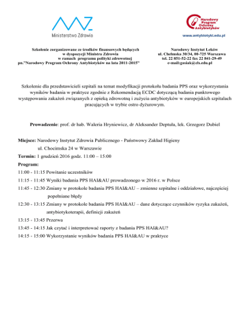 Szkolenie zorganizowane ze środków finansowych będących w dyspozycji Ministra Zdrowia w ramach programu polityki zdrowotnej pn.”Narodowy Program Ochrony Antybiotyków na lata 2011-2015” Narodowy Instytut Leków ul. Chełmska 30/34, 00-725 Warszawa tel. 22 851-52-22 fax 22 841-29-49 e-mail:[email protected] Szkolenie dla przedstawicieli szpitali na temat modyfikacji protokołu badania PPS oraz wykorzystania wyników badania w praktyce zgodnie z Rekomendacją ECDC dotyczącą badania punktowego występowania zakażeń związanych z opieką zdrowotną i zużycia antybiotyków w europejskich szpitalach pracujących w trybie ostro dyżurowym. Prowadzenie: prof. dr hab. Waleria Hryniewicz, dr Aleksander Deptuła, lek. Grzegorz Dubiel Miejsce: Narodowy Instytut Zdrowia Publicznego - Państwowy Zakład Higieny ul. Chocimska 24 w Warszawie Termin: 1 grudzień 2016 godz. 11:00 – 15:00 Program: 11:00 - 11:15 Powitanie uczestników 11:15 - 11:45 Wyniki badania PPS HAI&AU prowadzonego w 2016 r. w Polsce 11:45 - 12:30 Zmiany w protokole badania PPS HAI&AU – zmienne szpitalne i oddziałowe, najczęściej popełniane błędy 12:30 - 13:15 Zmiany w protokole badania PPS HAI&AU – dane dotyczące czynników ryzyka zakażeń, antybiotykoterapii, definicji zakażeń 13:15 - 13:45 Przerwa 13:45 - 14:15 Jak czytać i interpretować raporty z badania PPS HAI&AU? 14:15 - 15:00 Wykorzystanie wyników badania PPS HAI&AU w praktyce