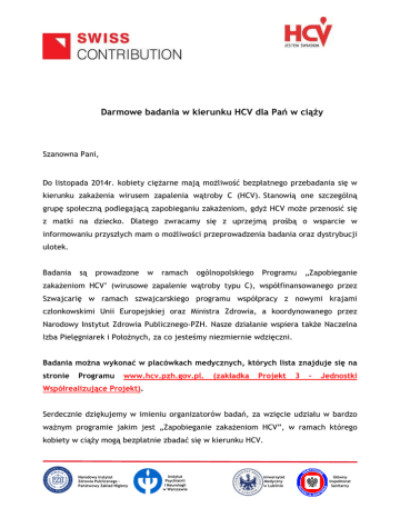 Darmowe badania w kierunku HCV dla Pań w ciąży Szanowna Pani, Do listopada 2014r. kobiety ciężarne mają możliwość bezpłatnego przebadania się w kierunku zakażenia wirusem zapalenia wątroby C (HCV). Stanowią one szczególną grupę społeczną podlegającą zapobieganiu zakażeniom, gdyż HCV może przenosić się z matki na dziecko. Dlatego zwracamy się z uprzejmą prośbą o wsparcie w informowaniu przyszłych mam o możliwości przeprowadzenia badania oraz dystrybucji ulotek. Badania są prowadzone w ramach ogólnopolskiego Programu „Zapobieganie zakażeniom HCV’ (wirusowe zapalenie wątroby typu C), współfinansowanego przez Szwajcarię w ramach szwajcarskiego programu współpracy z nowymi krajami członkowskimi Unii Europejskiej oraz Ministra Zdrowia, a koordynowanego przez Narodowy Instytut Zdrowia Publicznego-PZH. Nasze działanie wspiera także Naczelna Izba Pielęgniarek i Położnych, za co jesteśmy niezmiernie wdzięczni. Badania można wykonać w placówkach medycznych, których lista znajduje się na stronie Programu www.hcv.pzh.gov.pl. (zakładka Projekt 3 - Jednostki Współrealizujące Projekt). Serdecznie dziękujemy w imieniu organizatorów badań, za wzięcie udziału w bardzo ważnym programie jakim jest „Zapobieganie zakażeniom HCV”, w ramach którego kobiety w ciąży mogą bezpłatnie zbadać się w kierunku HCV. Instytut Psychiatrii I Neurologii w Warszawie Narodowy Instytut Zdrowia Publicznego – Państwowy Zakład Higieny Uniwersytet Medyczny w Lublinie Główny Inspektorat Sanitarny Dzięki wspólnemu zaangażowaniu się w pobieranie jak największej ilości próbek krwi i zbieranie danych o pacjentach, tworzymy podstawy do zaplanowania długofalowej strategii przeciwdziałania zakażeniom HCV i zwalczania wzw C w Polsce! Przyczyni się to do opracowania i przeprowadzenia programu edukacyjnego dla wszystkich Polaków, aby uświadomić jakim istotnym problemem są zakażenia HCV i co najważniejszej: jakie są zasady zapobiegania tym zakażeniom. Zapraszamy na stronę www.hcv.pzh.gov.pl. Z poważaniem, Zespół Projektu 3 Kontakt: Monika Wróbel-Harmas e-mail: [email protected] Tel. (22) 54 21 288 Narodowy Instytut Zdrowia Publicznego-PZH ul. Chocimska 24 00-791 Warszawa Instytut Psychiatrii I Neurologii w Warszawie Narodowy Instytut Zdrowia Publicznego – Państwowy Zakład Higieny Uniwersytet Medyczny w Lublinie Główny Inspektorat Sanitarny 28 lipca - Światowy Dzień Wirusowego Zapalenia Wątroby Zapraszamy Panie w ciąży na darmowe badania w kierunku HCV Na świecie Wirusowe zapalenie wątroby jest czwartą chorobą uznaną przez WHO (obok malarii, gruźlicy i HIV/AIDS), jako ta, która wymaga najwięcej uwagi i podejmowania działań edukacyjnych, mających na celu jak najszybsze podniesienia świadomości zdrowotnej społeczeństw. Ta cicha epidemia zbiera takie samo żniwo jak HIV/AIDS… W Polsce zaś realizowany jest Program „Zapobieganie zakażeniom HCV”, którego nadrzędnym celem jest edukacja, gdyż najskuteczniejszym sposobem przeciwdziałania szerzeniu się HCV jest świadome społeczeństwo. Bardzo ważnym elementem w podejmowaniu skutecznej walki z HCV są badania prowadzone w ramach ogólnopolskiego Programu „Zapobieganie zakażeniom HCV’ (wirusowe zapalenie wątroby typu C), współfinansowanego przez Szwajcarię w ramach szwajcarskiego programu współpracy z nowymi krajami członkowskimi Unii Europejskiej oraz Ministra Zdrowia, a koordynowanego przez Narodowy Instytut Zdrowia Publicznego-PZH. Szczególną grupą społeczną, do której kierowane są Instytut Psychiatrii I Neurologii w Warszawie Narodowy Instytut Zdrowia Publicznego – Państwowy Zakład Higieny Uniwersytet Medyczny w Lublinie Główny Inspektorat Sanitarny działania mające na celu ograniczenie szerzenia się HCV są kobiety w ciąży, gdyż wirus ten może przenosić się z matki na dziecko. Dlatego zapraszamy kobiety ciężarne do wykonania bezpłatnych badań w kierunku zakażenia wirusem zapalenia wątroby C (HCV). Badania będą realizowane do listopada 2014r. w placówkach medycznych, których aktualna lista znajduje się na stronie Programu www.hcv.pzh.gov.pl. (zakładka Projekt 3 - Jednostki Współrealizujące Projekt) (Lista miejsc, gdzie można się bezpłatnie przebadać, będzie sukcesywnie uzupełniana w miarę podpisywania kolejnych umów z podmiotami leczniczymi). Wczesne wykrycie zakażenia HCV istotnie zwiększa szansę matki na skuteczne wyleczenie, a tym samym na uniknięcie niekorzystnych następstw klinicznych, takich jak: marskość wątroby czy rak wątroby. Jako organizatorzy badań serdecznie dziękujemy szerokiemu gronu podmiotów wykonujących działalność leczniczą z całej Polski, za wzięcie udziału w bardzo ważnym programie jakim jest „Zapobieganie zakażeniom HCV”, w ramach którego kobiety w ciąży mogą bezpłatnie zbadać się w kierunku HCV. Dzięki wspólnemu zaangażowaniu się w pobieranie jak największej ilości próbek krwi i zbieranie danych o pacjentach, tworzymy podstawy do zaplanowania długofalowej strategii przeciwdziałania zakażeniom HCV i zwalczania wzw C w Polsce! Przyczyni się to do opracowania i przeprowadzenia programu edukacyjnego dla wszystkich Polaków, aby uświadomić jakim istotnym problemem są zakażenia HCV i co najważniejszej: jakie są zasady zapobiegania tym zakażeniom. Uczestnictwo w badaniach pozwoli także na: a. oszacowanie częstości występowania zakażeń HCV oraz wskazanie czynników ryzyka zakażenia tym wirusem na podstawie badań przeprowadzonych u kobiet w ciąży, Instytut Psychiatrii I Neurologii w Warszawie Narodowy Instytut Zdrowia Publicznego – Państwowy Zakład Higieny Uniwersytet Medyczny w Lublinie Główny Inspektorat Sanitarny b. zwiększenie wiedzy lekarzy ginekologów-położników oraz lekarzy rodzinnych na temat zapobiegania wertykalnej transmisji HCV oraz postępowania z dzieckiem matki zakażonej. O HCV: • Często chorzy
