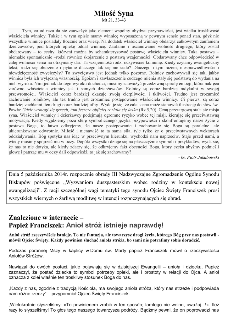 Miłość Syna Mt 21, 33-43 Tym, co od razu da się zauważyć jako element wspólny obydwu przypowieści, jest wielka troskliwość właściciela winnicy. Także i w tym opisie mamy winnicę wyposażoną w pewnym sensie ponad stan, gdyż nie wszystkie winnice posiadały tłocznie oraz wieżę. Na dodatek właściciel winnicy obdarzył całkowitym zaufaniem dzierżawców, pod których opiekę oddał winnicę. Zaufanie i uszanowanie wolność drugiego, który został obdarowany – to cechy, którymi można by scharakteryzować postawę właściciela winnicy. Taka postawa – niemalże spontanicznie –rodzi również skojarzenie z postawą wzajemności. Obdarowany chce odpowiedzieć w całej wolności serca na otrzymany dar. Ta wzajemność rodzi oczywiście komunię. Kiedy czytamy ewangeliczny tekst, rodzi się oburzenie i pytanie dlaczego tak się nie stało? Dlaczego i tym razem, niesprawiedliwości i niewdzięczność zwyciężyły? To zwycięstwo jest jednak tylko pozorne. Rolnicy zachowywali się tak, jakby winnica była ich wyłączną własnością. Egoizm i zawłaszczenie cudzego mienia stały się podstawą do wydania na nich wyroku. Nim jednak do tego wyroku dochodzi, musimy zauważyć przedziwną spiralę emocji, która nakręca zarówno właściciela winnicy jak i samych dzierżawców. Rolnicy są coraz bardziej radykalni w swojej przewrotności. Właściciel coraz bardziej okazuje swoją cierpliwości i tkliwości. Trudno jest zrozumieć zachowanie rolników, ale też trudno jest zrozumieć postępowanie właściciela winnicy. Ci pierwsi są coraz bardziej zachłanni, ten drugi coraz bardziej ufny. Wyda je się, że cała scena może stanowić ilustrację do słów św. Pawła: Gdzie wzmógł się grzech, tam jeszcze obficiej rozlała się łaska (Rz 5,20). Ceną przetargową stała się misja syna. Właściciel winnicy i dzierżawcy podejmują ogromne ryzyko wobec tej misji, kierując się przeciwstawną motywacją. Kiedy wyjdziemy poza sferę symbolicznego języka przypowieści i skonfrontujemy nasze życie z postawą Boga, to łatwo odkryjemy, że nasze postępowanie i zachowanie się Boga są paralelne, ale ukierunkowane odwrotnie. Miłość i nienawiść to ta sama siła, tyle tylko że o przeciwstawnych wektorach oddziaływania. Bóg spotyka nas idąc w przeciwnym kierunku, wychodzi nam naprzeciw. Staje przed nami, a wtedy musimy spojrzeć mu w oczy. Dopóki wszystko dzieje się na płaszczyźnie symboli i przykładów, wyda się, że nas to nie dotyka, ale kiedy zdarzy się, że odkryjemy fakt obecności Boga, który czeka abyśmy podnieśli głowę i patrząc mu w oczy dali odpowiedź, to jak się zachowamy? - ks. Piotr Jakubowski Dnia 5 października 2014r. rozpocznie obrady III Nadzwyczajne Zgromadzenie Ogólne Synodu Biskupów poświęcone „Wyzwaniom duszpasterskim wobec rodziny w kontekście nowej ewangelizacji”. Z racji szczególnej wagi tematyki tego synodu Ojciec Święty Franciszek prosi wszystkich wiernych o żarliwą modlitwę w intencji rozpoczynających się obrad. Znalezione w internecie – Papież Franciszek: Anioł stróż istnieje naprawdę! Anioł stróż rzeczywiście istnieje. To nie fantazja, ale towarzysz drogi życia, którego Bóg przy nas postawił mówił Ojciec Święty. Każdy powinien słuchać anioła stróża, bo sami nie potrafimy sobie doradzić. Podczas porannej Mszy w kaplicy w Domu św. Marty papież Franciszek mówił o rzeczywistości Aniołów Stróżów. Nawiązał do dwóch postaci, jakie pojawiają się w dzisiejszej Ewangelii – anioła i dziecka. Papież zaznaczył, że postać dziecka to symbol potrzeby opieki, ale i prostoty w relacji do Ojca. A anioł oznacza z kolei właśnie ten troskliwy stosunek Boga do nas. „Każdy z nas, zgodnie z tradycją Kościoła, ma swojego anioła stróża, który nas strzeże i podpowiada nam różne rzeczy” – przypomniał Ojciec Święty Franciszek. „Wielokrotnie słyszeliśmy: «To powinienem zrobić w ten sposób; tamtego nie wolno, uważaj...!». Ileż razy to słyszeliśmy! To głos tego naszego towarzysza podróży. Bądźmy pewni, że on poprowadzi nas aż do końca życia swoimi radami i dlatego nadstawiajmy ucha na ten głos, nie oponujmy. Bo bunt, wola niezależności to coś, co wszyscy mamy. To pycha, którą miał nasz praojciec Adam w ziemskim raju. To to samo. A więc nie sprzeciwiaj się; idź za jego wskazaniami” – kontynuował papież. Franciszek podkreślił, że anioła stróża nie można przeganiać z życia, bo sami nie jesteśmy sobie w stanie odpowiednio doradzić. Papież zaznaczył, że anioł stróż to żadna fantastyka – to rzeczywistość, którą musimy wziąć na poważnie. Franciszek przypomniał słowa z Księgi Wyjścia: „Oto Ja posyłam anioła przed tobą, aby cię strzegł w czasie twojej drogi i byś nie zbłądził”. Swoją homilię papież zakończył swoistym rachunkiem sumienia. „Postawię dzisiaj pytanie: Jakie mam relacje z moim aniołem stróżem? Czy słucham go? Czy mówię mu dzień dobry z rana? Czy mówię: «Strzeż mnie we śnie»? Czy rozmawiam z nim? Czy proszę o radę? On przecież stoi przy mnie. A na to pytanie może odpowiedzieć dzisiaj każdy z nas: jakie są relacje z tym aniołem, którego Pan posłał, by mnie strzegł i towarzyszył mi w drodze i który wpatruje się zawsze w oblicze Ojca, który jest w niebie” – powiedział papież Franciszek. bjad/radio watykańskie 2.10.2014, 18:28 http://www.fronda.pl/a/aniol-stroz-istnieje-naprawde,42334.html Dla wszystkich, którzy uważają się za „niewierzących”: http://blogoslawieni.blogspot.com/2013/12/ks-marek-dziewiecki-bog-policjant-czy.html KURS LEKTORSKI Duszpasterstwo Służby Liturgicznej naszej Archidiecezji organizuje w POZNANIU (w Arcybiskupim Seminarium Duchownym, ul. Wieżowa 2/4) kurs lektorski oraz psałterzysty dla ministrantów miasta Poznania oraz okolicznych dekanatów. Początek w niedzielę 12 października br. o godz. 1400. Z