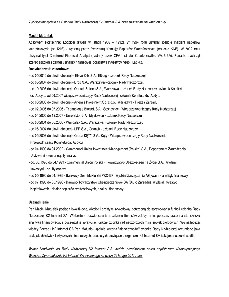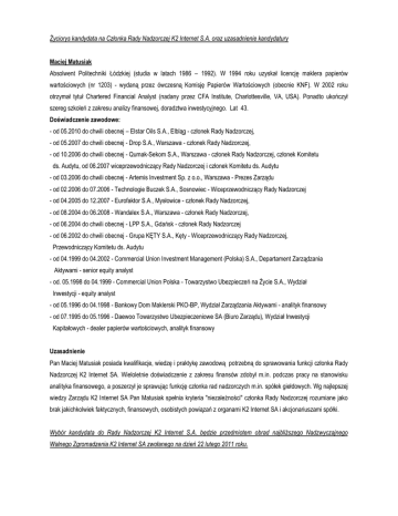 śyciorys kandydata na Członka Rady Nadzorczej K2 Internet S.A. oraz uzasadnienie kandydatury Maciej Matusiak Absolwent Politechniki Łódzkiej (studia w latach 1986 – 1992). W 1994 roku uzyskał licencję maklera papierów wartościowych (nr 1203) - wydaną przez ówczesną Komisję Papierów Wartościowych (obecnie KNF). W 2002 roku otrzymał tytuł Chartered Financial Analyst (nadany przez CFA Institute, Charlottesville, VA, USA). Ponadto ukończył szereg szkoleń z zakresu analizy finansowej, doradztwa inwestycyjnego. Lat 43. Doświadczenie zawodowe: - od 05.2010 do chwili obecnej – Elstar Oils S.A., Elbląg - członek Rady Nadzorczej, - od 05.2007 do chwili obecnej - Drop S.A., Warszawa - członek Rady Nadzorczej, - od 10.2006 do chwili obecnej - Qumak-Sekom S.A., Warszawa - członek Rady Nadzorczej, członek Komitetu ds. Audytu, od 06.2007 wiceprzewodniczący Rady Nadzorczej i członek Komitetu ds. Audytu - od 03.2006 do chwili obecnej - Artemis Investment Sp. z o.o., Warszawa - Prezes Zarządu - od 02.2006 do 07.2006 - Technologie Buczek S.A., Sosnowiec - Wiceprzewodniczący Rady Nadzorczej - od 04.2005 do 12.2007 - Eurofaktor S.A., Mysłowice - członek Rady Nadzorczej, - od 08.2004 do 06.2008 - Wandalex S.A., Warszawa - członek Rady Nadzorczej, - od 06.2004 do chwili obecnej - LPP S.A., Gdańsk - członek Rady Nadzorczej - od 06.2002 do chwili obecnej - Grupa KĘTY S.A., Kęty - Wiceprzewodniczący Rady Nadzorczej, Przewodniczący Komitetu ds. Audytu - od 04.1999 do 04.2002 - Commercial Union Investment Management (Polska) S.A., Departament Zarządzania Aktywami - senior equity analyst - od. 05.1998 do 04.1999 - Commercial Union Polska - Towarzystwo Ubezpieczeń na śycie S.A., Wydział Inwestycji - equity analyst - od 05.1996 do 04.1998 - Bankowy Dom Maklerski PKO-BP, Wydział Zarządzania Aktywami - analityk finansowy - od 07.1995 do 05.1996 - Daewoo Towarzystwo Ubezpieczeniowe SA (Biuro Zarządu), Wydział Inwestycji Kapitałowych - dealer papierów wartościowych, analityk finansowy Uzasadnienie Pan Maciej Matusiak posiada kwalifikacje, wiedzę i praktykę zawodową potrzebną do sprawowania funkcji członka Rady Nadzorczej K2 Internet SA. Wieloletnie doświadczenie z zakresu finansów zdobył m.in. podczas pracy na stanowisku analityka finansowego, a poszerzył je sprawując funkcję członka rad nadzorczych m.in. spółek giełdowych. Wg najlepszej wiedzy Zarządu K2 Internet SA Pan Matusiak spełnia kryteria "niezaleŜności" członka Rady Nadzorczej rozumiane jako brak jakichkolwiek faktycznych, finansowych, osobistych powiązań z organami K2 Internet SA i akcjonariuszami spółki. Wybór kandydata do Rady Nadzorczej K2 Internet S.A. będzie przedmiotem obrad najbliŜszego Nadzwyczajnego Walnego Zgromadzenia K2 Internet SA zwołanego na dzień 22 lutego 2011 roku.