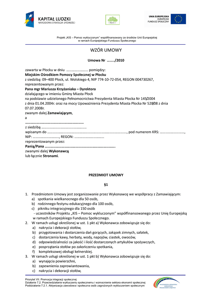 Projekt „KIS – Pomoc wykluczonym” współfinansowany ze środków Unii Europejskiej w ramach Europejskiego Funduszu Społecznego WZÓR UMOWY Umowa Nr ……../2010 zawarta w Płocku w dniu …………………… pomiędzy: Miejskim Ośrodkiem Pomocy Społecznej w Płocku z siedzibą: 09–400 Płock, ul. Wolskiego 4, NIP 774-10-72-054, REGON 004730267, reprezentowanym przez: Pana mgr Mariusza Krzyżaniaka – Dyrektora działającego w imieniu Gminy Miasta Płock na podstawie udzielonego Pełnomocnictwa Prezydenta Miasta Płocka Nr 145/2004 z dnia 01.04.2004r. oraz na mocy Upoważnienia Prezydenta Miasta Płocka Nr 528/08 z dnia 07.07.2008r. zwanym dalej Zamawiającym, a ……………………………………………………… z siedzibą ………………………………………….. wpisanym do ……………………………………………………………………………., pod numerem KRS: ………………………, NIP: ……………………….., REGON: …………………………… reprezentowanym przez: Panią/Pana …………………………………………………………………. zwanymi dalej Wykonawcą lub łącznie Stronami. PRZEDMIOT UMOWY §1 1. Przedmiotem Umowy jest zorganizowanie przez Wykonawcę we współpracy z Zamawiającym: a) spotkania wielkanocnego dla 50 osób, b) rodzinnego festynu edukacyjnego dla 100 osób, c) pikniku integracyjnego dla 150 osób - uczestników Projektu „KIS – Pomoc wykluczonym” współfinansowanego przez Unię Europejską w ramach Europejskiego Funduszu Społecznego. 2. W ramach usługi określonej w ust. 1 pkt a) Wykonawca zobowiązuje się do: a) nakrycia i dekoracji stołów, b) przygotowania i dostarczenia dań gorących, zakąsek zimnych, sałatek, c) dostarczenia kawy, herbaty, wody, napojów, ciastek, owoców, d) odpowiedzialności za jakość i ilość dostarczonych artykułów spożywczych, e) posprzątania stołów po zakończeniu spotkania, f) kompleksowej obsługi kelnerskiej. 3. W ramach usługi określonej w ust. 1 pkt b) Wykonawca zobowiązuje się do: a) wynajęcia powierzchni, b) zapewnienia zaprowiantowania, c) nakrycia i dekoracji stołów, Priorytet VII. Promocja integracji społecznej Działanie 7.2. Przeciwdziałanie wykluczeniu społecznemu i wzmocnienie sektora ekonomii społecznej Poddziałanie 7.2.1. Aktywizacja zawodowa i społeczna osób zagrożonych wykluczeniem społecznym Projekt „KIS – Pomoc wykluczonym” współfinansowany ze środków Unii Europejskiej w ramach Europejskiego Funduszu Społecznego d) dostarczenia fontanny czekoladowej dla dzieci, e) odpowiedzialności za jakość i ilość dostarczonych artykułów spożywczych, f) posprzątania stołów po zakończeniu festynu, g) kompleksowej obsługi kelnerskiej, h) zapewnienia ochrony na imprezę, i) zapewnienia osoby prowadzącej imprezę, j) zakupienia nagród dla dzieci, k) wynajęcia osoby do malowania twarzy dzieciom, l) zapewnienia oprawy muzycznej oraz nagłośnienia. 4. W ramach usługi określonej w ust. 1 pkt c) Wykonawca zobowiązuje się do: a) wynajęcia powierzchni, b) nakrycia i dekoracji stołów, c) przygotowania i dostarczenia dań gorących, zakąsek zimnych, sałatek, d) dostarczenia kawy, herbaty, wody, napojów, ciastek, owoców, e) odpowiedzialności za jakość i ilość dostarczonych artykułów spożywczych, f) posprzątania stołów po zakończeniu pikniku, g) kompleksowej obsługi kelnerskiej, h) zorganizowania oprawy muzycznej oraz nagłośnienia. 5. Strony ustalają, że Wykonawca wykona usługi, o których mowa w ust. 1 w ustalonych terminach i miejscach: a) spotkanie wielkanocne – ........... 2010r., w godzinach 1000 – 1400, sala konferencyjna Miejskiego Ośrodka Pomocy Społecznej w Płocku, ul. Wolskiego 4, b) rodzinny festyn edukacyjny – .............. 2010r., w godzinach 1200 - 1800, .................................... w Płocku, ul. ..............................................., c) piknik integracyjny – ..................... 2010r., w godzinach 1700 - 2400, ..................................... w Płocku, ul. ................................................ §2 1. Umowa zostaje zawarta na czas określony, tj. od dnia jej podpisania do dnia 30 września 2010r. 2. Umowa może być rozwiązana przez każdą ze Stron z zachowaniem 2-tygodniowego okresu wypowiedzenia. 3. Zamawiający może rozwiązać Umowę bez wypowiedzenia ze skutkiem natychmiastowym w przypadku niewykonania lub nienależytego wykonania przez Wykonawcę czynności określonych niniejsza Umową. §3 1. Za wykonanie czynności określonych w § 1 ust. 1 niniejszej Umowy Wykonawca otrzyma wynagrodzenie ryczałtowe w wysokości: a) zorganizowanie spotkania wielkanocnego: ........... zł brutto (słownie: .............................), b) zorganizowanie rodzinnego festynu edukacyjnego: ................ zł brutto (słownie: .........), c) zorganizowanie pikniku integracyjnego: ............ zł brutto (słownie: ...............................). 2. Łączna kwota wynagrodzenia za wykonanie czynności określonych w § 1 ust. 1 niniejszej Umowy wynosi ........................... zł brutto (słownie: .................................................................). 3. Wynagrodzenie współfinansowane jest przez Unię Europejską w ramach Europejskiego Funduszu Społecznego. Priorytet VII. Promocja integracji społecznej Działanie 7.2. Przeciwdziałanie wykluczeniu społecznemu i wzmocnienie sektora ekonomii społecznej Poddziałanie 7.2.1. Aktywizacja zawodowa i społeczna osób zagrożonych wykluczeniem społecznym Projekt „KIS – Pomoc wykluczonym” współfinansowany ze środków Unii Europejskiej w ramach Europejskiego Funduszu Społecznego §4 1. Niezwłocznie po otrzymaniu środków na finansowanie projektu „KIS – Pomoc wykluczonym” Zamawiający przekaże Wykonawcy informację o możliwości przedłożenia faktur za wykonane usługi. 2. Zamawiający zobowiązuje się do zapł
