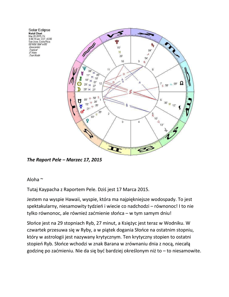 The Raport Pele – Marzec 17, 2015 Aloha ~ Tutaj Kaypacha z Raportem Pele. Dziś jest 17 Marca 2015. Jestem na wyspie Hawaii, wyspie, która ma najpiękniejsze wodospady. To jest spektakularny, niesamowity tydzień i wiecie co nadchodzi – równonoc! I to nie tylko równonoc, ale również zaćmienie słońca – w tym samym dniu! Słońce jest na 29 stopniach Ryb, 27 minut, a Księżyc jest teraz w Wodniku. W czwartek przesuwa się w Ryby, a w piątek dogania Słońce na ostatnim stopniu, który w astrologii jest nazywany krytycznym. Ten krytyczny stopien to ostatni stopień Ryb. Słońce wchodzi w znak Barana w zrównaniu dnia z nocą, niecałą godzinę po zaćmieniu. Nie da się być bardziej określonym niż to – to niesamowite. Księżyc w znaku Barana zasłania Marsa i Urana. Zasłonienie i zaćmienie tworzą się kiedy ścieżka planety (jej orbita) i eklipsa idealnie się zrównują. Zatem mamy Marsa/Urana, Słońce, Księżyc na dokładnie takie samej linii w kosmosie. Księżyc właściwie blokuje Marsa/Urana. To ma miejsce w sobotę. Dzisiaj Wenus wchodzi w znak Byka. Merkury porusza się w znaku Ryb i wchodzi w koniunkcję z Neptunem w środę, i jeszcze w sekstet z Plutonem w Niedzielę. Zobaczmy co to wszystko dla nas oznacza. Okey, gotowi czy nie, zaczynam! Co to wszystko znaczy? Księżyc opuszcza trzecią ćwierć kwadrata i przechodzi przez znak Wodnika właśnie teraz, a później wejdzie w Ryby. Dzisiaj jest wtorek, później mamy środę, czwartek, a w piątek zaćmienie. To się nazywa balsamiczna faza Księżyca. Księżyc kończy, zamyka swój miesięczny cykl. Pokonał całą drogę dookoła co zajęło 28-29 dni. Następuje zakończenie, kulminacja i ma to miejsce w znaku Ryb, który również jest symbolem ukończenia, zakończenia, końca. Mamy Neptuna/Chiron i Merkurego w znaku Ryb, a Słońce porusza się przez znak Ryb. Kwadratura Urana z Plutionem odnosi się do odpuszczenia, wyzwolenia, do rzeczy będących odebranym nam. Dużo przestawień, dużo zmian. Zbliżając się do końca cyklu, to czas na wybaczenie. To nie tylko puszczenie przeszłości, ale zaakceptowanie tego co się wydarzyło, zaakceptowanie nas samych oraz naszych żyć. Zaakceptowanie tego co Bóg/Bognii nam przynieśli! To jest trudno wytłumaczyć… Ma to związek ze współczuciem, izolacją, medytacją – domem marzeń. To jest czas, aby połączyć się z kosmiczną inteligencją, która stoi za tą całą iluzją i oczyścić się w przygotowaniu na nowy zastrzyk energii. Słońce wchodzi z znak Barana i to będzie wielki beng! Już mieliśmy wielkie beng z Marsem/Wenus i Uranem – dosyć dużo tych bengów się dzieje (*śmieje się). Ale teraz Słońce będzie się łączyć – wchodzi z znak Barana i haczy o Południowy Węzeł Księżyca, hacząc o Urana. Księżyc jednak będzie biegł naprzód i zablokuje Urana i Marsa. To bardzo ciekawe, że Księżyc bedzie blokował Słońce/Urana oraz Marsa – to jest bardzo mocny impuls lunarny. Astrologowie twierdzą (nie wszyscy, tych, których ja słuchach *śmiech), że zaćmienia kiedy to Księżyc wchodzi pomiędzy Słońce i Ziemię łamie się pole aury połączenia Ziemia/Słońce. Starożytni kapłani odczuwali to załamanie aury, które pozwala energiom z odległych zakątków kosmosu wejść w naszą sferę. To tak jakby Słońce chroniło Ziemię, a przez moment kiedy nasza tarcza jest złamana, jesteśmy bezbronni i narażeni. Jesteśmy w ostatnim stopniu Ryb, najbardziej wrażliwe miejsce, już nie ma zakończeń, tylko nowe początki, czas narodzin. Chcę Ciebie zachęcić do spędzenia następnych paru dni na medytacji, w izolacji, żebyś się podłączył/a do tej nowej fali, nowego impulse ze wszechświata – kosmiczne światy chcę do nas przemówić. Dlaczego? Ponieważ jesteśmy kanałami. Jesteśmy jak igiełki do akupunktury na naszej planecie Ziemii – Gaji. Musimy stanąć na wysokości zadania i taka jest nasza rola jako ludzi – zjednoczyć naszą nieskończoną świadomość duchową z naszą zwierzęcą, fizyczną, trójwymiarową jaźnią. To Saturn w Strzelcu – nieruchomy. Łatwo jest utknąć w tym zastrzyku adrenaliny od Marsa/Urana i Urana/Plutona, wystraszyć się co się dzieje i o co chodzi, utknąć w tym co jest tymczasowe, ulotne. Podłącz się do wiecznej jaźni. Tak jak było w matrze z poprzedniego tygodnia, “moja duchowa jaźń, gdzie wszystko jest spokojne i jasne.” To prawie jak przygotowania do ślubu, albo do wojny, to są przygotowania – nadchodzi! Przyszłość się zbliża, jesteśmy przyszłością – my jesteśmy tymi, na których czekamy! Kiedy Wenus wchodzi w Byka, chcę iść na ziemię. Księżyc wejdzie w Barana i połączy się z Wenus w Byku – ziemia! Słońce wchodzi w Barana, widzisz gdzie to wszystko prowadzi – to jest jak lejek, który wprowadza w ten świat wszystkie kosmiczne promienie, kosmiczne energie, kosmiczną mądrość, prawdę, sztukę, piękno, wdzięk, miłość. Wszystko to w nasz wymiar, w nasze życia. Najlepszy sposób na ten czas to zrównoważenie i odczuwanie. To jest dużo ludzi z pytaniami “jaki jest mój cel, gdzie jest moje plemię, nie wiem dlaczego tutaj jestem ani co robię”. To jest dobry czas dla Ciebie, żebyś odebrał/a tę wiadomość. Ona niekoniecznie musi być od innych ludzi, wierzeń, religii, instytucji, guru, itd… To jest w środku! W naszych ciałach. Wenus w Byku niesie mądrość ciała. Podłącz się do tego, uspokój umysł. Odpraw rytuał, ceremonię. Odkryłem, że jedną z rzeczy w życiu, która przynosi mi największe wibracje i pozwala wejść na wyższy poziom to wdzięczność! Dawaj wdzięczność, dziękuj i celebruj. Celebruj życie, celebruj swoje istnienie tutaj. Przez cały ból, całą torture I wszelkie represje, to jest szkoła mocnych uderzeń – trzeci wymiar separacji. Ale po drugiej stronie tego i poprzez to, jesteśmy mieczami, w które wali kowal czasu, abyśmy mogli stać