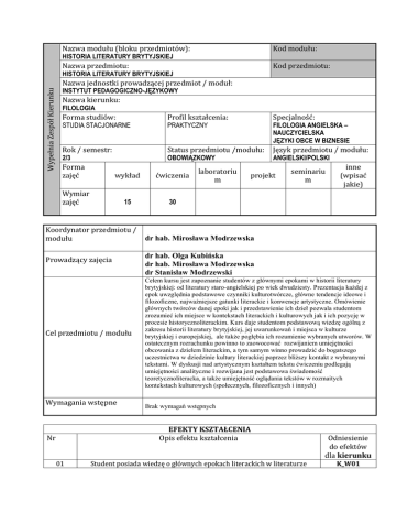 Nazwa modułu (bloku przedmiotów): Kod modułu: Nazwa przedmiotu: Kod przedmiotu: HISTORIA LITERATURY BRYTYJSKIEJ HISTORIA LITERATURY BRYTYJSKIEJ Wypełnia Zespół Kierunku Nazwa jednostki prowadzącej przedmiot / moduł: INSTYTUT PEDAGOGICZNO-JĘZYKOWY Nazwa kierunku: FILOLOGIA Forma studiów: Profil kształcenia: Specjalność: Rok / semestr: Status przedmiotu /modułu: Język przedmiotu / modułu: STUDIA STACJONARNE 2/3 Forma zajęć PRAKTYCZNY FILOLOGIA ANGIELSKA – NAUCZYCIELSKA JĘZYKI OBCE W BIZNESIE OBOWIĄZKOWY wykład ćwiczenia 15 30 Wymiar zajęć Koordynator przedmiotu / modułu Prowadzący zajęcia Cel przedmiotu / modułu Wymagania wstępne laboratoriu m ANGIELSKI/POLSKI projekt seminariu m dr hab. Mirosława Modrzewska dr hab. Olga Kubińska dr hab. Mirosława Modrzewska dr Stanisław Modrzewski Celem kursu jest zapoznanie studentów z głównymi epokami w historii literatury brytyjskiej: od literatury staro-angielskiej po wiek dwudziesty. Prezentacja każdej z epok uwzględnia podstawowe czynniki kulturotwórcze, główne tendencje ideowe i filozoficzne, najważniejsze gatunki literackie i konwencje artystyczne. Omówienie głównych twórców danej epoki jak i przedstawienie ich dzieł pozwala studentom zrozumieć ich miejsce w kontekstach literackich i kulturowych jak i ich pozycję w procesie historycznoliterackim. Kurs daje studentom podstawową wiedzę ogólną z zakresu historii literatury brytyjskiej, jej uwarunkowań i miejsca w kulturze brytyjskiej i europejskiej, ale także pogłębia ich rozumienie wybranych utworów. W ostatecznym rozrachunku powinno to zaowocować rozwijaniem umiejętności obcowania z dziełem literackim, a tym samym winno prowadzić do bogatszego uczestnictwa w dziedzinie kultury literackiej poprzez bliższy kontakt z wybranymi tekstami. W dyskusji nad artystycznym kształtem tekstu ćwiczeniu podlegają umiejętności analityczne i rozwijana jest podstawowa świadomość teoretycznoliteracka, a także umiejętność oglądania tekstów w rozmaitych kontekstach kulturowych (społecznych, filozoficznych i innych) Brak wymagań wstępnych EFEKTY KSZTAŁCENIA Opis efektu kształcenia Nr 01 inne (wpisać jakie) Student posiada wiedzę o głównych epokach literackich w literaturze Odniesienie do efektów dla kierunku K_W01 02 03 04 05 06 07 08 09 brytyjskiej od literatury staroangielskiej po wiek dwudziesty i ich specyfice (charakterystycznych cechach i uwarunkowaniach). Posiada podstawową wiedzę dotyczącą wpływu czynników historycznych na przemiany rozwojowe (ewolucję) literatury angielskiej. K_ W04 Posiada podstawowe i usystematyzowane pojęcia metodologiczne służące badaniu literatury w jej aspekcie historycznym (diachronicznym) i synchronicznym (konteksty kulturowe w konkretnych momentach rozwoju literatury. Posiada podstawową wiedzę o kontekstach kulturowych ważnych w poszczególnych epokach literatury brytyjskiej. K_W03 Ma podstawową wiedzę o najnowszych badaniach literaturoznawstwa brytyjskiego w wybranych zagadnieniach. Samodzielnie zdobywa i porządkuje wiedzę z zakresu historii literatury angielskiej. Potrafi samodzielnie stawiać hipotezy interpretacyjne: formułować problemy związane z badaniem tekstu literackiego oraz dokonać ich weryfikacji przez odniesienie do zjawisk tekstowych. oraz zestawić je z poglądami innych autorów . Wnioski potrafi przedstawić w języku polskim i angielskim. W przeprowadzaniu analiz i interpretacji zachowuje dbałość o zastosowanie metody odpowiedniej do przedmiotu analizy, a także o odniesienie do istotnego kontekstu kulturowego. Potrafi odrzucić konteksty przypadkowe i nieadekwatne. Jest świadom posiadanej przez siebie wiedzy, potrafi określić jej podstawowe elementy i ograniczenia. K_W09 K_W05 K_U02 K_U06 K_U09 K_K01 TREŚCI PROGRAMOWE Wykład Lista tematów pomawianych na wykładach: I. Literatura staro-angielska 1. główne czynniki kulturotwórcze 2. podstawowe gatunki literackie (epos, poezja dworska, poezja elegijna, poezja religijna) II. Literatura średniowieczna: 1. główne trendy intelektualne wieków średnich 2. główne konwencje literackie i kulturowe (np. konwencja miłości dworskiej) 3. wachlarz konwencji gatunkowych (romans rycerski, fabliau, romans arturiański, exemplum itd. na przykładzie twórczości Geoffreya Chaucera) III. Renesans 1. zasadnicze prądy umysłowe (humanizm, reformacja) 2. podstawowe rysy renesansowej wizji świata (łańcuch bytów, analogiczność, hierarchiczność) 4. dramat elżbietański (William Shakespeare: wielkie tragedie, komedie, dramat historyczny) 5. poezja metafizyczna (Donne, Herbert Herrick, Marvell) – koncept jako trop IV. Neoklasycyzm 1. Wpływ idei Newtona i Locke’a na obraz świata w wieku osiemnastym 2. podstawowe rysy osiemnastowiecznej wizji świata (np. idea hierarchii, łańcuch bytów) a zasadnicze pojęcia ówczesnej kultury i literatury (decorum, idea naśladowania, hierarchia gatunków, poetyka normatywna itd.) 3. twórczość Aleksandra Pope’a jako wyraz głównych tendencji epoki 4. narodziny i rozwój powieści angielskiej (D. Defoe, S. Richardson, H. Fielding, L. Sterne): przemiany paradygmatu powieściowego – kształt narracji, koncepcja postaci, konstrukcja akcji. V. Początki romantyzmu w poezji i prozie ostatnich dekad 18 w. Ćwiczenia „The Dream of the Rood”- ogólne i szczegółowe zasady kompozycji a kontekst kultury anglo-saksońskiej Analiza kompozycji i znaczeń metaforycznych wiersza „I Sing of a Maiden”. Interpretacja ballady „The Three Ravens”: wyznaczniki gatunkowe, synkretyzm rodzajowy, metaforyczność a kontekst kultury średniowiecza. 4. Lektura wybranych scen z „Hamleta” Williama Shakespeare’a. – koncepcja teatru elżbietańskiego 5. Analiza “Easter Wings” George’a Herberta jako przykładu “pattern poetry” 6. Kompozycja konceptu metafizycznego na przykładzie wiersza „On a Drop of Dew” Andrew Marvella. 7. Strategie argumentatywne w poe