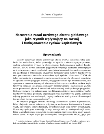 dr Iwona Chojecka1 Naruszenia zasad uczciwego obrotu giełdowego jako czynnik wpływający na rozwój i funkcjonowanie rynków kapitałowych Wprowadzenie Zasady uczciwego obrotu giełdowego (dalej: ZUOG) oznaczają takie działanie lub zaniechanie, które pozostając w zgodzie z obowiązującym prawem, spełnia jednocześnie wymogi w sferze etycznej funkcjonowania rynków kapitałowych. ZUOG swoim zakresem pojęciowym obejmuje zdarzenia przebiegające na trzech płaszczyznach: zgodności z przyjętymi zasadami ekonomiczno-prawnymi, zgodności z przesłankami etycznymi funkcjonowania rynków kapitałowych oraz poszanowania interesów uczestników tych rynków. Naruszenia ZUOG nie tylko zawierają się w nieprzestrzeganiu regulacji prawnych, ale nawet pozostając w zgodzie z obowiązującym prawem, mogą jednocześnie być kwalifikowane jako sprzeczne z normami etycznymi lub naruszać interesy uczestników rynków kapitałowych. Dlatego też granica pomiędzy poszanowaniem i naruszeniem ZUOG może pozostawać płynna i zależeć od indywidualnej analizy danego przypadku. Rolę decyzyjną w tym zakresie oraz rolę bilansującą interesy uczestników rynków kapitałowych pełnią podmioty organizujące rynki kapitałowe tj. giełdy, centralne rejestry papierów wartościowych, organy nadzorcze nad rynkami finansowymi (zwani dalej łącznie „organizatorami”). W artykule przyjęto złożoną definicję uczestników rynków kapitałowych, która obejmuje swoim zakresem pojęciowym emitentów instrumentów finansowych, inwestorów indywidualnych, kwalifikowanych oraz firmy inwestycyjne. Uczestnicy tych grup zmierzają do tego samego celu tj. maksymalizacji zysku, które to działanie może wiązać się z poniesieniem straty przez inne grupy uczestników rynku. Na tym etapie jest dostrzegalne funkcjonowanie ZUOG, gdyż gra1 Autorka jest pracownikiem Urzędu Komisji Nadzoru Finansowego. Poglądy wyrażone w artykule są poglądami autorki i nie wyrażają oficjalnego stanowiska KNF ani Urzędu KNF. 54 dr Iwona Chojecka nicą dozwolonych działań podejmowanych w ramach stosunków gospodarczych przez jednych uczestników w celu osiągnięcia zysku – jest poszanowanie interesów innych uczestników. Dążenie do maksymalizacji zysku przez uczestników rynków kapitałowych pozostaje kompatybilne w drodze do realizacji tego celu, jeżeli przebiega w oparciu o poszanowanie ZUOG, ale może również pozostawać z nimi sprzeczne w sytuacji, gdy uczestnicy starają się osiągnąć cel maksymalizacji przy użyciu metod, środków lub działań pozostających poza zakresem ZUOG. Na tym etapie zaczynają być dostrzegalne naruszenia ZUOG, które mogą być dokonywane przez emitentów instrumentów finansowych oraz inwestorów i firmy inwestycyjne, przy jednoczesnym zwróceniu szczególnej uwagi na problematykę corporate governance. Wyzwanie, które stoi przed rynkami kapitałowymi zawiera się w skutecznym zapobieganiu, metodach reakcji na naruszenia ZUOG oraz minimalizacji negatywnych skutków tych naruszeń dostosowanych do aktualnej sytuacji gospodarczej oraz stopnia dojrzałości rynku. Decydującą rolę w tym procesie pełnią organizatorzy rynku kapitałowego. Celem artykułu jest próba określenia, jakie znaczenie i skutki dla kształtu rynków kapitałowych wiążą się z zachodzącymi na tych rynkach naruszeniami ZUOG oraz jakie metody działania powinny być przyjęte przez uczestników oraz organizatorów rynków w celu prewencji, reakcji i eliminowania zjawisk naruszeń ZUOG. Problematyka artykułu koncentruje się przede wszystkim na próbie wykazania wpływu naruszeń ZUOG na rozwój i funkcjonowanie rynków kapitałowych, które stworzyły warunki do wygenerowania zjawisk ekonomicznych, zmian regulacji prawnych oraz odpowiednich działań podejmowanych przez organizatorów rynku kapitałowego. Przy czym należy podkreślić, iż naruszenia ZUOG stanowią jeden z wielu elementów wpływających na warunki funkcjonowania i rozwoju rynków kapitałowych. 1. Naruszenia ZUOG z perspektywy funkcjonowania rynku kapitałowego Wielość aspektów funkcjonowania i rozwoju rynków kapitałowych wywiera istotny wpływ na występowanie naruszeń ZUOG na tych rynkach. Do zagrożeń rynków kapitałowych należy przede wszystkim niedostateczna płynność rynków, która zwiększa ich podatność na naruszenia ZUOG w postaci występowania zjawisk przestępczości giełdowej. Z punktu widzenia makroekonomicznego występujące kryzysy gospodarcze mogą przekładać się na zmniejszenie się stabilności rynku akcji, a co za tym idzie wrażliwości rynków kapitałowych na naruszenia ZUOG, przy czym to często sytuacja kryzysowa uwypukla skalę potrzebnych do przeprowadzenia zmian ekonomiczno–prawnych na tych rynkach. Z punktu widzenia mikroekonomicznego na rynku kapitałowym nie ma możliwości zupełnej eliminacji naruszeń ZUOG, Naruszenia zasad uczciwego obrotu giełdowego jako czynnik wpływający na rozwój... 55 ale powinno się podejmować działania, aby ich rozmiary mogły być kontrolowane przez mechanizmy konkurencji. Konkurencja sprawia, że „niewidzialne ręka rynku” sprowadza zakres spekulacji do rozmiarów obiektywnie użytecznych dla gospodarki. Jednak mechanizm samoregulacji wynikającej z wolnej konkurencji doskonale sprowadza się na rynku towarów i usług, ale już nie na rynku finansowym, gdzie handluje się ryzykiem, a poszczególne produkty finansowe są nośnikiem tego ryzyka. Postępująca integracja rynków kapitałowych przyczyniła się do ujednolicenia podejścia do występujących na tych rynkach naruszeń ZUOG. Dzięki temu ułatwieniu uległo wykrywanie i zapobieganie tym zjawiskom. Z drugiej jednak strony, postępująca integracja rynków kapitałowych może przyczyniać się do zwiększania ich podatności na naruszenia ZUOG, w szczególności w odniesieniu do mniej płynnych rynków kapitałowych, za sprawą napływu na te rynki kapitału spekulacyjnego. 