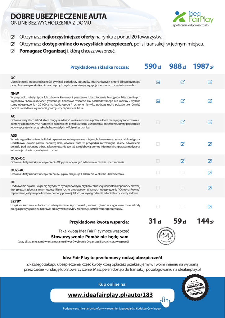 DOBRE UBEZPIECZENIE AUTA ONLINE BEZ WYCHODZENIA Z DOMU Otrzymasz najkorzystniejsze oferty na rynku z ponad 20 Towarzystw. Otrzymasz dostęp online do wszystkich ubezpieczeń, polis i transakcji w jednym miejscu. Pomagasz Organizacji, którą chcesz wesprzeć. Przykładowa składka roczna: 590 zł 988 zł 1987 zł OC Ubezpieczenie odpowiedzialności cywilnej posiadaczy pojazdów mechanicznych chroni Ubezpieczonego przed finansowymi skutkami szkód wyrządzonych przez kierującego pojazdem innym uczestnikom ruchu. NNW W przypadku utraty życia lub zdrowia kierowcy i pasażerów, Ubezpieczenie Następstw Nieszczęśliwych Wypadków "Komunikacyjne" gwarantuje: finansowe wsparcie dla poszkodowanego lub rodziny / wysoką sumę ubezpieczenia - 20 000 zł na każdą osobę / ochronę nie tylko podczas ruchu pojazdu, ale również podczas wsiadania, wysiadania, postoju czy naprawy na trasie. AC Ochrona wszystkich szkód, które mogą się zdarzyć w okresie trwania polisy, a które nie są wyłączone z zakresu ochrony zgodnie z OWU. Autocasco zabezpiecza przed skutkami uszkodzenia, zniszczenia, utraty pojazdu lub jego wyposażenia - przy szkodach powstałych w Polsce i za granicą. ASS W razie wypadku na terenie Polski zapewniona jest naprawa na miejscu, holowanie oraz samochód zastępczy. Dodatkowo: dowóz paliwa, naprawę koła, otwarcie auta w przypadku zatrzaśnięcia kluczy, odwiezienie pojazdu pod wskazany adres, zakwaterowanie czy też całodobową pomoc informacyjną (porada medyczna, informacja o trasie czy natężeniu ruchu). OUZ+OC Ochrona utraty zniżki w ubezpieczeniu OC p.p.m. obejmuje 1 zdarzenie w okresie ubezpieczenia. OUZ+AC Ochrona utraty zniżki w ubezpieczeniu AC p.p.m. obejmuje 1 zdarzenie w okresie ubezpieczenia. OP Użytkowanie pojazdu wiąże się z ryzykiem bycia pozwanym, czy koniecznością skorzystania z pomocy prawnej (np. sprawa sądowa z innym uczestnikiem ruchu drogowego). W ramach ubezpieczenia "Ochrona Prawna" zapewniane jest pokrycie kosztów pomocy prawnej, takich jak wynagrodzenie adwokata czy koszty sądowe. SZYBY Dzięki rozszerzeniu autocasco o ubezpieczenie szyb pojazdu, mozna zgłosić w ciągu roku dwie szkody polegające wyłącznie na naprawie lub wymianie szyb/y zachowując zniżki w ubezpieczeniu AC. Przykładowa kwota wsparcia: 31 zł 59 zł 144 zł Taką kwotą Idea Fair Play może wesprzeć Stowarzyszenie Pomóż nie będę sam (przy składaniu zamówienia masz możliwość wybrania Organizacji jaką chcesz wesprzeć) Idea Fair Play to przełomowy rodzaj ubezpieczeń! Z każdego zakupu ubezpieczenia, część kwoty którą opłacasz przekazujemy w Twoim imieniu na wybraną przez Ciebie Fundację lub Stowarzyszenie. Masz pełen dostęp do transakcji po zalogowaniu na ideafairplay.pl Kup online na: www.ideafairplay.pl/auto/183 Podane ceny nie stanowią oferty w rozumieniu przepisów Kodeksu Cywilnego.