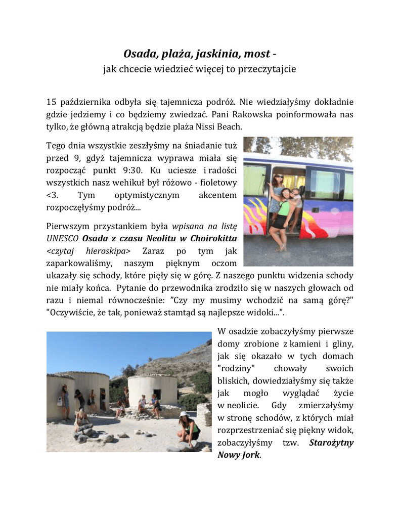 Osada, plaża, jaskinia, most jak chcecie wiedzieć więcej to przeczytajcie 15 października odbyła się tajemnicza podróż. Nie wiedziałyśmy dokładnie gdzie jedziemy i co będziemy zwiedzać. Pani Rakowska poinformowała nas tylko, że główną atrakcją będzie plaża Nissi Beach. Tego dnia wszystkie zeszłyśmy na śniadanie tuż przed 9, gdyż tajemnicza wyprawa miała się rozpocząć punkt 9:30. Ku uciesze i radości wszystkich nasz wehikuł był różowo - fioletowy <3. Tym optymistycznym akcentem rozpoczęłyśmy podróż... Pierwszym przystankiem była wpisana na listę UNESCO Osada z czasu Neolitu w Choirokitta <czytaj hieroskipa> Zaraz po tym jak zaparkowaliśmy, naszym pięknym oczom ukazały się schody, które pięły się w górę. Z naszego punktu widzenia schody nie miały końca. Pytanie do przewodnika zrodziło się w naszych głowach od razu i niemal równocześnie: ”Czy my musimy wchodzić na samą górę?" "Oczywiście, że tak, ponieważ stamtąd są najlepsze widoki...". W osadzie zobaczyłyśmy pierwsze domy zrobione z kamieni i gliny, jak się okazało w tych domach "rodziny" chowały swoich bliskich, dowiedziałyśmy się także jak mogło wyglądać życie w neolicie. Gdy zmierzałyśmy w stronę schodów, z których miał rozprzestrzeniać się piękny widok, zobaczyłyśmy tzw. Starożytny Nowy Jork. Na początku swoim towarzystwem zaszczycił nas kotek, którego nazwałyśmy Gucio. Bardzo towarzyski i fotogeniczny ustawiał się z nami do zdjęć. Pożegnałyśmy naszego nowo poznanego kolegę i ruszyłyśmy do następnego miejsca. Barwny wehikuł obrał kierunek na Larnakę. Kolejnym miejscem, w którym się zatrzymałyśmy był Meczet Halla Sultana Tekkesi. Nasza grupa z chęcią wchodzi do meczetów, nie jestem pewna czy to ze względu na chęć rozwijana zainteresowań w dziedzinie kultury i religii różnych narodów, czy tylko ze względu na chusty i suknie, w które musiałyśmy się przyodziać wchodząc do meczetów. Z terenu, na którym znajdował się meczet widziałyśmy słone jeziora i w ten oto sposób przechodzimy do kolejnego punktu naszej wyprawy. Po zwiedzeniu świątyni wyznawców Allaha udałyśmy się na Słone Jeziora gdzie mogłyśmy pobawić się w Jezusa, chodzić po jeziorze i nie zamoczyć stóp... Jak to możliwe...? To nasza tajemnica. Z tymi jeziorami wiąże się pewna legenda. Gdy Łazarz wskrzeszony przez Jezusa był zmuszony do opuszczenia swojej ojczyzny, (był ścigany przez prześladowców chrześcijan ponieważ był żywym dowodem na to, kim jest Jezus) dotarł na Cypr głodny i spragniony zapukał do pewnej winnicy i poprosił o czystą wodę. Kobieta, która otworzyła drzwi w bardzo niemiły sposób odmówiła mu, za co została ukarana. Winnice zalała słona woda i w ten sposób powstały słone jeziora. Kolejnym punktem na naszej mapie był kościół św. Łazarza w Larnace. Część z nas próbowała przekonać Panią przewodnik, że już byłyśmy w tym kościele. Po krótkiej konwersacji okazało się, że tak i owszem byłyśmy w tym kościele, tylko, że był w innym mieście i nie było tam grobu Łazarza, koniec końców chusty, które wisiały przed wejściem przekonały nas do wejścia. Na Cyprze są kościoły prawosławne, w kościele widziałyśmy XVI wieczne obrazy, zapaliłyśmy świece każda w swojej intencji, zeszłyśmy również do grobowca Łazarza. Ludzie zostawiali tam świece oraz kartki z prośbą o pomoc w chorobie lub innych trudnych sytuacjach. Wróciłyśmy do naszej klimatyzowanej limuzyny i uszyłyśmy w stronę Agia Napa. Byłyśmy coraz bliżej głównej atrakcji... miałyśmy około godziny drogi do kolejnego przystanku i mogłyśmy podziwiać piękne widoki. Widziałyśmy między innymi Klasztor św. Krzyża, akwedukt i kilka wodnych parków rozrywki. Nie każda z nas podziwiała fantastyczne widoki wybrzeża oraz cudowne zarysy gór gdyż większość postanowiła regenerować siły przed główna atrakcją. Nieoczekiwanie (jak dla nas) wehikuł zatrzymała się na poboczu. Gdy wyszłyśmy nasz wódz oznajmił, że znajdujemy się przed Mostem miłości. Był on w złym stanie i nie mamy pojęcia, po co ludzie na niego wchodzili, znajdował się dosłownie nad przepaścią! i mógł się rozsypać w dowolnym momencie (pewnie, dlatego był ogrodzony...). Jednak brak możliwości wstępu na most rekompensował naprawdę piękny widok roztaczający się dookoła. Szkoda tylko, że nie mogłyśmy tam zbyt długo zostać ze względu na napięty grafik. Ujechaliśmy może 10 minut i barwny busik postanowił zrobić nam prezent. Zawiózł nas w kolejne miejsce widokowe jednak musiałyśmy zejść w dół, aby zobaczyć to, co zobaczyć miałyśmy. Mianowice Jaskini, w której pierwsi chrześcijanie odprawiali msze. Widoki ponownie odebrały nam dech w piersiach. Jama wydrążona przez wodę w zboczu a do tego woda czysta jak... jak Kropla Beskidu. Postój był nieco dłuższy od poprzedniego, musiałyśmy porobić masę zdjęć i wchłonąć energię zawartą w tym miejscu. Gdy nacieszyłyśmy oczy pięknym widokiem wsiadłyśmy do wehikułu i usłyszałyśmy, że cel naszej wyprawy jest coraz bliżej... Z prędkością światła pędziłyśmy szybciej niż struś pędziwiatr na Nissi Beach!!! Jak się dowiedziałyśmy jest to jedno z najdroższych, chyba nawet na świecie, miast. Jedna z najpiękniejszych plaż w Europie. Byłyśmy tam!!! Oddychałyśmy powietrzem dla bogaczy, kradłyśmy ich słońce przez dwie godziny!!! Zjadłyśmy obiad na najpiękniejszej plaży w Europie. Nie mogło się też obyć bez zdjęć palmy oraz pod palmą :D Tym optymistycznym akcentem zakończyła się nasza tajemnicza wyprawa na Nissi Beach w Agia Napa.