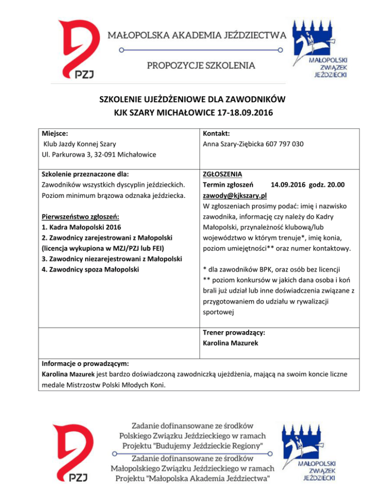 SZKOLENIE UJEŻDŻENIOWE DLA ZAWODNIKÓW KJK SZARY MICHAŁOWICE 17-18.09.2016 Miejsce: Klub Jazdy Konnej Szary Ul. Parkurowa 3, 32-091 Michałowice Kontakt: Anna Szary-Ziębicka 607 797 030 Szkolenie przeznaczone dla: Zawodników wszystkich dyscyplin jeździeckich. Poziom minimum brązowa odznaka jeździecka. ZGŁOSZENIA Termin zgłoszeń 14.09.2016 godz. 20.00 [email protected] W zgłoszeniach prosimy podać: imię i nazwisko zawodnika, informację czy należy do Kadry Małopolski, przynależność klubową/lub województwo w którym trenuje*, imię konia, poziom umiejętności** oraz numer kontaktowy. Pierwszeństwo zgłoszeń: 1. Kadra Małopolski 2016 2. Zawodnicy zarejestrowani z Małopolski (licencja wykupiona w MZJ/PZJ lub FEI) 3. Zawodnicy niezarejestrowani z Małopolski 4. Zawodnicy spoza Małopolski * dla zawodników BPK, oraz osób bez licencji ** poziom konkursów w jakich dana osoba i koń brali już udział lub inne doświadczenia związane z przygotowaniem do udziału w rywalizacji sportowej Trener prowadzący: Karolina Mazurek Informacje o prowadzącym: Karolina Mazurek jest bardzo doświadczoną zawodniczką ujeżdżenia, mającą na swoim koncie liczne medale Mistrzostw Polski Młodych Koni. Przedmiot szkolenia: Szkolenie skierowane do osób trenujących i startujących w zawodach w dyscyplinie ujeżdżenia, WKKW i skoków przez przeszkody. Szkolenie ma na celu pogłębienie wiedzy praktycznej na temat prawidłowego treningu konia, z naciskiem na podstawy dające bazę w zaawansowanym treningu ujeżdżeniowym jak i skokowym. Szkolenie praktyczne będzie polegało na treningach w maksymalnie 2 osobowych grupach * w razie złych warunków atmosferycznych treningi będą odbywać się na hali. Wymagane dokumenty: Wymagane dokumenty: Konie: Uczestnicy biorący udział w części praktycznej: Paszport wraz ze szczepieniami ochronnymi aktualne badanie lekarskie, oraz aktualne przeciwko grypie koni. ubezpieczenie NNW obejmujące uprawianie jeździectwa oraz w przypadku niepełnoletnich zgoda rodziców na udział Opłaty: Uczestnicy z Małopolski zwolnieni z opłaty za uczestnictwo. Uczestnicy spoza Małopolski – 100 zł/dzień Wolni słuchacze - wstęp wolny Boks dla konia 50zł/dzień Organizator zastrzega sobie możliwość nie przyjęcia zgłoszeń, w przypadku przekroczenia liczby 20 koni. PROGRAM SZKOLENIA Sobota 17.09.2016 godz. 10-18 treningi Niedziela 18.09.2016 godz. 8-16 treningi UWAGA GODZINY ROZPOCZĘCIA SZKOLENIA MOGĄ ULEC ZMIANIE W ZALEŻNOŚCI OD ILOŚCI ZGŁOSZONYCH UCZESTNIKÓW INFORMACJE DODATKOWE Opłata za boks obejmuje pierwszą ściółkę słomę. Istnieje możliwość pościelenia trocinami (55zł/balot). Prosimy zaznaczyć w zgłoszeniu. Organizator nie ponosi żadnej odpowiedzialności w razie wypadków i zachorowań uczestników, luzaków, trenerów, koni na terenie ośrodka i w czasie transportu jak również w przypadku kradzieży, zniszczeń, pożarów i innych zdarzeń losowych. Lista zgłoszonych zawodników i koni ukaże się w dniu 15.09 na stronie www.kjkszary.pl ZAKWATEROWANIE: Szary Residence (na terenie ośrodka) tel. 12 306 51 00 KODEKS POSTĘPOWANIA Z KONIEM Polski Związek Jeździecki prosi wszystkie osoby zaangażowane w jakikolwiek sposób w sporty konne, o przestrzeganie poniżej przedstawionego kodeksu oraz zasady, że dobro konia jest najważniejsze. Dobro konia musi być zawsze i wszędzie uwzględniane w sportach konnych i nie może być podporządkowane współzawodnictwu sportowemu ani innym celom np. komercyjnym. 1. Na wszystkich etapach treningu i przygotowań konia do startu w zawodach, dobro konia musi stać ponad wszelkimi innymi wymaganiami. Dotyczy to stałej opieki, metod treningu, starannego obrządku, kucia i transportu. 2. Konie i jeźdźcy muszą być wytrenowani, kompetentni i zdrowi zanim wezmą udział w zawodach. Odnosi się to także do podawania leków i środków medycznych, zabiegów chirurgicznych zagrażających dobru konia lub ciąży klaczy, oraz do przypadków nadużywania pomocy. 3. Zawody nie mogą zagrażać dobru konia. Wymaga to zwrócenia szczególnej uwagi na teren zawodów, powierzchnię podłoża, pogodę, warunki stajenne, kondycję koni i ich bezpieczeństwo także podczas podroży powrotnej z zawodów. 4. Należy dołożyć wszelkich starań, aby zapewnić koniom staranną opiekę po zakończeniu zawodów, a także humanitarne traktowanie po zakończeniu kariery sportowej. Dotyczy to właściwej opieki weterynaryjnej obrażeń odniesionych na zawodach, spokojnej starości, ewentualnie eutanazji. 5. PZJ zachęca wszystkie osoby działające w sporcie jeździeckim do stałego podnoszenia swojej wiedzy oraz umiejętności dotyczących wszelkich aspektów współpracy z koniem.