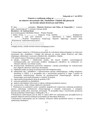Załącznik nr 3 do SIWZ Umowa o realizację usług nr ……………. na zimowe utrzymanie ulic, chodników i kładek dla pieszych na terenie miasta Kostrzyn nad Odrą W dniu …………….. pomiędzy: Miastem Kostrzyn nad Odrą, ul. Kopernika 1 zwanym dalej „Zamawiającym” w imieniu, którego działa Burmistrz - dr Andrzej Kunt przy kontrasygnacie Skarbnika Miasta – Wandy Dudziak z jednej strony, a ……………... mającym swoją siedzibę …………………, działającymi w oparciu o wpis pod numerem ……….. dokonanym w Sądzie Rejonowym ……………….Wydział Gospodarczy Krajowego Rejestru Sądowego zwanym dalej „Wykonawcą” reprezentowanym przez : 1. …………………………………………… 2. …………………………………………… z drugiej strony, została zawarta umowa następującej treści : §1 1.Zamawiający zamawia, a Wykonawca przyjmuje do wykonania usługi polegające na zimowym utrzymaniu ulic, chodników i kładek dla pieszych na terenie miasta Kostrzyn nad Odrą obejmujące odśnieżanie i usuwanie oblodzeń ulic, chodników i kładek. 2.W ramach umowy Wykonawca zobowiązuje się do: a) zakupu, transportu i składowania piasku, lub innych środków uszorstniających (niedopuszczalne jest stosowanie środków działających szkodliwie na roślinność) we własnym zakresie i na własne ryzyko, b) utrzymywania całodobowej gotowości transportu i sprzętu potrzebnego do wykonywania prac objętych zakresem zimowego utrzymania, c) załadunku piasku na sprzęt do posypywania lub transportowania, d) odśnieżania ulic i chodników z zastosowaniem sprzętu odśnieżającego, według kolejności określonej w SIWZ, a w przypadku ulic o nawierzchni gruntowej w ciągu 3 godzin od otrzymania telefonicznego zlecenia od przedstawiciela Zamawiającego, zlecenie to Zamawiający potwierdzi pisemnie w terminie 24 godzin, e) zapewnienie przejezdności dróg do godziny 6.00, f) usuwanie gołoledzi na chodnikach, g) nadzoru nad ekipami roboczymi w trakcie realizacji przedmiotu umowy, h) oczyszczenie z lodu i śniegu odpływów ulicznych. 3. Wykonawca na podstawie oceny warunków pogodowych rozpoczyna realizację przedmiotu umowy informując telefonicznie Zamawiającego o terminie rozpoczęcia, a następnie zakończenia każdej akcji zimowego utrzymania. W przypadku dróg o nawierzchni gruntowej decyzję podejmuje Zamawiający według pkt.2 lit. j. 4.Wykonawca zobowiązany jest do dnia 31 marca 2007r do wykonania prac porządkowych na terenach objętych umową (usunięcie pozostałości po likwidacji śliskości). 5.Wykonawca zobowiązany jest do realizacji własnymi siłami przedmiotu umowy w zakresie odśnieżania chodników. §2 22 1.Strony zgodnie ustalają, że Zamawiający dostarczył Wykonawcy formularz zawierający specyfikację istotnych warunków zamówienia, który zawierał między innymi istotne dla Zamawiającego postanowienia i zobowiązania Wykonawcy, oraz że są one wprowadzone do niniejszej umowy. 2. Integralną część niniejszej umowy stanowią dokumenty wyszczególnione w specyfikacji istotnych warunków zamówienia, przedmiar robót i oferta Wykonawcy. §3 1.Termin rozpoczęcia przedmiotu umowy ustala się na dzień: 1 listopada 2006r. 2.Termin zakończenia przedmiotu umowy ustala się na dzień: 31 marca 2007r. §4 1.Strony ustalają, że za każdorazowe wykonanie robót Zamawiający zapłaci wynagrodzenie ustalone na podstawie cen jednostkowych i krotności wykonanych przez Wykonawcę robót: -za mechaniczne odśnieżanie ulic chodników – ………. zł netto za 100 m2 -za usuwanie oblodzeń ulic i chodników – ……… zł netto za 100 m2 -za zimowe utrzymanie kładek - ………… zł netto za 1 dobę, -za pozimowe uprzątnięcie terenów objętych umową- ………….. zł netto za 100 m2 2. Zamawiający zobowiązuje się do wypłacenia Wykonawcy miesięcznego wynagrodzenia ryczałtowego za dyżury i utrzymanie całodobowej gotowości transportu i sprzętu potrzebnego do wykonania prac objętych niniejszą umową w wysokości ………… . 3. Łączna wartość umowy wynosi …………. zł netto plus podatek VAT co stanowi wynagrodzenie brutto …………..zł (słownie: ……………………). §5 1.Strony postanawiają, że rozliczenie za wykonanie przedmiotu umowy odbywać się będzie miesięcznie po przedstawieniu przez Wykonawcę zaakceptowanego przez przedstawiciela Zamawiającego zestawienia wykonanych w danym miesiącu robót wyszczególnionych w § 4 niniejszej umowy. Akceptacja wykonanych prac następuje w dniu ich realizacji. 2.Wynagrodzenie będzie płatne w terminie 21 dni od daty otrzymania faktury. Płatnikiem jest Miasto Kostrzyn nad Odrą, ul. Kopernika 1, NIP 599-27 -71-328. §6 Ze strony Wykonawcy roboty nadzorował będzie: …………………………………... §7 Ze strony Zamawiającego nadzór nad wykonaniem robót prowadził będzie: Andrzej Słowiński, tel. 0508359697. §8 1.Strony ustalają, że formą odszkodowania za niewywiązanie się z warunków umowy będą kary umowne. 2.Ustala się kary umowne w następujących przypadkach i wysokościach : a/ Zamawiający zobowiązany jest do zapłaty Wykonawcy kary w wysokości 30% wartości umowy w przypadku odstąpienia od umowy z przyczyn, za które sam ponosi odpowiedzialność. b/ Wykonawca zobowiązany jest do zapłaty kar umownych Zamawiającemu: za nienależyte wykonanie przez Wykonawcę obowiązków wynikających z umowy w wysokości 0,2% wynagrodzenia umownego, za odstąpienie od umowy z przyczyn dotyczących Wykonawcy w wysokości 30% wynagrodzenia umownego. 23 3.Przez nienależyte wykonanie przez Wykonawcę obowiązków należy rozumieć niesumienne (czas przystąpienia, sposób prowadzenia akcji zimowej, nie dotrzymanie standardów określonych dla każdej z kategorii odśnieżania) wykonywanie czynności usuwania śniegu lub oblodzeń, skutkiem czego poruszanie się na obsługiwanym terenie jest szczegól