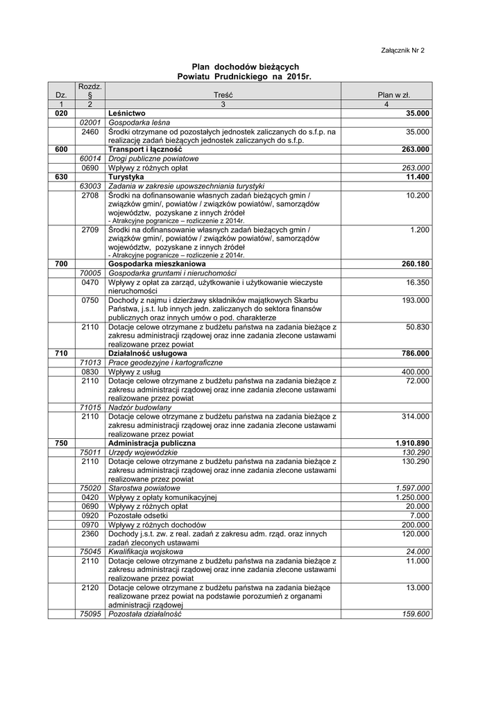 Załącznik Nr 2 Plan dochodów bieżących Powiatu Prudnickiego na 2015r. Dz. 1 020 600 630 Rozdz. § 2 Treść 3 Leśnictwo 02001 Gospodarka leśna 2460 Środki otrzymane od pozostałych jednostek zaliczanych do s.f.p. na realizację zadań bieżących jednostek zaliczanych do s.f.p. Transport i łączność 60014 Drogi publiczne powiatowe 0690 Wpływy z różnych opłat Turystyka 63003 Zadania w zakresie upowszechniania turystyki 2708 Środki na dofinansowanie własnych zadań bieżących gmin / związków gmin/, powiatów / związków powiatów/, samorządów województw, pozyskane z innych źródeł Plan w zł. 4 35.000 35.000 263.000 263.000 11.400 10.200 - Atrakcyjne pogranicze – rozliczenie z 2014r. 2709 Środki na dofinansowanie własnych zadań bieżących gmin / związków gmin/, powiatów / związków powiatów/, samorządów województw, pozyskane z innych źródeł 1.200 - Atrakcyjne pogranicze – rozliczenie z 2014r. 700 710 750 Gospodarka mieszkaniowa 70005 Gospodarka gruntami i nieruchomości 0470 Wpływy z opłat za zarząd, użytkowanie i użytkowanie wieczyste nieruchomości 0750 Dochody z najmu i dzierżawy składników majątkowych Skarbu Państwa, j.s.t. lub innych jedn. zaliczanych do sektora finansów publicznych oraz innych umów o pod. charakterze 2110 Dotacje celowe otrzymane z budżetu państwa na zadania bieżące z zakresu administracji rządowej oraz inne zadania zlecone ustawami realizowane przez powiat Działalność usługowa 71013 Prace geodezyjne i kartograficzne 0830 Wpływy z usług 2110 Dotacje celowe otrzymane z budżetu państwa na zadania bieżące z zakresu administracji rządowej oraz inne zadania zlecone ustawami realizowane przez powiat 71015 Nadzór budowlany 2110 Dotacje celowe otrzymane z budżetu państwa na zadania bieżące z zakresu administracji rządowej oraz inne zadania zlecone ustawami realizowane przez powiat Administracja publiczna 75011 Urzędy wojewódzkie 2110 Dotacje celowe otrzymane z budżetu państwa na zadania bieżące z zakresu administracji rządowej oraz inne zadania zlecone ustawami realizowane przez powiat 75020 Starostwa powiatowe 0420 Wpływy z opłaty komunikacyjnej 0690 Wpływy z różnych opłat 0920 Pozostałe odsetki 0970 Wpływy z różnych dochodów 2360 Dochody j.s.t. zw. z real. zadań z zakresu adm. rząd. oraz innych zadań zleconych ustawami 75045 Kwalifikacja wojskowa 2110 Dotacje celowe otrzymane z budżetu państwa na zadania bieżące z zakresu administracji rządowej oraz inne zadania zlecone ustawami realizowane przez powiat 2120 Dotacje celowe otrzymane z budżetu państwa na zadania bieżące realizowane przez powiat na podstawie porozumień z organami administracji rządowej 75095 Pozostała działalność 260.180 16.350 193.000 50.830 786.000 400.000 72.000 314.000 1.910.890 130.290 130.290 1.597.000 1.250.000 20.000 7.000 200.000 120.000 24.000 11.000 13.000 159.600 2708 Środki na dofinansowanie własnych zadań bieżących gmin / związków gmin/, powiatów / związków powiatów/, samorządów województw, pozyskane z innych źródeł 142.800 - Wsp. przyszł.-historia i teraźn.na pogr. pl-cz -rozl.z 2013-2014 62.900zł. - Dobre praktyki 20 lat współpracy PL-CZ – rozlicz. z 2013-2014 79.900zł. 2709 Środki na dofinansowanie własnych zadań bieżących gmin / związków gmin/, powiatów / związków powiatów/, samorządów województw, pozyskane z innych źródeł - Wsp.przyszł.-historia i teraźn. na pogr. pl-cz -rozl.z 2013-2014 - Dobre praktyki 20 lat współpracy PL-CZ – rozlicz. z 2013-2014 752 754 756 758 801 16.800 7.400zł. 9.400zł. Obrona narodowa 75212 Pozostałe wydatki obronne 2110 Dotacje celowe otrzymane z budżetu państwa na zadania bieżące z zakresu administracji rządowej oraz inne zadania zlecone ustawami realizowane przez powiat Bezpieczeństwo publiczne i ochrona przeciwpożarowa 75411 Komendy powiatowe Państwowej Straży Pożarnej 2110 Dotacje celowe otrzymane z budżetu państwa na zadania bieżące z zakresu administracji rządowej oraz inne zadania zlecone ustawami realizowane przez powiat Dochody od osób prawnych, od osób fiz. i od innych jednostek nie posiadaj. os. prawnej oraz wydatki związane z ich poborem 75622 Udziały powiatów w podatkach stanowiących dochód budżetu państwa 0010 Podatek dochodowy od osób fizycznych 0020 Podatek dochodowy od osób prawnych Różne rozliczenia 75801 Część oświatowa subw. ogólnej dla j s .t. 2920 Subwencje ogólne z budżetu państwa - subwencja oświatowa 75803 Część wyrównawcza subw. og. dla pow. 2920 Subwencje ogólne z budżetu państwa – subwencja wyrównawcza 75832 Część równoważąca subwencji ogólnej dla powiatów 2920 Subwencje ogólne z budżetu państwa – subwencja równoważąca Oświata i wychowanie 80102 Szkoły podstawowe specjalne 0750 Dochody z najmu i dzierżawy składników majątkowych Skarbu Państwa, j.s.t. lub innych jedn. zaliczanych do sektora fin. publicznych oraz innych umów o podobnym charakterze 0830 Wpływy z usług 80120 Licea ogólnokształcące 0690 Wpływy z różnych opłat 0750 Dochody z najmu i dzierżawy składników majątkowych Skarbu Państwa, j.s.t. lub innych jedn. zaliczanych do sektora fin. publ. oraz innych umów o podobnym charakterze 0830 Wpływy z usług 0920 Pozostałe odsetki 0970 Wpływy z różnych dochodów 2701 Środki na dofinansowanie własnych zadań bieżących gmin / związków gmin/, powiatów / związków powiatów/, samorządów województw, pozyskane z innych źródeł 3.500 3.500 3.677.000 3.677.000 7.124.170 7.124.170 7.024.170 100.000 23.804.603 17.782.558 5.128.828 893.217 460.000 5.600 3.500 2.100 96.900 600 17.600 39.900 100 500 25.000 - Europa zielonym rajem-jak mogę uczynić świat lepszym miejscem do życia 2707 Środki na dofinansowanie własnych zadań bieżących gmin / związków gmin/, powiatów / związków powiatów/, samorządów województw, pozyskane z innych źródeł 13.200 - Twoja szkoła daje ci