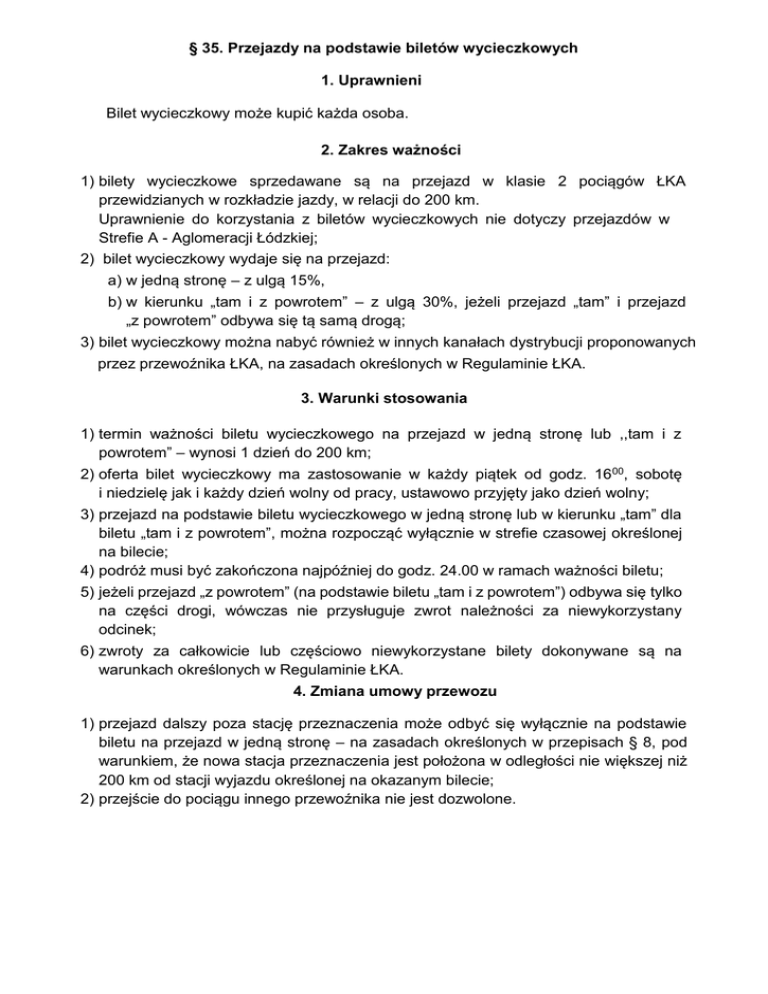 § 35. Przejazdy na podstawie biletów wycieczkowych 1. Uprawnieni Bilet wycieczkowy może kupić każda osoba. 2. Zakres ważności 1) bilety wycieczkowe sprzedawane są na przejazd w klasie 2 pociągów ŁKA przewidzianych w rozkładzie jazdy, w relacji do 200 km. Uprawnienie do korzystania z biletów wycieczkowych nie dotyczy przejazdów w Strefie A - Aglomeracji Łódzkiej; 2) bilet wycieczkowy wydaje się na przejazd: a) w jedną stronę – z ulgą 15%, b) w kierunku „tam i z powrotem” – z ulgą 30%, jeżeli przejazd „tam” i przejazd „z powrotem” odbywa się tą samą drogą; 3) bilet wycieczkowy można nabyć również w innych kanałach dystrybucji proponowanych przez przewoźnika ŁKA, na zasadach określonych w Regulaminie ŁKA. 3. Warunki stosowania 1) termin ważności biletu wycieczkowego na przejazd w jedną stronę lub ,,tam i z powrotem” – wynosi 1 dzień do 200 km; 2) oferta bilet wycieczkowy ma zastosowanie w każdy piątek od godz. 16 00, sobotę i niedzielę jak i każdy dzień wolny od pracy, ustawowo przyjęty jako dzień wolny; 3) przejazd na podstawie biletu wycieczkowego w jedną stronę lub w kierunku „tam” dla biletu „tam i z powrotem”, można rozpocząć wyłącznie w strefie czasowej określonej na bilecie; 4) podróż musi być zakończona najpóźniej do godz. 24.00 w ramach ważności biletu; 5) jeżeli przejazd „z powrotem” (na podstawie biletu „tam i z powrotem”) odbywa się tylko na części drogi, wówczas nie przysługuje zwrot należności za niewykorzystany odcinek; 6) zwroty za całkowicie lub częściowo niewykorzystane bilety dokonywane są na warunkach określonych w Regulaminie ŁKA. 4. Zmiana umowy przewozu 1) przejazd dalszy poza stację przeznaczenia może odbyć się wyłącznie na podstawie biletu na przejazd w jedną stronę – na zasadach określonych w przepisach § 8, pod warunkiem, że nowa stacja przeznaczenia jest położona w odległości nie większej niż 200 km od stacji wyjazdu określonej na okazanym bilecie; 2) przejście do pociągu innego przewoźnika nie jest dozwolone.