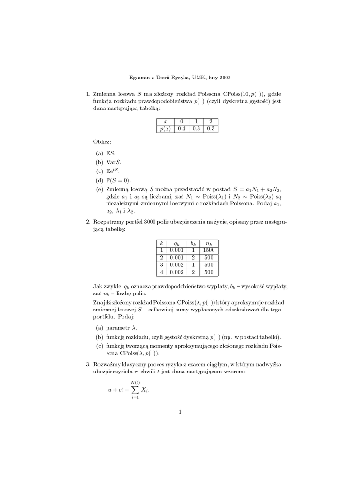 Egzamin z Teorii Ryzyka, UMK, luty 2008 1. Zmienna losowa S ma zªo»ony rozkªad Poissona funkcja rozkªadu prawdopodobie«stwa p( ) CPoiss(10, p( )), gdzie (czyli dyskretna g¦sto±¢) jest dana nast¦puj¡c¡ tabelk¡: x p(x) 0 1 2 0.4 0.3 0.3 Oblicz: (a) ES . (b) VarS . (c) EetS . (d) P(S = 0). (e) Zmienn¡ losow¡ gdzie a1 i a2 S S = a1 N1 + a2 N2 , N2 ∼ Poiss(λ2 ) s¡ Poissona. Podaj a1 , mo»na przedstawi¢ w postaci s¡ liczbami, za± N1 ∼ Poiss(λ1 ) niezale»nymi zmiennymi losowymi o rozkªadach i a2 , λ1 i λ2 . 2. Rozpatrzmy portfel 3000 polis ubezpieczenia na »ycie, opisany przez nast¦puj¡c¡ tabelk¦: k Jak zwykle, za± nk qk bk nk 1500 1 0.001 1 2 0.001 2 500 3 0.002 1 500 4 0.002 2 500 qk oznacza prawdopodobie«stwo wypªaty, bk wysoko±¢ wypªaty, liczb¦ polis. Znajd¹ zªo»ony rozkªad Poissona zmiennej losowej S CPoiss(λ, p( )) który aproksymuje rozkªad caªkowitej sumy wypªaconych odszkodowa« dla tego portfelu. Podaj: (a) parametr λ. (b) funkcj¦ rozkªadu, czyli g¦sto±¢ dyskretn¡ p( ) (np. w postaci tabelki). (c) funkcj¦ tworz¡c¡ momenty aproksymuj¡cego zªo»onego rozkªadu Poissona CPoiss(λ, p( )). 3. Rozwa»my klasyczny proces ryzyka z czasem ci¡gªym, w którym nadwy»ka ubezpieczyciela w chwili t jest dana nast¦puj¡cum wzorem: N (t) u + ct − X Xi . i=1 1 Jak zwykle zakªadamy, »e N (t) jest procesem Poissona z intensywno±ci¡ λ. Xi maj¡ rozkªad Rozpatrzmy szczególny przypadek, kiedy straty brutto µ, skupiony w punkcie czyli ( 0 P (x) = P(Xi ≤ x) = 1 Wiemy, »e λ = 2, c = 5 rekordu w dóª (denicja (a) (b) (c) dla dla x < µ; x ≥ µ. i µ = 2. Niech L1 L1 byªa podana na H(x) = P(L1 ≤ x). G(x) = P(L1 ≤ x|L1 < ∞). ψ(0) (prawdopodobie«stwo ruiny dla b¦dzie wielko±ci¡ pierwszego wykªadzie). Oblicz: u = 0). 4. Rozwa»my proces ryzyka z czasem dyskretnym, w którym nadwy»ka ubez- n pieczyciela w chwili jest dana nast¦puj¡cum wzorem: u − (Y1 + · · · + Yn ). Zakªadamy, »e Yi s¡ i.i.d. zmiennymi losowymi o rozkªadzie N(−1, 22 ). Asymptotyczne twierdzenie Craméra mówi, »e dla pewnych staªych (0, ∞) i r ∈ (0, ∞), prawdopodobie«stwo ruiny lim u→∞ (a) Oblicz ψ(u) a ∈ speªnia relacj¦ ψ(u) = a. e−ru r. (b) Która z nast¦puj¡cych relacji jest prawdziwa: • 0 < a < 1? • a = 1? • a > 1? (c) Podaj granic¦ ci¡gu zmiennych losowych n → ∞ (w sensie prawie na pewno jeden; u > 0 jest teraz ustalone). 5. Liczba roszcze« N u − (Y1 + · · · + Yn ) przy czyli z prawdopodobie«stwem jest zmienn¡ losow¡ o rozkªadzie Poissona Poiss(5). Ka»de ze zgªoszonych roszcze« jest, niezale»nie od pozostaªych, uwzgl¦dniane z prawdopodobie«stwem 0.2. Niech N1 0.8 lub odrzucone z prawdopodobie«stwem N0 liczb¦ oznacza liczb¦ roszcze« uwzgl¦dnionych, za± roszcze« odrzuconych. Podaj: (a) (b) (c) (d) (e) (f ) P(N0 = 0). P(N0 = 0|N = 5). P(N0 = 0|N1 = 4). E(N0 |N = 8). E(N0 |N1 = 7) E(N |N1 = 5). 2