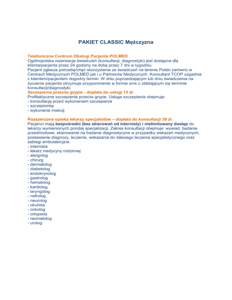 PAKIET CLASSIC Mężczyzna Telefoniczne Centrum Obsługi Pacjenta POLMED Ogólnopolska rezerwacja świadczeń (konsultacji, diagnostyki) jest dostępna dla klienta/pacjenta przez 24 godziny na dobę przez 7 dni w tygodniu. Pacjent zgłasza potrzebę/chęć skorzystania ze świadczeń na terenie Polski zarówno w Centrach Medycznych POLMED jak i u Partnerów Medycznych. Konsultant TCOP uzgadnia z klientem/pacjentem dogodny termin. W dniu poprzedzającym lub dniu świadczenia na życzenie pacjenta otrzymuje przypomnienie w formie sms o zbliżającym się terminie konsultacji/diagnostyki. Szczepienia przeciw grypie - dopłata do usługi 13 zł. Profilaktyczne szczepienie przeciw grypie. Usługa szczepienia obejmuje: - konsultację przed wykonaniem szczepienia - szczepionkę - wykonanie iniekcji . Rozszerzona opieka lekarzy specjalistów – dopłata do konsultacji 39 zł. Pacjenci mają bezpośredni (bez skierowań od internisty) i nielimitowany dostęp do lekarzy wymienionych poniżej specjalizacji. Zakres konsultacji obejmuje: wywiad, badanie przedmiotowe, skierowanie na badanie diagnostyczne w przypadku wskazań medycznych, postawienie diagnozy, leczenie, wskazania do dalszego leczenia specjalistycznego oraz zabiegi ambulatoryjne. - internista - lekarz medycyny rodzinnej - alergolog - chirurg - dermatolog - diabetolog - endokrynolog - gastrolog - hematolog - kardiolog - laryngolog - nefrolog - neurolog - okulista - onkolog - ortopeda - reumatolog - urolog Rozszerzone badania laboratoryjne i diagnostyczne Bezpłatne i nielimitowane wykonywanie badań diagnostycznych zleconych przez lekarza CM lub PM POLMED w zakresie: HEMATOLOGIA i KOAGULOLOGIA OB eozynofilia bezwzględna morfologia krwi płytki krwi retikulocyty leukocyty rozmaz krwi manualny antytrombina III (AT III) białko C (PC) czas kaolinowo-kefalinowy (APTT) czas protrombinowy - PT (z wartością INR) czas trombinowy (TT) D-dimery ilościowo Fibrynogen APTT ANALITYKA OGÓLNA badanie kału na obecność lamblii – ELISA badanie kału w kierunku jaj pasożytów badanie ogólne kału kał na resztki pokarmowe - skrobia, tłuszcze, włókna krew utajona w kale mocz - badanie ogólne mocz - badanie składu chemicznego kamienia moczowego mocz - liczba Addisa lub Hamburgera mocz – mikroalbuminuria posiew kału wymaz kału w kierunku owsików CHEMIA KLINICZNA albuminy białko całkowite bilirubina bezpośrednia (związana) bilirubina całkowita chlor cholinesteraza dehydrogenaza mleczanowa (LDH) diastaza w moczu (Amylaza) diastaza w surowicy (Amylaza) fosfataza alkaliczna – ALP fosfataza kwaśna – AcP fosfataza sterczowa - AcP-P fosfor w moczu fosfor w surowicy (P) gamma-glutamylo-traspeptydaza – GGTP glukoza krzywa wchłaniania glukozy po obciążeniu doustnym 50 g („0” i „60 min”) krzywa wchłaniania glukozy po obciążeniu doustnym 75 g („0” i „120 min”) jonogram (sód i potas) kinaza kreatynowa – CPK kreatynina w moczu kreatynina w surowicy krzywa cukrowa kwas moczowy lipaza lipoproteina a – Lp (a) magnez całkowity mocznik proteinogram transaminaza asparaginowa GOT/AspAT transaminaza alaninowa GPT/AlAT wapń w moczu wapń w surowicy (Ca) żelazo (Fe) DIAGNOSTYKA MIAŻDŻYCY cholesterol całkowity – TC HDL cholesterol (HDL-C) LDL-cholesterol (LDL-C) trójglicerydy – TG homocysteina lipidogram (TC, TG, HDL-C, LDL-C) trójglicerydy – TG BADANIA SEROLOGICZNE I DIAGNOSTYKA INFEKCJI antystreptolizyna "0" - ASO (miano) białko ostrej fazy - CRP (ilościowo) ceruloplazmina czynnik reumatoidalny - RF (test lateksowy) odczyn biernej hemaglutynacji krętków (TPHA) odczyn FTA-AB odczyn Waalera-Rosego (test hemaglutynacji) seromukoid VDRL – WR bordetella pertussis IgA bordetella pertussis IgG bordetella pertussis IgM borelioza - IgG/IgM bruceloza IgG bruceloza IgM chlamydia trachomatis PC IgA cytomegalowirus (CMV) - PC IgM test ilościowy cytomegalowirus (CMV) IgG - test ilościowy EBV IgG/IgM helicobacter pylori - PC IgG test ilościowy herpes Virus IgG (HSV IgG) herpes Virus IgM (HSV IgM) listerioza - test jakościowy mononukleoza - test lateksowy mykogram z oznaczeniem MIC mykoplazma pneumoniae IgG mykoplazma pneumoniae IgM przeciwciała anty Chlamydia Pneumoniae IgM przeciwciała anty Chlamydia Pneumoniae IgG przeciwciała anty Chlamydia trachomatis IgG - test jakościowy posiew moczu + antybiogram przeciwciała anty HIV1 / HIV 2 różyczka IgG - test ilościowy różyczka IgM - test jakościowy toksoplazmoza IgG - test ilościowy toksoplazmoza IgM - test jakościowy toxocaroza – IgG wymaz i posiew z wydalin, wydzielin oraz treści ran wymaz w kierunki Escherichia Coli - szczepy enteropatogenne wymaz w kierunku pałeczek jelitowych SS wymazy i posiewy ze skóry, błon śluzowych Yersinia - przeciwciała IgA, IgM, IgG DIAGNOSTYKA CUKRZYCY C- peptyd fruktozamina hemoglobina glikozylowana - HbA1c insulina DIAGNOSTYKA NIEDOKRWISTOŚCI ferrytyna kwas foliowy TIBC - całkowita zdolność wiązania żelaza transferyna witamina B12 OCENA STĘŻENIA LEKÓW digoksyna fenytoina karbamazepina kwas walproinowy teofilina DIAGNOSTYKA WIRUSOWEGO ZAPALENIA WĄTROBY – WZW wirus A przeciwciała p/Hepatitis A Virus (anty HAV) IgM, przeciwciała p/Hepatitis A Virus (anty HAV) Total wirus B przeciwciała anty HBe, antygen HBe, antygen HBs - test jakościowy, HBV-DNA (metoda PCR), przeciwciała anty HBs - test ilościowy, przeciwciała anty HBVc wirus C przeciwciała anty HCV DIAGNOSTYKA CHORÓB TARCZYCY anty - tyreoglobuliny - anty TG przeciwciała anty peroksydazie tarczycowej - anty TPO przeciwciała anty receptorom TSH Trójjodotyronina (T3) TSH III generacji tyroksyna (T4) wolne T3 - FT3 wolne T4 - FT4 HORMONY PŁCIOWE globulina wiążąca hormony płciowe – SHBG hormon folikulotropowy (FSH) progesteron prolaktyna (PRL) siarczan dehydroepiandrostendionu - DHEA-S testosteron INNE HORMONY 17 – KS adrenalina adrenalina - dobowa zbiórka moczu aldosteron aldosteron - dobowa zbiórka moczu androstendion hormon adrenokor