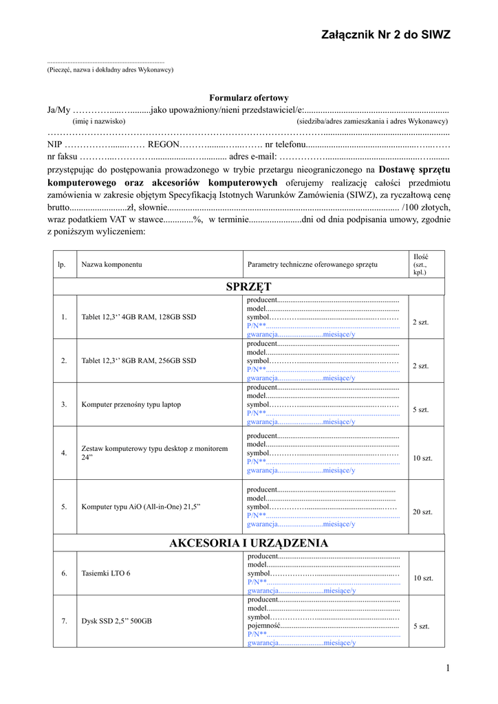Załącznik Nr 2 do SIWZ ...................................................................... (Pieczęć, nazwa i dokładny adres Wykonawcy) Formularz ofertowy Ja/My ………….....….........jako upoważniony/nieni przedstawiciel/e:............................................................... (imię i nazwisko) (siedziba/adres zamieszkania i adres Wykonawcy) ………………………………………………………………………………....................................................... NIP …………….......…… REGON………........…...……. nr telefonu................................................…...…… nr faksu ………...…………..................…........... adres e-mail: …………….........................................…......... przystępując do postępowania prowadzonego w trybie przetargu nieograniczonego na Dostawę sprzętu komputerowego oraz akcesoriów komputerowych oferujemy realizację całości przedmiotu zamówienia w zakresie objętym Specyfikacją Istotnych Warunków Zamówienia (SIWZ), za ryczałtową cenę brutto.........................zł, słownie..................................................................................................... /100 złotych, wraz podatkiem VAT w stawce.............%, w terminie.......................dni od dnia podpisania umowy, zgodnie z poniższym wyliczeniem: Ilość lp. Nazwa komponentu Parametry techniczne oferowanego sprzętu (szt., kpl.) SPRZĘT producent................................................................. model....................................................................... symbol…………........................................….…… P/N**....................................................................... gwarancja........................miesiące/y producent................................................................. model....................................................................... symbol…………........................................….…… P/N**....................................................................... gwarancja........................miesiące/y producent................................................................. model....................................................................... symbol…………........................................….…… P/N**....................................................................... gwarancja........................miesiące/y 1. Tablet 12,3‘’ 4GB RAM, 128GB SSD 2. Tablet 12,3‘’ 8GB RAM, 256GB SSD 3. Komputer przenośny typu laptop 4. Zestaw komputerowy typu desktop z monitorem 24” producent................................................................. model....................................................................... symbol…………........................................….…… P/N**....................................................................... gwarancja........................miesiące/y Komputer typu AiO (All-in-One) 21,5” producent............................................................... model..................................................................... symbol……………........................................…… P/N**....................................................................... gwarancja........................miesiące/y 5. 2 szt. 2 szt. 5 szt. 10 szt. 20 szt. AKCESORIA I URZĄDZENIA 6. Tasiemki LTO 6 7. Dysk SSD 2,5’’ 500GB producent................................................................. model....................................................................... symbol…………….…........................................… P/N**....................................................................... gwarancja........................miesiące/y producent................................................................. model....................................................................... symbol…………….…........................................… pojemność............................................................... P/N**....................................................................... gwarancja........................miesiące/y 10 szt. 5 szt. 1 Załącznik Nr 2 do SIWZ 8. Dysk przenośny 2 TB USB 3.0 9. Pamięć przenośna pendrive USB 3.0 o pojemności min. 128GB 10. Pamięć RAM 1 x 4 GB, DDR2 dedykowana do komputerów HP DC 7800 11. Pamięć RAM 1 x 4 GB, DDR3 dedykowana do komputerów HP Compaq 8000 12. Słuchawki przewodowe z mikrofonem 13. Głośniki przewodowe 14. Drukarka przenośna do laptopa 15. Mysz optyczna USB 16. Klawiatura USB producent................................................................. model....................................................................... symbol…………….…........................................… P/N**....................................................................... gwarancja........................miesiące/y producent................................................................. model....................................................................... symbol…………….…........................................… pojemność............................................................... P/N**....................................................................... gwarancja........................miesiące/y producent................................................................. model....................................................................... symbol…………….…........................................… P/N**....................................................................... gwarancja........................miesiące/y producent ................................................................. model....................................................................... symbol…………….…............