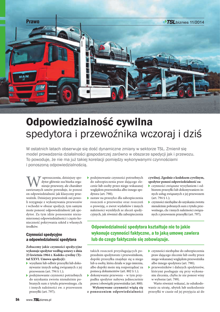 Prawo Fot. MAN TSL biznes 11/2014 2GSRZLHG]LDOQRŒýF\ZLOQD VSHG\WRUDLSU]HZRŬQLNDZF]RUDMLG]LŒ :RVWDWQLFKODWDFKREVHUZXMHVLĘGRŒýG\QDPLF]QH]PLDQ\ZVHNWRU]H76/=PLHQLâVLĘ PRGHOSURZDG]HQLDG]LDâDOQRŒFLJRVSRGDUF]HM]DUyZQRZREV]DU]HVSHG\FMLMDNLSU]HZR]X 7RSRZRGXMHŮHQLHPDMXŮWDNLHMNRUHODFMLSRPLĘG]\Z\NRQ\ZDQ\PLF]\QQRŒFLDPL LSRQRV]RQĉRGSRZLHG]LDOQRŒFLĉ W uproszczeniu, dzisiejszy spedytor głównie zza biurka organizuje przewozy, ale charakter zawieranych umów powoduje, że ponosi on odpowiedzialność jak klasyczny przewoźnik. Dzisiejszy przewoźnik zaś powoli rezygnuje z wykonywania przewozów i wchodzi w obszar spedycji, tym samym może ponosić odpowiedzialność jak spedytor. Za tym idzie ponoszenie niezamierzonej odpowiedzialności i często konieczność pokrywania szkód z własnych środków. &]\QQRŒFLVSHG\F\MQH DRGSRZLHG]LDOQRŒýVSHG\WRUD Zobaczmy jakie czynności spedycyjne wykonuje spedytor według ustawy z dnia 23 kwietnia 1964 r. Kodeks cywilny (Tytuł XXVI. Umowa spedycji): > wysyłanie lub odbiór przesyłki lub dokonywanie innych usług związanych z jej przewozem (art. 794 § 1.); > podejmowanie czynności potrzebnych do uzyskania zwrotu nienależnie pobranych sum z tytułu przewoźnego, cła i innych należności zw. z przewozem przesyłki (art. 797); 54 www.TSL biznes.pl > podejmowanie czynności potrzebnych do zabezpieczenia praw dającego zlecenie lub osoby przez niego wskazanej względem przewoźnika albo innego spedytora (art. 798); > zastaw na przesyłce dla zabezpieczenia roszczeń o przewoźne oraz roszczeń o prowizję, o zwrot wydatków i innych należności wynikłych ze zleceń spedycyjnych, jak również dla zabezpieczenia cywilnej. Zgodnie z kodeksem cywilnym, spedytor ponosi odpowiedzialność za: > czynności związane wysyłaniem i odbiorem przesyłki lub dokonywaniem innych usług związanych z jej przewozem (art. 794 § 1.); > czynności niezbędne do uzyskania zwrotu nienależnie pobranych sum z tytułu przewoźnego, cła i innych należności związanych z przewozem przesyłki (art. 797); 2GSRZLHG]LDOQRŒýVSHG\WRUDNV]WDâWXMHQLHWRMDNLH Z\NRQXMHF]\QQRŒFLIDNW\F]QHDWRMDNĉXPRZĘ]DZLHUD OXEGRF]HJRIDNW\F]QLHVLĘ]RERZLĉ]XMH takich roszczeń przysługujących poprzednim spedytorom i przewoźnikom, dopóki przesyłka znajduje się u niego lub u osoby, która działa w jego imieniu, albo dopóki może nią rozporządzać za pomocą dokumentów (art. 802 § 1.); > dokonywanie przewozu – w tym przypadku spedytor nabywa jednocześnie prawa i obowiązki przewoźnika (art. 800). Wykonywane czynności wiążą się z ponoszeniem odpowiedzialności > czynności niezbędne do zabezpieczenia praw dającego zlecenie lub osoby przez niego wskazanej względem przewoźnika albo innego spedytora (art. 798); > przewoźników i dalszych spedytorów, którymi posługuje się przy wykonaniu zlecenia, chyba że nie ponosi winy w wyborze (art. 799). Warto również wskazać, że odszkodowanie za utratę, ubytek lub uszkodzenie przesyłki w czasie od jej przyjęcia aż do Prawo TSL biznes 11/2014 wydania przewoźnikowi, dalszemu spedytorowi, dającemu zlecenie lub osobie przez niego wskazanej, nie może przewyższać zwykłej wartości przesyłki, chyba że szkoda wynikła z winy umyślnej lub rażącego niedbalstwa spedytora (art. 801). Po wejściu w życie tej ustawy, to jest od dnia 21.10.2005 r. ustawodawca wprowadził w obszar transportu pośrednika przy przewozie rzeczy, który miał zastąpić ówczesnego spedytora. Ustawodawca nie wprowadził za tym żadnych szczególnych &]ĘVWRMHG\Q\PXEH]SLHF]HQLHPMDNLPG\VSRQXMĉ VSHG\WRU]\MHVWNODV\F]QH2&VSHG\WRUDNWyUH DVHNXUXMHLFKRGSRZLHG]LDOQRŒý]DOHGZLHZFD JG\ŮW\OHMHVWXPyZVSHG\F\MQ\FKZLFKSRUWIHOX regulacji, choć środowisko TSL zastanawiało się, co tak naprawdę się z tym wiąże. Spedytor dziś, to tak naprawdę ... przewoźnik umowny, który ponosi odpowiedzialność analogiczną jak przewoźnik. Dodatkowo, dzisiejszy spedytor to przewoźnik umowny, który ponosi odpowie- 7RF]\NWRŒMHVWSU]HZRŬQLNLHPSU]HZRŬQLNLHP XPRZQ\PÅVSHG\WRUHPXPRZQ\PµF]\VSHG\WRUHP ]DOHŮ\RGFKDUDNWHUX]DZLHUDQ\FKXPyZDGRNâDGQLHM ]RERZLĉ]DĽMDNLH]DFLĉJDQDLFKSRGVWDZLH dzialność również za wykonywane przewozy kabotażowe. I na powyższe nie ma wpływu fakt, że taki „spedytor” wykonuje jedynie działalność gospodarczą w zakresie pośrednictwa przy przewozie rzeczy. Jego odpowiedzialność wynika z umów jakie zawiera. Reasumując, odpowiedzialność rażącego niedbalstwa, które niewątpliwie zostanie spedytorowi zarzucone jeżeli zleci przewóz przewoźnikowi nie gwarantującemu należytego wykonania przewozu lub wręcz oszustowi. Dodatkowo, jednym z głównych wyłączeń jest wydanie towaru osobie nieuprawnionej (głównie oszustowi, )RW5HQDXOW Należy jednak pamiętać, że... odpowiedzialność spedytora kształtuje nie to jakie wykonuje czynności faktyczne, a to jaką umowę zawiera lub do czego faktycznie się zobowiązuje. Spedytor nie będzie zatem ponosił odpowiedzialności jak spedytor (wynikającej z kodeksu cywilnego) w sytuacji, gdy z zamawiającym usługę (zleceniodawcą) zawrze umowę przewozu lub w umowie spedycji zobowiąże się do wykonania przewozu. Będzie ponosił odpowiedzialność jak klasyczny przewoźnik, gdyż taki będzie skutek wynikający z zawartej umowy przewozu. Spedytor przedwczoraj, to... spedytor. Zajmował się wszystkim, co było związane z wysyłaniem i odbiorem przesyłki, a nie tylko z organizacją samego przewozu. W jego gestii była cała operacja logistyczna związana z przemieszczaniem przesyłki. W zakresie jego obowiązków, oprócz zorganizowania przewozu, było m. in. uzgodnienie z zamawiającym warunków, przygotowanie dokumentacji wysyłkowej, nadzór nad załadunkiem i przebiegiem przewozu oraz dbałość o dostarczenie przesyłki do odbiorcy wskazanego przez zamawiającego. Jedynym ułatwieniem było to, że inny był terytorialny zasięg działalności, co wynikało z ówcz