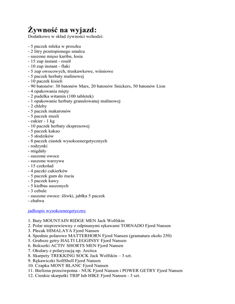 Żywność na wyjazd: Dodatkowo w skład żywności wchodzi: - 5 paczek mleka w proszku - 2 litry przetopionego smalcu - suszone mięso karibu, łosia - 15 zup instant - rosół - 10 zup instant - flaki - 5 zup owocowych, truskawkowe, wiśniowe - 5 paczek herbaty malinowej - 10 paczek kisieli - 90 batonów: 30 batonów Mars, 20 batonów Snickers, 50 batonów Lion - 4 opakowania mięty - 2 pudelka witamin (100 tabletek) - 1 opakowanie herbaty granulowanej malinowej - 2 chleby - 5 paczek makaronów - 5 paczek musli - cukier - 1 kg - 10 paczek herbaty ekspresowej - 5 paczek kakao - 5 słodzików - 8 paczek ciastek wysokoenergetycznych - rodzynki - migdały - suszone owoce - suszone warzywa - 15 czekolad - 4 paczki cukierków - 5 paczek gum do żucia - 5 paczek kawy - 5 kiełbas suszonych - 3 cebule - suszone owoce: śliwki, jabłka 5 paczek - chałwa jadlospis wysokoenergetyczny 1. Buty MOUNTAIN RIDGE MEN Jack Wolfskin 2. Polar nieprzewiewny z odpinanymi rękawami TORNADO Fjord Nansen 3. Plecak HIMALAYA Fjord Nansen 4. Spodnie polarowe MATTERHORN Fjord Nansen (gramatura około 250) 5. Grubsze getry HALTI LEGGINSY Fjord Nansen 6. Bokserki ACTIV SHORTS MEN Fjord Nansen 7. Okulary z polaryzacją np. Arctica 8. Skarpety TREKKING SOCK Jack Wolfskin – 3 szt. 9. Rękawiczki SoftShell Fjord Nansen 10. Czapka MONT BLANC Fjord Nansen 11. Bielizna przeciwpotna - NUK Fjord Nansen i POWER GETRY Fjord Nansen 12. Cienkie skarpetki TRIP lub HIKE Fjord Nansen - 3 szt. 13. Kubek termiczny Fjord Nansen 14. Termosy Fjord Nansen 1l. 15. Spodnie Milo np. Lukka 16. Mapnik 17. Ogrzewacze 18. Rozpałka 19. Peleryna Fjord Nansen 20. Karabinki – 3 szt. 21. Kije MARBLE Fjord Nansen 22. Pokrowiec na plecak Fjord Nansen 23. Worek Extra Dry Bag 30l 24. Kurtka TRAIL GUIDE JACKET GORE-TEX Jack Wolfskin 25. Latarka Duo Belt LED 14 Petzl Zywnosc sugerowna Ziemniaczki HOT-POT z wołowiną i warzywami -4 sztuk WOŁOWINA, makaron, pieczarki -4 sztuk WOŁOWINA PO WĘGIERSKU z makaronem 4 sztuk RISOTTO z warzywami i pieczarkami 3 sztuki Spagetti NAPOLI w sosie pomidorowym 5 sztuk SPAGETTI w sosie śmietanowym z ziołami 5 sztuk GROSZEK Z CEBULKĄ, puree ziemniaczane 4 sztuk Kasza KUSKUS z warzywami i rodzynkami -3 sztuki Ziemniaczki HOT-POT z tofu i warzywami 5 sztuk Spagetti BELLA ITALIA w sosie serowym 5 sztuk Spagetti CARBONARA z szynką 5 sztuk BEEF STROGANOF, wołowiną z ryżem, pieczarki 2 sztuki CHICKEN CURRY - kurczak z ryżem w sosie curry 3 sztuki CHICKEN RISOTTO kurczak z ryżem i warzywami 2 sztuki CHILI CON CARNE z wołowina i czerwoną fasolką kidney 2 sztuki Razem 56 sztuk paczek pojedynczych