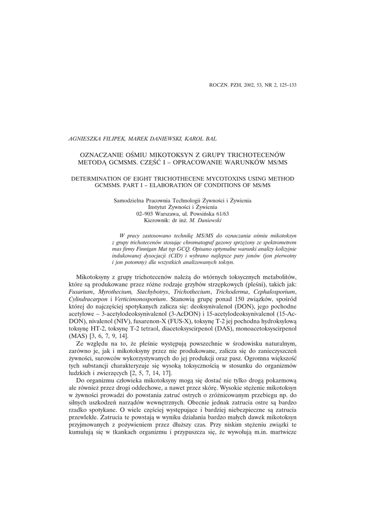 ROCZN. PZH, 2002, 53, NR 2, 125–133 AGNIESZKA FILIPEK, MAREK DANIEWSKI, KAROL BAL OZNACZANIE OŚMIU MIKOTOKSYN Z GRUPY TRICHOTECENÓW METODĄ GCMSMS. CZĘŚĆ I – OPRACOWANIE WARUNKÓW MS/MS DETERMINATION OF EIGHT TRICHOTHECENE MYCOTOXINS USING METHOD GCMSMS. PART I – ELABORATION OF CONDITIONS OF MS/MS Samodzielna Pracownia Technologii Żywności i Żywienia Instytut Żywności i Żywienia 02–903 Warszawa, ul. Powsińska 61/63 Kierownik: dr inż. M. Daniewski W pracy zastosowano technikę MS/MS do oznaczania ośmiu mikotoksyn z grupy trichotecenów stosując chromatograf gazowy sprzężony ze spektrometrem mas firmy Finnigan Mat typ GCQ. Opisano optymalne warunki analizy kolizyjnie indukowanej dysocjacji (CID) i wybrano najlepsze pary jonów (jon pierwotny i jon potomny) dla wszystkich analizowanych toksyn. Mikotoksyny z grupy trichotecenów należą do wtórnych toksycznych metabolitów, które są produkowane przez różne rodzaje grzybów strzępkowych (pleśni), takich jak: Fusarium, Myrothecium, Stachybotrys, Trichothecium, Trichoderma, Cephalosporium, Cylindracarpon i Verticimonosporium. Stanowią grupę ponad 150 związków, spośród której do najczęściej spotykanych zalicza się: deoksynivalenol (DON), jego pochodne acetylowe – 3-acetylodeoksynivalenol (3-AcDON) i 15-acetylodeoksynivalenol (15-AcDON), nivalenol (NIV), fusarenon-X (FUS-X), toksynę T-2 jej pochodna hydroksylową toksynę HT-2, toksynę T-2 tetraol, diacetoksyscirpenol (DAS), monoacetoksyscirpenol (MAS) [3, 6, 7, 9, 14]. Ze względu na to, że pleśnie występują powszechnie w środowisku naturalnym, zarówno je, jak i mikotoksyny przez nie produkowane, zalicza się do zanieczyszczeń żywności, surowców wykorzystywanych do jej produkcji oraz pasz. Ogromna większość tych substancji charakteryzuje się wysoką toksycznością w stosunku do organizmów ludzkich i zwierzęcych [2, 5, 7, 14, 17]. Do organizmu człowieka mikotoksyny mogą się dostać nie tylko drogą pokarmową ale również przez drogi oddechowe, a nawet przez skórę. Wysokie stężenie mikotoksyn w żywności prowadzi do powstania zatruć ostrych o zróżnicowanym przebiegu np. do silnych uszkodzeń narządów wewnętrznych. Obecnie jednak zatrucia ostre są bardzo rzadko spotykane. O wiele częściej występujące i bardziej niebezpieczne są zatrucia przewlekłe. Zatrucia te powstają w wyniku działania bardzo małych dawek mikotoksyn przyjmowanych z pożywieniem przez dłuższy czas. Przy niskim stężeniu związki te kumulują się w tkankach organizmu i przypuszcza się, że wywołują m.in. martwicze 126 A. Filipek, M. Daniewski, K. Bal Nr 2 zmiany w obrębie jamy ustnej, przełyku, żołądka, leukopemię i są przyczyną wysokiej umieralności [1, 2, 6, 8, 9, 10, 11, 15] Dokładność, szybkość i skuteczność jest niezwykle ważna w oznaczaniu poziomu zanieczyszczeń toksynami w żywności i paszach. Do ostatecznego rozdziału oraz jakościowej i ilościowej identyfikacji mikotoksyn z grupy trichotecenów stosuje się różne metody analityczne. Większość z nich bazuje na technice chromatografii cienkowarstwowej (TLC) i wysokosprawnej chromatografii cieczowej (HPLC) z detektorem UV lub fluoroscencyjnym. Metoda TLC jest niedostatecznie selektywna i czuła. Metoda HPLC również ma ograniczoną czułość. Nadaje się wyłącznie do oznaczania wysokich i bardzo wysokich stężeń trichotecenów [4, 6, 9, 11, 13, 15]. Także metody immunologiczne takie jak EIA (enzyme immuno assay) i ELISA (enzyme linked immunosorbent assay), które rozwinęły się w ostatnim czasie, nie dają całkowitej pewności pod względem ilościowym [(4, 6, 9, 11, 13, 15]. W ostatnich latach coraz powszechniejsze staje się oznaczanie trichotecenów przy pomocy chromatografii gazowej. Wykorzystanie wysokorozdzielczych kolumn kapilarnych wraz z zastosowaniem optymalnych systemów detekcji (ECD, MS) pozwala osiągnąć zadowalający poziom selektywności i czułości w analizie trichotecenów. W analizie śladowej nie bez znaczenia jest rodzaj stosowanego detektora. W celu stworzenia znacznie czulszego układu, pozwalającego z bardzo wysokim prawdopodobieństwem zidentyfikować pod względem jakościowym związki zawarte w próbce, stosuje się chromatograf gazowy połączony ze spektrometrem mas (GC/MS). Podstawową zasadą spektrometrii mas jest wytwarzanie, rozdzielanie i wykrywanie jonów ze związków chemicznych, w funkcji stosunku ich masy do ładunku (m/z). Związki opuszczające kolumnę chromatografu gazowego są wprowadzane do komory (wysoka próżnia ok. 10-7 Tora) i tam ulegają jonizacji. Jony te najczęściej powstają w wyniku zderzenia analizowanych związków ze strumieniem elektronów (elektron impact – EI), wytwarzanych przez żarzące się włókno wolframowe lub renowe. Jony są oddzielane od siebie (następuje fragmentacja) w analizatorze masowym, w zależności od stosunku ich masy do ładunku (m/z), a następnie rejestrowane przez powielacz elektronów. W ten sposób działa typowy analizator, tzw. kwadrupol [12, 16]. Znacznie lepszym analizatorem do analiz śladowych jest pułapka jonowa. Działanie pułapki polega na tym, że po wprowadzeniu jonów do komory jonizacyjnej, powstają jony, które następnie są stabilizowane przez odpowiedni potencjał elektrody centralnej. Zwiększanie tego potencjału powoduje wyrzucenie jonów z komory, kolejno od mas najniższych do najwyższych. Następnie są one wykrywane, wzmacniane i rejestrowane przez układ przetwarzania danych. Tak więc w pułapce jonowej tworzenie jonów i ich detekcja odbywa się w tej samej komorze, co znakomicie zwiększa czułość układu analitycznego [16]. Po takiej analizie otrzymujemy widmo mas (TIC – całkowity prąd jonowy), składające się z pojedynczych jonów powstałych w wyniku rozpadu cząsteczki związku chemicznego. Dzięki komputerowemu systemowi przetwarzania danych możemy określić ich skład. Identyfikację nieznanych związ