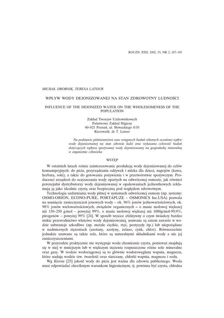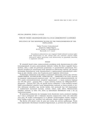 ROCZN. PZH, 2002, 53, NR 2, 187–195 MICHAŁ DROBNIK, TERESA LATOUR WPŁYW WODY DEJONIZOWANEJ NA STAN ZDROWOTNY LUDNOŚCI INFLUENCE OF THE DEIONIZED WATER ON THE WHOLESOMENESS OF THE POPULATION Zakład Tworzyw Uzdrowiskowych Państwowy Zakład Higieny 60–821 Poznań, ul. Słowackiego 8/10 Kierownik: dr T. Latour Na podstawie piśmiennictwa oraz wstępnych badań własnych oceniono wpływ wody dejonizowanej na stan zdrowia ludzi oraz wykazano celowość badań dotyczących wpływu spożywanej wody dejonizowanej na gospodarkę mineralną w organizmie człowieka WSTĘP W ostatnich latach rośnie zainteresowanie produkcją wody dejonizowanej do celów konsumpcyjnych: do picia, przyrządzania odżywek i mleka dla dzieci, napojów (kawa, herbata, soki), a także do gotowania pożywienia i w przetwórstwie spożywczym. Producenci urządzeń do oczyszczania wody opartych na odwróconej osmozie, jak również potencjalni dystrybutorzy wody dejonizowanej w opakowaniach jednostkowych reklamują ją jako idealnie czystą oraz bezpieczną pod względem zdrowotnym. Technologia uzdatniania wody pitnej w systemach odwróconej osmozy (np. systemy: OSMO-ORION, ECONO-PURE, PORTAPUZE – OSMONICS Inc.USA) pozwala na usunięcie zanieczyszczeń jonowych wody – ok. 96% jonów jednowartościowych, ok. 98% jonów wielowartościowych, związków organicznych – o masie molowej większej niż 150–250 g/mol – powyżej 99%, o masie molowej większej niż 1000g/mol-99,9%, pirogenów – powyżej 99% [24]. W sposób wysoce efektywny o czym świadczy bardzo niskie przewodnictwo właściwe wody dejonizowanej, usuwane są zatem zawarte w wodzie substancje szkodliwe (np. metale ciężkie, rtęć, pestycydy itp.) lub niepożądane w nadmiernych stężeniach (azotany, azotyny, żelazo, cynk, chlor). Równocześnie jednakże usuwane są także sole, które są naturalnymi składnikami wody a nie jej zanieczyszczeniami. W przyrodzie praktycznie nie występuje woda chemicznie czysta, ponieważ znajdują się w niej w mniejszym lub w większym stężeniu rozpuszczone różne sole mineralne oraz gazy. W wodzie wodociągowej są to głównie wodorowęglany wapnia, magnezu, które nadają wodzie tzw. twardość oraz siarczany, chlorki wapnia, magnezu i sodu. Wg Kiersta [25] jakość wody do picia jest ważna dla zdrowia publicznego. Woda musi odpowiadać określonym warunkom higienicznym, tj. powinna być czysta, chłodna 188 M. Drobnik, T. Latour Nr 2 i w miarę twarda. Tymczasem twardość wody dejonizowanej spada praktycznie do zera. Wg aktualnego Rozporządzenia Ministra Zdrowia [56] twardość wody przeznaczonej do picia powinna wynosić minimum 60 mg/dm3 CaCO3. Mason i wsp. [39] stwierdzają, że śmiertelność z powodu chorób naczyń serca jest wyższa o ok. 20% u osób pijących tzw. wodę miękką. O korelacji między ciśnieniem tętniczym a twardością wody pitnej donoszą Pasternak [49] oraz Walasek [77]. Woda uboga w wapń i magnez (woda miękka) wpływa na postępujące zubożenie ustroju w magnez [78]. Spożywanie wody wolnej od elektrolitów prowadzi do zmian stałości składu elektrolitowego płynu pozakomórkowego [6]. W związku z powyższym powstaje pytanie czy stała konsumpcja przy normalnej diecie wyłącznie wody całkowicie zdemineralizowanej zamiast wody np. wodociągowej nie wiąże się z ryzykiem zdrowotnym i nie doprowadzi do zaburzeń w gospodarce mineralnej ustroju i zubożenia organizmu w biopierwiastki. W krajowych czasopismach naukowych poświęconych żywieniu i żywności, ochronie zdrowia i środowiska nie znaleziono doniesienia dotyczącego biologicznych właściwości wody dejonizowanej. Z komputerowego wyciągu uzyskanego z : Centralnego katalogu bibliotek medycznych, Centralnego katalogu Biblioteki Narodowej, Środowiskowego katalogu bibliotek poznańskich oraz Wykazu czasopism Polskiej Fundacji Upowszechniania Nauki, obejmującego wykaz czasopism za okres 1969–2000 r., wynika, że dotychczas opublikowano zaledwie 20 prac dotyczących biologicznych właściwości wody dejonizowanej. Spośród nich większość dotyczyła badań na zwierzętach tj. małżach i rybach [8, 43, 44, 54, 79], szczurach [30] oraz psach [21, 23]. Nie znaleziono doniesień na temat skutków zdrowotnych długotrwałego picia wody dejonizowanej przez ludzi co jest przedmiotem naszego zainteresowania. Niedobory biopierwiastków w organizmie i ich skutki Dla prawidłowego funkcjonowania organizmu niezbędne jest dostarczenie mu odpowiednich składników odżywczych, w tym również składników mineralnych. Sole mineralne dostarczane do organizmu człowieka z pożywieniem mogą być przyswajane i wykorzystywane w stopniu zależnym od szeregu czynników związanych z cechami organizmu, ilością i specjacją przyswajanego pierwiastka. Istotną rolę odgrywają także wzajemne oddziaływania różnych pierwiastków wynikające z podobieństwa w ich właściwościach chemicznych lub powinowactwa do tych samych tkanek czy przenośników. Z badań Rafalskiego i Śwtoniaka [53] wynika, że zawartość niezbędnych dla organizmu człowieka składników mineralnych w pożywieniu nie jest ustabilizowana i podlega znacznym wahaniom w zależności od pochodzenia żywności i jej przetwarzania. Podstawowym źródłem składników mineralnych dla organizmu jest pożywienie, a tylko około 10% dziennego zapotrzebowania na sole mineralne pokrywane jest przez substancje dostarczone z wodą do picia. Stosunek pobrania pierwiastków z wodą do picia (ok. 2 l dziennie) oraz z wodą i żywnością wynosi wg Nikonorowa [41] np.: dla wapnia 100:800, magnezu 40:210. Jednak mimo, że środki spożywcze zawierają niektóre składniki mineralne w większym stężeniu, z wody organizm przyswaja je znacznie efektywniej. Wpływa na to postać chemiczna pierwiastków oraz stopień dysocjacji ich połączeń rozpuszczonych w wodzie, a także współobecność innych wielu mikroelementów działających synergistycznie. Nr 2 Wływ wo