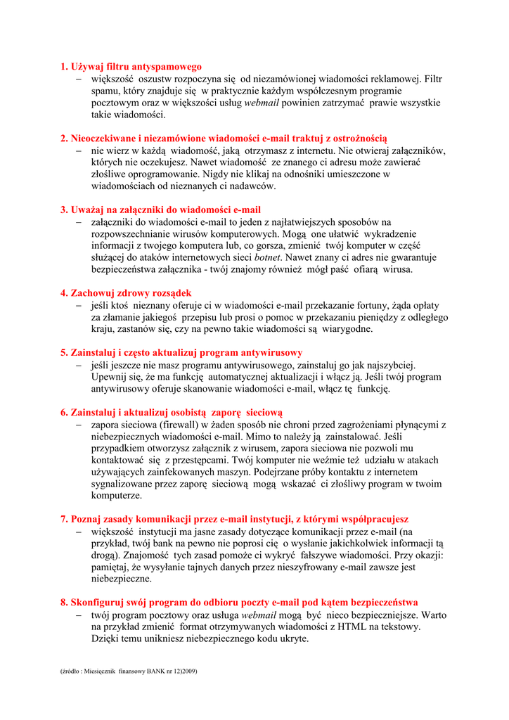 1. UŜywaj filtru antyspamowego − większość oszustw rozpoczyna się od niezamówionej wiadomości reklamowej. Filtr spamu, który znajduje się w praktycznie kaŜdym współczesnym programie pocztowym oraz w większości usług webmail powinien zatrzymać prawie wszystkie takie wiadomości. 2. Nieoczekiwane i niezamówione wiadomości e-mail traktuj z ostroŜnością − nie wierz w kaŜdą wiadomość, jaką otrzymasz z internetu. Nie otwieraj załączników, których nie oczekujesz. Nawet wiadomość ze znanego ci adresu moŜe zawierać złośliwe oprogramowanie. Nigdy nie klikaj na odnośniki umieszczone w wiadomościach od nieznanych ci nadawców. 3. UwaŜaj na załączniki do wiadomości e-mail − załączniki do wiadomości e-mail to jeden z najłatwiejszych sposobów na rozpowszechnianie wirusów komputerowych. Mogą one ułatwić wykradzenie informacji z twojego komputera lub, co gorsza, zmienić twój komputer w część słuŜącej do ataków internetowych sieci botnet. Nawet znany ci adres nie gwarantuje bezpieczeństwa załącznika - twój znajomy równieŜ mógł paść ofiarą wirusa. 4. Zachowuj zdrowy rozsądek − jeśli ktoś nieznany oferuje ci w wiadomości e-mail przekazanie fortuny, Ŝąda opłaty za złamanie jakiegoś przepisu lub prosi o pomoc w przekazaniu pieniędzy z odległego kraju, zastanów się, czy na pewno takie wiadomości są wiarygodne. 5. Zainstaluj i często aktualizuj program antywirusowy − jeśli jeszcze nie masz programu antywirusowego, zainstaluj go jak najszybciej. Upewnij się, Ŝe ma funkcję automatycznej aktualizacji i włącz ją. Jeśli twój program antywirusowy oferuje skanowanie wiadomości e-mail, włącz tę funkcję. 6. Zainstaluj i aktualizuj osobistą zaporę sieciową − zapora sieciowa (firewall) w Ŝaden sposób nie chroni przed zagroŜeniami płynącymi z niebezpiecznych wiadomości e-mail. Mimo to naleŜy ją zainstalować. Jeśli przypadkiem otworzysz załącznik z wirusem, zapora sieciowa nie pozwoli mu kontaktować się z przestępcami. Twój komputer nie weźmie teŜ udziału w atakach uŜywających zainfekowanych maszyn. Podejrzane próby kontaktu z internetem sygnalizowane przez zaporę sieciową mogą wskazać ci złośliwy program w twoim komputerze. 7. Poznaj zasady komunikacji przez e-mail instytucji, z którymi współpracujesz − większość instytucji ma jasne zasady dotyczące komunikacji przez e-mail (na przykład, twój bank na pewno nie poprosi cię o wysłanie jakichkolwiek informacji tą drogą). Znajomość tych zasad pomoŜe ci wykryć fałszywe wiadomości. Przy okazji: pamiętaj, Ŝe wysyłanie tajnych danych przez nieszyfrowany e-mail zawsze jest niebezpieczne. 8. Skonfiguruj swój program do odbioru poczty e-mail pod kątem bezpieczeństwa − twój program pocztowy oraz usługa webmail mogą być nieco bezpieczniejsze. Warto na przykład zmienić format otrzymywanych wiadomości z HTML na tekstowy. Dzięki temu unikniesz niebezpiecznego kodu ukryte. (źródło : Miesięcznik finansowy BANK nr 12)2009)