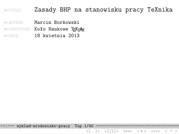 #+TITLE: Zasady BHP na stanowisku pracy TeXnika #+AUTHOR: Marcin Borkowski Koło Naukowe TEXUAM 18 kwietnia 2013 #+INSTITUTE: #+DATE: --:--- wyklad-srodowisko-pracy Top 1/40 -----------------------------------<[ ]> <[[]]> <**> < * > <<>> < ? > #+TITLE: Zasady BHP na stanowisku pracy TeXnika #+AUTHOR: Marcin Borkowski Koło Naukowe TEXUAM 18 kwietnia 2013 #+INSTITUTE: #+DATE: *Uwaga* Podczas dzisiejszego spotkania, określeń ,,środowisko pracy’’ i ,,edytor tekstu’’ będę używał zamiennie. --:--- wyklad-srodowisko-pracy 1% 1/40 -----------------------------------<[ ]> <[[]]> <**> < * > <<>> < ? > #+TITLE: Zasady BHP na stanowisku pracy TeXnika #+AUTHOR: Marcin Borkowski Koło Naukowe TEXUAM 18 kwietnia 2013 #+INSTITUTE: #+DATE: *Uwaga* Podczas dzisiejszego spotkania, określeń ,,środowisko pracy’’ i ,,edytor tekstu’’ będę używał zamiennie. Innymi słowy, pomijam kwestie wyboru fotela, klawiatury, systemu operacyjnego czy przeglądarki plików pdf. --:--- wyklad-srodowisko-pracy 1% 1/40 -----------------------------------<[ ]> <[[]]> <**> < * > <<>> < ? > #+TITLE: Zasady BHP na stanowisku pracy TeXnika #+AUTHOR: Marcin Borkowski Koło Naukowe TEXUAM 18 kwietnia 2013 #+INSTITUTE: #+DATE: *Uwaga* Podczas dzisiejszego spotkania, określeń ,,środowisko pracy’’ i ,,edytor tekstu’’ będę używał zamiennie. Innymi słowy, pomijam kwestie wyboru fotela, klawiatury, systemu operacyjnego czy przeglądarki plików pdf. Nie znaczy to, że są one nieistotne! --:--- wyklad-srodowisko-pracy 2% 1/40 -----------------------------------<[ ]> <[[]]> <**> < * > <<>> < ? > Dysklejmer Jak pokazuje doświadczenie, kwestia wyboru edytora tekstów jest niezmiernie delikatna. --:--- wyklad-srodowisko-pracy 3% 2/40 -----------------------------------<[ ]> <[[]]> <**> < * > <<>> < ? > Dysklejmer Jak pokazuje doświadczenie, kwestia wyboru edytora tekstów jest niezmiernie delikatna. Dlatego na początku uważam za konieczne podkreślenie, że to, co będę prezentował podczas wykładu, to moje osobiste opinie na ten temat. --:--- wyklad-srodowisko-pracy 3% 2/40 -----------------------------------<[ ]> <[[]]> <**> < * > <<>> < ? > Dysklejmer Jak pokazuje doświadczenie, kwestia wyboru edytora tekstów jest niezmiernie delikatna. Dlatego na początku uważam za konieczne podkreślenie, że to, co będę prezentował podczas wykładu, to moje osobiste opinie na ten temat. Inna sprawa, że słuszne. ;-) --:--- wyklad-srodowisko-pracy 4% 2/40 -----------------------------------<[ ]> <[[]]> <**> < * > <<>> < ? > Rozkład jazdy * Wstęp * Fakty i mity * Jak wybrać * Podstawowe wymagania * Typowe błędy * Przykładowe narzędzia --:--- wyklad-srodowisko-pracy 5% 3/40 -----------------------------------<[ ]> <[[]]> <**> < * > <<>> < ? > * Wstęp ** Zanim cokolwiek powiem ** Czego nie powiem ** Co powiem * Fakty i mity * Jak wybrać * Podstawowe wymagania * Typowe błędy * Przykładowe narzędzia --:--- wyklad-srodowisko-pracy 5% 4/40 [Wstęp] --------------------------<[ ]> <[[]]> <**> < * > <<>> < ? > Zanim cokolwiek powiem... ...zadam kilka pytań. --:--- wyklad-srodowisko-pracy 6% 5/40 [Wstęp] --------------------------<[ ]> <[[]]> <**> < * > <<>> < ? > Zanim cokolwiek powiem... ...zadam kilka pytań. - Kto z Państwa miewa styczność z programowaniem? --:--- wyklad-srodowisko-pracy 7% 5/40 [Wstęp] --------------------------<[ ]> <[[]]> <**> < * > <<>> < ? > Zanim cokolwiek powiem... ...zadam kilka pytań. - Kto z Państwa miewa styczność z programowaniem? - Kto z Państwa używa edytora starszego od siebie? --:--- wyklad-srodowisko-pracy 7% 5/40 [Wstęp] --------------------------<[ ]> <[[]]> <**> < * > <<>> < ? > Zanim cokolwiek powiem... ...zadam kilka pytań. - Kto z Państwa miewa styczność z programowaniem? - Kto z Państwa używa edytora starszego od siebie? - Czy nazwa tego edytora ma więcej niż 4 litery? --:--- wyklad-srodowisko-pracy 8% 5/40 [Wstęp] --------------------------<[ ]> <[[]]> <**> < * > <<>> < ? > Zanim cokolwiek powiem... ...zadam kilka pytań. - Kto z Państwa miewa styczność z programowaniem? - Kto z Państwa używa edytora starszego od siebie? - Czy nazwa tego edytora ma więcej niż 4 litery? Overall, I think text editing is a solved problem. Text editors are like wine. The older the better. You do not want a shiny new text editor. You want the text editor that has been around long enough and used by enough geeks that every conceivable pattern of manipulating symbols on the screen has been thought of, and crystallized into a re-usable pack. za http://blog.vivekhaldar.com/post/31970017734 --:--- wyklad-srodowisko-pracy 9% 5/40 [Wstęp] --------------------------<[ ]> <[[]]> <**> < * > <<>> < ? > Czego nie powiem Nie powiem nikomu, jakiego edytora używać. --:--- wyklad-srodowisko-pracy 9% 6/40 [Wstęp] --------------------------<[ ]> <[[]]> <**> < * > <<>> < ? > Czego nie powiem Nie powiem nikomu, jakiego edytora używać. Emacs rulez! --:--- wyklad-srodowisko-pracy 10% 6/40 [Wstęp] --------------------------<[ ]> <[[]]> <**> < * > <<>> < ? > Czego nie powiem Nie powiem nikomu, jakiego edytora używać. Ani jakiego unikać. --:--- wyklad-srodowisko-pracy 11% 6/40 [Wstęp] --------------------------<[ ]> <[[]]> <**> < * > <<>> < ? > Czego nie powiem Nie powiem nikomu, jakiego edytora używać. Ani jakiego unikać. Vim sucks... --:--- wyklad-srodowisko-pracy 11% 6/40 [Wstęp] --------------------------<[ ]> <[[]]> <**> < * > <<>> < ? > Czego nie powiem Nie powiem nikomu, jakiego edytora używać. Ani jakiego unikać. Nie powiem też, jak używać wybranego edytora --:--- wyklad-srodowisko-pracy 12% 6/40 [Wstęp] --------------------------<[ ]> <[[]]> <**> < * > <<>> < ? > Czego nie powiem Nie powiem nikomu, jakiego edytora używać. Ani jakiego unikać. Nie powiem też, jak używać wybranego edytora - do tego służy podręcznik użytkownika! --:--- wyklad-srodowisko-pracy 13% 6/40 [Wstęp] --------------------------<[ ]> <[[]]> <**> < * > <<
