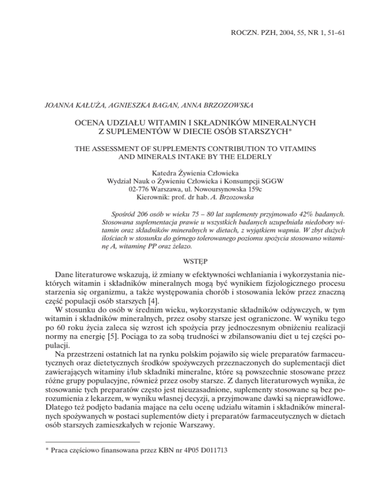 ROCZN. PZH, 2004, 55, NR 1, 51–61 JOANNA KAŁUŻA, AGNIESZKA BAGAN, ANNA BRZOZOWSKA OCENA UDZIAŁU WITAMIN I SKŁADNIKÓW MINERALNYCH Z SUPLEMENTÓW W DIECIE OSÓB STARSZYCH* THE ASSESSMENT OF SUPPLEMENTS CONTRIBUTION TO VITAMINS AND MINERALS INTAKE BY THE ELDERLY Katedra Żywienia Człowieka Wydział Nauk o Żywieniu Człowieka i Konsumpcji SGGW 02-776 Warszawa, ul. Nowoursynowska 159c Kierownik: prof. dr hab. A. Brzozowska Spośród 206 osób w wieku 75 – 80 lat suplementy przyjmowało 42% badanych. Stosowana suplementacja prawie u wszystkich badanych uzupełniała niedobory witamin oraz składników mineralnych w dietach, z wyjątkiem wapnia. W zbyt dużych ilościach w stosunku do górnego tolerowanego poziomu spożycia stosowano witaminę A, witaminę PP oraz żelazo. WSTĘP Dane literaturowe wskazują, iż zmiany w efektywności wchłaniania i wykorzystania niektórych witamin i składników mineralnych mogą być wynikiem fizjologicznego procesu starzenia się organizmu, a także występowania chorób i stosowania leków przez znaczną część populacji osób starszych [4]. W stosunku do osób w średnim wieku, wykorzystanie składników odżywczych, w tym witamin i składników mineralnych, przez osoby starsze jest ograniczone. W wyniku tego po 60 roku życia zaleca się wzrost ich spożycia przy jednoczesnym obniżeniu realizacji normy na energię [5]. Pociąga to za sobą trudności w zbilansowaniu diet u tej części populacji. Na przestrzeni ostatnich lat na rynku polskim pojawiło się wiele preparatów farmaceutycznych oraz dietetycznych środków spożywczych przeznaczonych do suplementacji diet zawierających witaminy i/lub składniki mineralne, które są powszechnie stosowane przez różne grupy populacyjne, również przez osoby starsze. Z danych literaturowych wynika, że stosowanie tych preparatów często jest nieuzasadnione, suplementy stosowane są bez porozumienia z lekarzem, w wyniku własnej decyzji, a przyjmowane dawki są nieprawidłowe. Dlatego też podjęto badania mające na celu ocenę udziału witamin i składników mineralnych spożywanych w postaci suplementów diety i preparatów farmaceutycznych w dietach osób starszych zamieszkałych w rejonie Warszawy. * Praca częściowo finansowana przez KBN nr 4P05 D011713 52 J. Kałuża, A. Bagan, A. Brzozowska Nr 1 MATERIAŁ I METODY Praca została zrealizowana jako część projektu badawczego dotyczącego uwarunkowań sposobu żywienia i stanu odżywienia osób starszych urodzonych w latach 1918–1923 zamieszkałych w rejonie warszawskim. Badania przeprowadzono wiosną 1999 roku. Osoby do badań wylosowano w biurze PESEL przyjmując jako kryteria wyboru wiek, płeć (50% mężczyźni, 50% kobiety) i miejsce zamieszkania (środowisko wielkomiejskie, małomiasteczkowe i wiejskie). Ogólne informacje o respondentach zebrano za pomocą kwestionariusza wywiadu, natomiast dane o sposobie żywienia metodą 3-dniowego bieżącego notowania spożywanych produktów i potraw. Spożywane potrawy przeliczono na produkty rynkowe, z jakich zostały przygotowane, a następnie uzyskane wyniki wprowadzono do programu komputerowego „Żywienie”, w którym dane o zawartości składników odżywczych w produktach pochodziły z tabel „Składu i wartości odżywczej produktów spożywczych” [7]. Uwzględniono również składniki mineralne pochodzące z wody wodociągowej bądź studziennej, wykorzystywanej przez respondentów do przygotowywania napojów i posiłków, tj. zup, kawy, herbaty, kompotów, naparów ziołowych, popijania leków. Wzięto pod uwagę również wodę, która została wchłonięta przez kasze, makarony i rośliny strączkowe. Dokładną metodykę oznaczenia zawartości składników mineralnych w wodzie pitnej przedstawiono w pracy Kałuży i wsp. [6]. Dzienne dawki witamin i składników mineralnych pobranych w formie suplementów diety lub preparatów farmaceutycznych wyliczono na podstawie deklaracji respondentów dotyczących stosowania ich w dniu badania. Złożone związki przeliczono na poszczególne składniki mineralne. Otrzymane dawki składników odżywczych pochodzące z suplementów porównano z normami na poziomie bezpiecznym [15]. Do stwierdzenia różnic w występowaniu określonych cech jakościowych w grupie badanych osób wykorzystano test Chi2, natomiast porównanie średnich przeprowadzono za pomocą testu Kruskalla-Wallisa (rozkłady odbiegały od normalnego). Różnice uznano za istotne statystycznie przy p ≤ 0,05. WYNIKI Badaniami objęto 206 osób starszych (52,4% respondentów stanowiły kobiety, zaś 47,6% mężczyźni), z czego witaminy i/lub składniki mineralne w formie preparatów farmaceutycznych lub dietetycznych środków spożywczych przyjmowało 42,2% badanych (87 osób). Wśród osób stosujących suplementy 59% respondentów przyjmowało preparaty witaminowo-mineralne, 16% stosowało suplementację dwiema lub większą liczbą witamin, 15% składnikami mineralnymi, natomiast około 10% badanych zażywało pojedyncze witaminy. Ponad 35% osób stosujących suplementację deklarowało, iż przyjmowało składniki odżywcze w formie preparatów farmaceutycznych przez okres dłuższy niż rok, 17,2% deklarowało, że przyjmowało je przez okres od jednego do sześciu miesięcy, zaś 11,4% przez jeden miesiąc bądź krócej. Jednocześnie aż 34,5% respondentów nie udzieliło odpowiedzi na pytanie bądź nie pamiętało przez jak długi okres stosowało suplementy. Wykazano, iż znamiennie więcej kobiet (50,9% badanych kobiet) niż mężczyzn (32,6%) stosowało suplementy, a także odsetek ten był istotnie większy wśród respondentów pochodzących z miasta (61,9%) niż ze środowiska małomiasteczkowego (36,1%) oraz wiejskiego (38,0%). Ponadto wykazano, iż w grupie osób legitymujących się wykształceniem średnim oraz wyższym było znamiennie więcej badanych przyjmujących preparaty farmaceutyczne lub dietetyczne środki spożywcze zawierające wit
