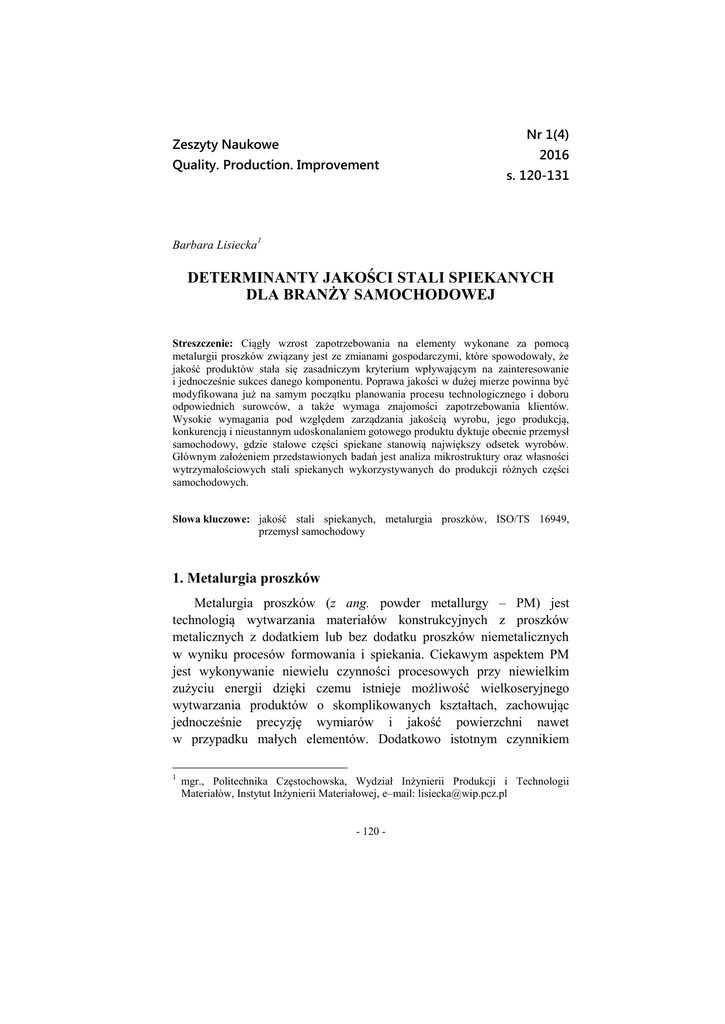 Nr 1(4) Zeszyty Naukowe Quality. Production. Improvement 2016 s. 120-131 Barbara Lisiecka1 DETERMINANTY JAKOŚCI STALI SPIEKANYCH DLA BRANŻY SAMOCHODOWEJ Streszczenie: Ciągły wzrost zapotrzebowania na elementy wykonane za pomocą metalurgii proszków związany jest ze zmianami gospodarczymi, które spowodowały, że jakość produktów stała się zasadniczym kryterium wpływającym na zainteresowanie i jednocześnie sukces danego komponentu. Poprawa jakości w dużej mierze powinna być modyfikowana już na samym początku planowania procesu technologicznego i doboru odpowiednich surowców, a także wymaga znajomości zapotrzebowania klientów. Wysokie wymagania pod względem zarządzania jakością wyrobu, jego produkcją, konkurencją i nieustannym udoskonalaniem gotowego produktu dyktuje obecnie przemysł samochodowy, gdzie stalowe części spiekane stanowią największy odsetek wyrobów. Głównym założeniem przedstawionych badań jest analiza mikrostruktury oraz własności wytrzymałościowych stali spiekanych wykorzystywanych do produkcji różnych części samochodowych. Słowa kluczowe: jakość stali spiekanych, metalurgia proszków, ISO/TS 16949, przemysł samochodowy 1. Metalurgia proszków Metalurgia proszków (z ang. powder metallurgy – PM) jest technologią wytwarzania materiałów konstrukcyjnych z proszków metalicznych z dodatkiem lub bez dodatku proszków niemetalicznych w wyniku procesów formowania i spiekania. Ciekawym aspektem PM jest wykonywanie niewielu czynności procesowych przy niewielkim zużyciu energii dzięki czemu istnieje możliwość wielkoseryjnego wytwarzania produktów o skomplikowanych kształtach, zachowując jednocześnie precyzję wymiarów i jakość powierzchni nawet w przypadku małych elementów. Dodatkowo istotnym czynnikiem 1 mgr., Politechnika Częstochowska, Wydział Inżynierii Produkcji i Technologii Materiałów, Instytut Inżynierii Materiałowej, e–mail: [email protected] - 120 - Nr 1(4) Zeszyty Naukowe Quality. Production. Improvement 2016 s. 120-131 określającym PM metodą bezkonkurencyjną jest stopień wykorzystania surowców wynoszący ok. 97% – mówi się wówczas o bezubytkowym wytwarzaniu spieków. Stale spiekane wytwarzane za pomocą PM stanowią doskonałą alternatywę dla stali otrzymywanych standardowymi metodami dzięki czemu budzą duże zainteresowanie, szczególnie w krajach wysoko uprzemysłowionych. Konsekwencją tego zainteresowania jest ciągły wzrost wymagań stawianych materiałom proszkowym wynikającym ze stałego dążenia do podwyższania właściwości mechanicznych, wytrzymałościowych czy odporności na korozję (SHEPPARD L. 2007, CIAŚ A., FRYDRYCH H., PIECZONKA T. 1992, WROŃSKA A., DUDEK A. 2014). Jakość oraz własności wyrobów spiekanych są determinowane przez następujące parametry: - własności i strukturę proszków, - warunki prasowania, - własności fizyczne, - warunki spiekania, - własności chemiczne. Cały proces technologiczny polega na otrzymywaniu proszku metalu lub stopu, poddawaniu go procesowi prasowania i spiekania, oraz końcowej obróbce wykańczającej. Warto zauważyć, że przemysł dąży do wytwarzania wyrobów spiekanych za pomocą najprostszych technologii przy jednoczesnym ograniczeniu korzystania z zabiegów wykańczających, które skutkują wyższą ceną gotowego materiału. Taki schemat jest możliwy dzięki wykorzystaniu proszków o odpowiedniej jakości (RAMAKRISHNAN P. 2013, CAPUS J. 2011). Uzyskanie struktury spieku o różnych udziałach dwóch podstawowych składników jest możliwe dla spiekanych stali wielofazowych. Aby określić mikrostrukturę na podstawie składu chemicznego wykorzystuje się diagram Schaeffler’a (rys. 1). Skład chemiczny bardzo często różni się od literaturowych składów stali, ponieważ metalurgia proszków stwarza możliwość modyfikacji składu w bardzo szerokim zakresie, np. przez dodawanie proszków czystych - 121 - Nr 1(4) Zeszyty Naukowe Quality. Production. Improvement 2016 s. 120-131 pierwiastków do podstawowej mieszaniny (WŁODARCZYK R., DUDEK A., NITKIEWICZ Z. 2010, TAŃSKI T., BRYTAN Z., LABISZ K. 2014). Rys. 1. Diagram Schaffler’a Źródło: opracowanie na podstawie (http://www.dacapo.com/en-UK) Zasadniczy wpływ na gęstość oraz mikrostrukturę spiekanych stali austenityczno–ferrytycznych ma czas spiekania. Głównymi czynnikami wpływającymi na przemiany zachodzące w tym procesie są skład chemiczny, udział poszczególnych proszków oraz warunki spiekania, które odgrywają bardzo ważną rolę w procesie kształtowania końcowej mikrostruktury spieków, ich właściwości mechanicznych i użytkowych. Rysunek 2 przedstawia dyfuzję pierwiastków stopowych powstającą w trakcie spiekania stali austenityczno–ferrytycznej, której efektem jest utworzenie tzw. obszarów dyfuzji wzajemnej między fazą austenityczną i ferrytyczną (CAMPOS M., BAUTISTA A., CACERES D., ABENOJAR J., TORRALBA J. 2003, BRYTAN Z., DOBRZAŃSKI L.A., ACTIS GRANDE M., ROSSO M. 2009). - 122 - Nr 1(4) Zeszyty Naukowe Quality. Production. Improvement 2016 s. 120-131 Rys. 2. Kształtowanie mikrostruktury stali spiekanych Źródło: opracowanie na podstawie (CAMPOS M., BAUTISTA A., CACERES D., ABENOJAR J., TORRALBA J. 2009) 2. Stalowe części spiekane w przemyśle samochodowym Obecnie największym konsumentem wyrobów spiekanych jest przemysł motoryzacyjny (ok. 73% wszystkich spieków). Wyroby te w głównej mierze zastępują elementy otrzymywane standardowymi metodami odlewania lub kucia. Szacuje się, że na jeden samochód produkowany w USA przypada średnio 19 kg wyrobów spiekanych, w Europie 9 kg, a w Japonii 8 kg. Ponadto, ważnymi odbiorcami części spiekanych są przemysł maszynowy, energetyczny, elektroniczny oraz inne gałęzie przemysłowe (rys. 3) (CIAŚ A., FRYDRYCH H., PIECZONKA T. 1992). - 123 - Nr 1(4) Zeszyty Naukowe Quality. Production. Improvement 2016 s. 120-131 Rys. 3. Główni odbiorcy 