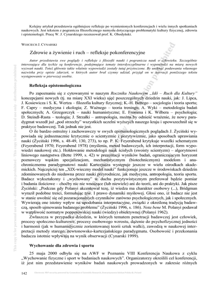 Kolejny artykuł przedstawia ogólniejsze refleksje po wymienionych konferencjach i wielu innych spotkaniach naukowych. Jest tekstem z pogranicza filozoficznego namysłu dotyczącego problematyki kultury fizycznej, zdrowia i epistemologii. Pracę W. J. Cynarskiego recenzował prof. K. Obodyński. WOJCIECH J. CYNARSKI This copy is for personal use only - distribution prohibited - This copy is for personal use only - distribution prohibited Zdrowie a żywienie i ruch – refleksje pokonferencyjne Autor przedstawia swe poglądy i refleksje z filozofii nauki i pogranicza nauk o człowieku. Szczególnie interesujące dla tychże są konferencje, podejmujące tematy interdyscyplinarne i wypowiedzi na miarę nowych wyzwań nauki. Toteż głównie takie właśnie wypowiedzi zostały tutaj przytoczone. By uniknąć podawania własnego nazwiska przy opisie zdarzeń, w których autor brał czynny udział, przyjął on w narracji poniższego tekstu występowanie w pierwszej osobie. Refleksja epistemologiczna Po zapoznaniu się z cytowanymi w naszym Roczniku Naukowym „Idō – Ruch dla Kultury” koncepcjami nowych (tj. na miarę XXI wieku) ujęć poszczególnych dziedzin nauki, jak: J. Lipca, J. Kosiewicza i S. K. Wertza – filozofia kultury fizycznej; K.-H. Bettego – socjologia i teoria sportu; F. Capry – medycyna i ekologia; Z. Ważnego – teoria treningu, A. Wyki – metodologia badań społecznych; A. Grzegorczyk – nauki humanistyczne; E. Fromma i K. Wilbera – psychologia; D. Steindl-Rasta – teologia; J. Strzałki – antropologia, można by odnieść wrażenie, że nowy paradygmat wszedł już „pod strzechy” wszystkich uczelni wyższych naszego kraju i upowszechnił się w praktyce badawczej. Tak jednak nie jest. O ile bardzo ostrożny i zachowawczy w swych epistemologicznych poglądach J. Życiński wypowiada się jednoznacznie krytycznie o scientyzmie i pozytywizmie, jako sposobach uprawiania nauki (Życiński 1996, s. 48-49, 130, 273), to np. P. K. Feyerabend krytykuje wszelki schematyzm (Feyerabend 1970; Feyerabend 1978) (myślenia, metod badawczych, ich interpretacji, form wypowiedzi naukowej etc.). Hołdowanie metodologii nauk ścisłych (swoisty scientyzm) – algorytmowi liniowego następstwa (Bette 1999, s. 42) w prezentacji wyników badań, ograniczającym horyzont poznawczy wąskim specjalizacjom, mechanistycznym (biotechnicznym) modelom i anachronicznemu paradygmatowi nauki Kartezjusza występuje jeszcze w wielu ośrodkach akademickich. Najczęściej ten „XIX-wieczny model nauki” funkcjonuje jeszcze w środowiskach dziedzin zdominowanych do niedawna przez nauki przyrodnicze, jak medycyna, antropologia, teoria sportu. Badacz wykształcony i „wychowany” w duchu pozytywistycznym preferował będzie pomiar i badania ilościowe – choćby nic nie wnoszące (lub niewiele) ani do teorii, ani do praktyki. Jak pisze Życiński: „Podczas gdy Polanyi akcentował tezę, iż wiedza ma charakter osobowy (...), Bridgman wyraził podobne treści, formułując tzw. I prawo dynamiki myślowej. Głosi ono, iż badacz nie jest w stanie uwolnić się od pozaracjonalnych czynników zarówno psychologicznych, jak i społecznych. Wywierają one istotny wpływ na upodobania interpretacyjne, związki z określoną tradycją badawczą, sposób ujmowania badanego problemu” (Życiński 1996, s. 186). Nota bene M. Polanyi podawał w wątpliwość normatyw popperowskiej nauki (wiedzy) obiektywnej (Polanyi 1962). Zwłaszcza w przypadku dziedzin, w których tematem penetracji badawczej jest człowiek, procesy społeczno-kulturowe, procesy osobowego wzrostu, dążenie do psychofizycznej jedności i harmonii (jak w humanistycznie zorientowanej teorii sztuk walki), zawodzą w naukowej interpretacji metody starego, newtonowsko-kartezjańskiego paradygmatu. Osobowość i przekonania badacza istotnie wpływają na wynik obserwacji (Cynarski 1999). Wychowanie dla zdrowia i sportu 25 maja 2000 odbyła się na AWF w Poznaniu VIII Konferencja Naukowa z cyklu „Wychowanie fizyczne i sport w badaniach naukowych”. Organizatorzy określili cel konferencji, iż jest nim przedstawienie wyników badań naukowych prowadzonych w zakresie różnych 142 Electronic PDF security powered by Committee of Scientific Research, Stowarzyszenie Idokan Polska ®, Poland This copy is for personal use only - distribution prohibited - This copy is for personal use only - distribution prohibited dyscyplin nauki na potrzeby wychowania fizycznego i sportu. Do czynnego udziału zaprosili nauczycieli akademickich różnych specjalności, trenerów i nauczycieli wychowania fizycznego prowadzących badania naukowe na rzecz wychowania fizycznego i sportu. W szczególności zaproszenie to kierowane było do młodych nauczycieli akademickich. Oprócz Katedry Teorii i Metodyki Wychowania Fizycznego poznańskiej AWF imprezę tę współorganizowały: Katedra Teorii i Metodyki Gimnastyki, Katedra Teorii i Metodyki Sportu, Katedra Biomechaniki i Lekkiej Atletyki i Zakład Pływania i Ratownictwa Wodnego przy współpracy Sekcji Polskiej International Association of Sport Kinetics, poznańskiego oddziału PAN, PTNKF i Instytutu Wychowania Fizycznego PWSZ w Lesznie. Twórcą idei i inicjatorem takiej cyklicznej konferencji oraz przewodniczącym jej Komitetu Naukowego był niedawno zmarły prof. Eugeniusz Wachowski. Poświęcony mu referat pt. „Profesor Eugeniusz Wachowski – jako twórca i organizator konferencji Wychowanie fizyczne i sport w badaniach naukowych” przedstawił R. Strzelczyk. Następnie J. Gracz (AWF Poznań) wygłosił referat plenarny Psychospołeczny model aktywności sportowej. Modelowanie stanowi podstawową czynność badania naukowego. Gracz w odniesieniu do zagadnienia aktywności sportowej wyróżnił modele: behawiorystyczny, interakcjonistyczny, „personalogiczny” i psychospołeczny. W. Starosta (IWF Gorzów Wlkp.) przedstawił interesujący referat pt. Znaczenie i składowe samowychowania w sporc