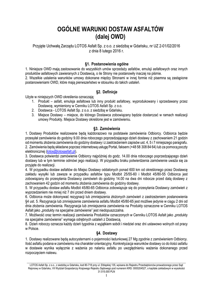 OGÓLNE WARUNKI DOSTAW ASFALTÓW (dalej OWD) Przyjęte Uchwałą Zarządu LOTOS Asfalt Sp. z o.o. z siedzibą w Gdańsku, nr UZ 2-01/02/2016 z dnia 8 lutego 2016 r. §1. Postanowienia ogólne 1. Niniejsze OWD mają zastosowanie do wszystkich umów sprzedaży asfaltów, emulsji asfaltowych oraz innych produktów asfaltowych zawieranych z Dostawcą, o ile Strony nie postanowiły inaczej na piśmie. 2. Wszelkie ustalenia warunków umowy dokonane między Stronami w innej formie niż pisemna są zastąpione postanowieniami OWD, które mają pierwszeństwo w stosunku do takich ustaleń. §2. Definicje Użyte w niniejszych OWD określenia oznaczają: 1. Produkt – asfalt, emulsja asfaltowa lub inny produkt asfaltowy, wyprodukowany i sprzedawany przez Dostawcę, wymieniony w Cenniku LOTOS Asfalt Sp. z o.o. 2. Dostawca - LOTOS Asfalt Sp. z o.o. z siedzibą w Gdańsku. 3. Miejsce Dostawy – miejsce, do którego Dostawca zobowiązany będzie dostarczać w ramach realizacji umowy Produkty. Miejsce Dostawy określone jest w zamówieniu. §3. Zamówienia 1. Dostawy Produktów realizowane będą każdorazowo na podstawie zamówienia Odbiorcy. Odbiorca będzie przesyłał zamówienia do godziny 9.00 dnia roboczego poprzedzającego dzień dostawy z zachowaniem 21 godzin od momentu złożenia zamówienia do godziny dostawy i z zastrzeżeniem zapisów ust. 4, 5 i 7 niniejszego paragrafu. 2. Zamówienia będą składane poprzez internetową usługę Portal, faksem (+48 58 308 84 64) lub za pomocą poczty elektronicznej ([email protected]). 3. Dostawca potwierdzi zamówienie Odbiorcy najpóźniej do godz. 14.00 dnia roboczego poprzedzającego dzień dostawy lub w tym terminie odmówi jego realizacji. W przypadku braku potwierdzenia zamówienie uważa się za przyjęte do realizacji. 4. W przypadku dostaw asfaltów do Miejsc Dostawy oddalonych ponad 600 km od określonego przez Dostawcę zakładu wysyłki lub zawsze w przypadku asfaltów typu Modbit 25/55-60 i Modbit 45/80-55 Odbiorca jest zobowiązany do przesyłania Dostawcy zamówień do godziny 14.00 na dwa dni robocze przed datą dostawy z zachowaniem 42 godzin od momentu złożenia zamówienia do godziny dostawy. 5. W przypadku dostaw asfaltu Modbit 45/80-65 Odbiorca zobowiązuje się do przesyłania Dostawcy zamówień z wyprzedzeniem nie mniej niż 7 dni przed dniem dostawy. 6. Odbiorca może dokonywać rezygnacji lub zmniejszenia złożonych zamówień z zastrzeżeniem postanowienia §4 ust. 5. Rezygnacja lub zmniejszenie zamówienia asfaltu Modbit 45/80-65 jest możliwe jedynie w ciągu 2 dni od dnia złożenia zamówienia. Rezygnacja lub zmniejszenia zamówienia na Produkty oznaczone w Cenniku LOTOS Asfalt jako „produkty na specjalne zamówienie” jest niedopuszczalna. 7. Możliwość oraz termin realizacji zamówienia Produktów oznaczonych w Cenniku LOTOS Asfalt jako „produkty na specjalne zamówienie” wymaga odrębnych ustaleń z Dostawcą. 8. Dzień roboczy oznacza każdy dzień tygodnia z wyjątkiem sobót i niedziel oraz dni ustawowo wolnych od pracy w Polsce. §4. Dostawy 1. Dostawy realizowane będą autocysternami o pojemności ładunkowej 27 Mg zgodnie z zamówieniem Odbiorcy. Ilość asfaltu podana w zamówieniu ma charakter orientacyjny. Konkretyzacja warunków dostawy co do ilości asfaltu w dostawie wynika wyłącznie z ważenia po nalaniu asfaltu po uwzględnieniu ważenia dokonanego przed rozpoczęciem nalewu. _________________________________________________________________________________________ LOTOS Asfalt Sp. z o.o., z siedzibą w Gdańsku, kod 80-718 przy ul. Elbląskiej 135, wpisana do Rejestru Przedsiębiorców prowadzonego przez Sąd Rejonowy w Gdańsku, VII Wydział Gospodarczy Krajowego Rejestru Sądowego pod numerem KRS: 0000204527, o kapitale zakładowym w wysokości 31.515.000 PLN 1 2. Dostawy będą realizowane w oparciu o formułę franco na bazie formuły CPT wynikającą z Międzynarodowych Reguł Handlowych Incoterms 2010 z zastrzeżeniem, że Dostawca odpowiada przed Odbiorcą za terminowość dostawy do Miejsca Dostawy. 3. Odbiorca ma prawo zamówić emulsje asfaltowe na bazie formuły loco EXW loaded (Incoterms 2010). 4. W przypadku realizowania dostaw na bazie formuły loco EXW loaded (Incoterms 2010) oraz samodzielnego pełnienia cystern przez kierowcę, Odbiorca zapewnia i ponosi odpowiedzialność za to, że kierowca posiada zaświadczenie kwalifikacyjne wydane przez Transportowy Dozór Techniczny w zakresie obsługi urządzeń nalewczych (NO) dla materiałów niebezpiecznych klasy 9 wg ADR oraz odbył instruktaż w zakresie samodzielnej obsługi systemu nalewczego. 5. Koszt rezygnacji ze złożonego zamówienia realizowanego na bazie formuły franco po jego przyjęciu i rozpoczęciu załadunku wynosi (za każdą autocysternę) 1000 PLN + VAT w przypadku dostaw kierowanych do Polski i 250 EUR w przypadku dostaw kierowanych poza Polskę w ramach dostaw wewnątrzwspólnotowych. Za zgodą Dostawcy dostawa, której dotyczy rezygnacja lub zmniejszenie, może zostać zrealizowana do innego Miejsca Dostawy wskazanego przez Odbiorcę (przekierowanie). Cena przekierowanego zamówienia zostanie ustalona zgodnie z kalkulacją dla nowego Miejsca Dostawy, z uwzględnieniem poniesionych przez Dostawcę kosztów przekierowania. Uwzględniony koszt przekierowania nie może przekroczyć (za każdą autocysternę) 1000 PLN + VAT w przypadku dostaw kierowanych do Polski i 250 EUR w przypadku dostaw kierowanych poza Polskę w ramach dostaw wewnątrzwspólnotowych. 6. W przypadku rozładunku trwającego ponad 3 godziny, licząc od godziny wskazanej w zamówieniu lub od chwili podstawienia danego środka transportu do rozładunku w przypadku opóźnionych dostaw, Odbiorca będzie zobowiązany do zapłaty za każdą kolejną rozpoczętą godzinę kary umownej w wysokości 100 PLN w Polsce lub 25 EUR poza Polską z uwagi na to, że Dostawca będzie musiał zapłacić karę umowną za przetrzymanie środka transportu. 7. 
