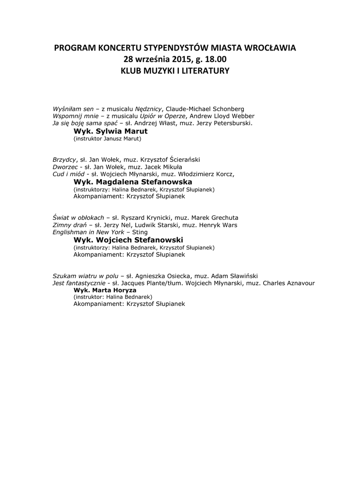 PROGRAM KONCERTU STYPENDYSTÓW MIASTA WROCŁAWIA 28 września 2015, g. 18.00 KLUB MUZYKI I LITERATURY Wyśniłam sen – z musicalu Nędznicy, Claude-Michael Schonberg Wspomnij mnie – z musicalu Upiór w Operze, Andrew Lloyd Webber Ja się boję sama spać – sł. Andrzej Włast, muz. Jerzy Petersburski. Wyk. Sylwia Marut (instruktor Janusz Marut) Brzydcy, sł. Jan Wołek, muz. Krzysztof Ścierański Dworzec - sł. Jan Wołek, muz. Jacek Mikuła Cud i miód - sł. Wojciech Młynarski, muz. Włodzimierz Korcz, Wyk. Magdalena Stefanowska (instruktorzy: Halina Bednarek, Krzysztof Słupianek) Akompaniament: Krzysztof Słupianek Świat w obłokach – sł. Ryszard Krynicki, muz. Marek Grechuta Zimny drań – sł. Jerzy Nel, Ludwik Starski, muz. Henryk Wars Englishman in New York – Sting Wyk. Wojciech Stefanowski (instruktorzy: Halina Bednarek, Krzysztof Słupianek) Akompaniament: Krzysztof Słupianek Szukam wiatru w polu – sł. Agnieszka Osiecka, muz. Adam Sławiński Jest fantastycznie - sł. Jacques Plante/tłum. Wojciech Młynarski, muz. Charles Aznavour Wyk. Marta Horyza (instruktor: Halina Bednarek) Akompaniament: Krzysztof Słupianek
