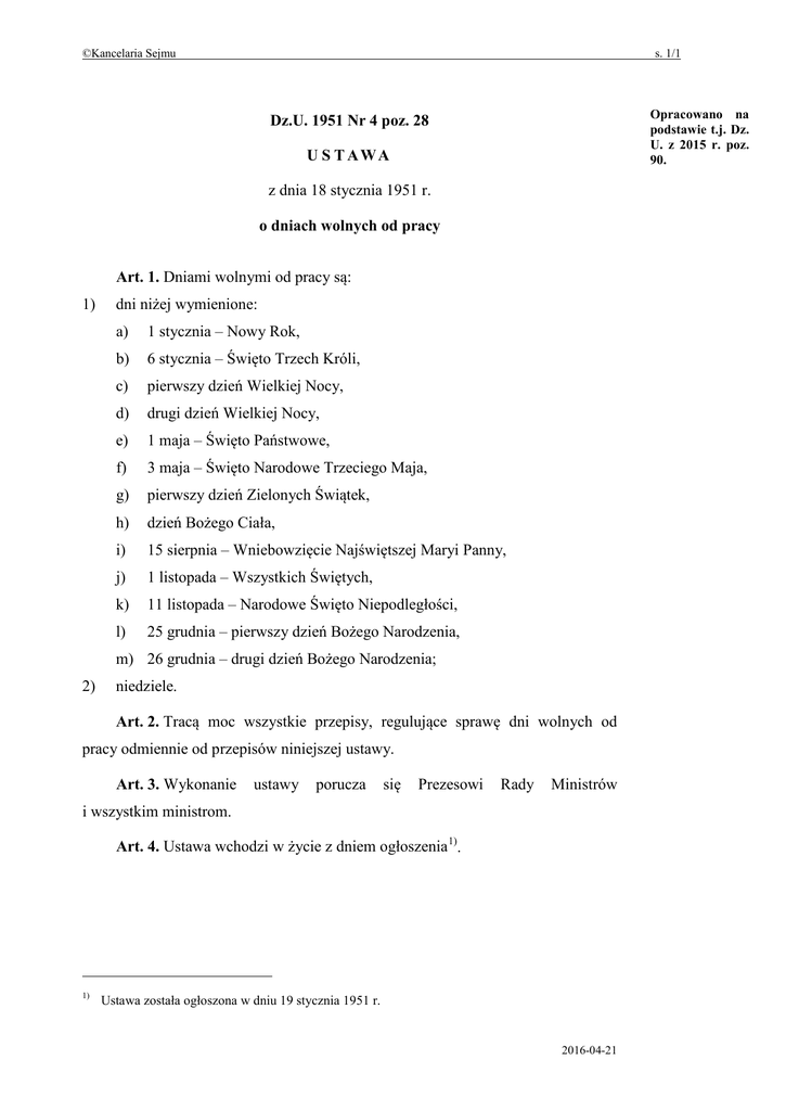 ©Kancelaria Sejmu s. 1/1 Opracowano na podstawie t.j. Dz. U. z 2015 r. poz. 90. Dz.U. 1951 Nr 4 poz. 28 U S T AWA z dnia 18 stycznia 1951 r. o dniach wolnych od pracy Art. 1. Dniami wolnymi od pracy są: 1) dni niżej wymienione: a) 1 stycznia – Nowy Rok, b) 6 stycznia – Święto Trzech Króli, c) pierwszy dzień Wielkiej Nocy, d) drugi dzień Wielkiej Nocy, e) 1 maja – Święto Państwowe, f) 3 maja – Święto Narodowe Trzeciego Maja, g) pierwszy dzień Zielonych Świątek, h) dzień Bożego Ciała, i) 15 sierpnia – Wniebowzięcie Najświętszej Maryi Panny, j) 1 listopada – Wszystkich Świętych, k) 11 listopada – Narodowe Święto Niepodległości, l) 25 grudnia – pierwszy dzień Bożego Narodzenia, m) 26 grudnia – drugi dzień Bożego Narodzenia; 2) niedziele. Art. 2. Tracą moc wszystkie przepisy, regulujące sprawę dni wolnych od pracy odmiennie od przepisów niniejszej ustawy. Art. 3. Wykonanie ustawy porucza się Prezesowi Rady Ministrów i wszystkim ministrom. Art. 4. Ustawa wchodzi w życie z dniem ogłoszenia 1). 1) Ustawa została ogłoszona w dniu 19 stycznia 1951 r. 2016-04-21