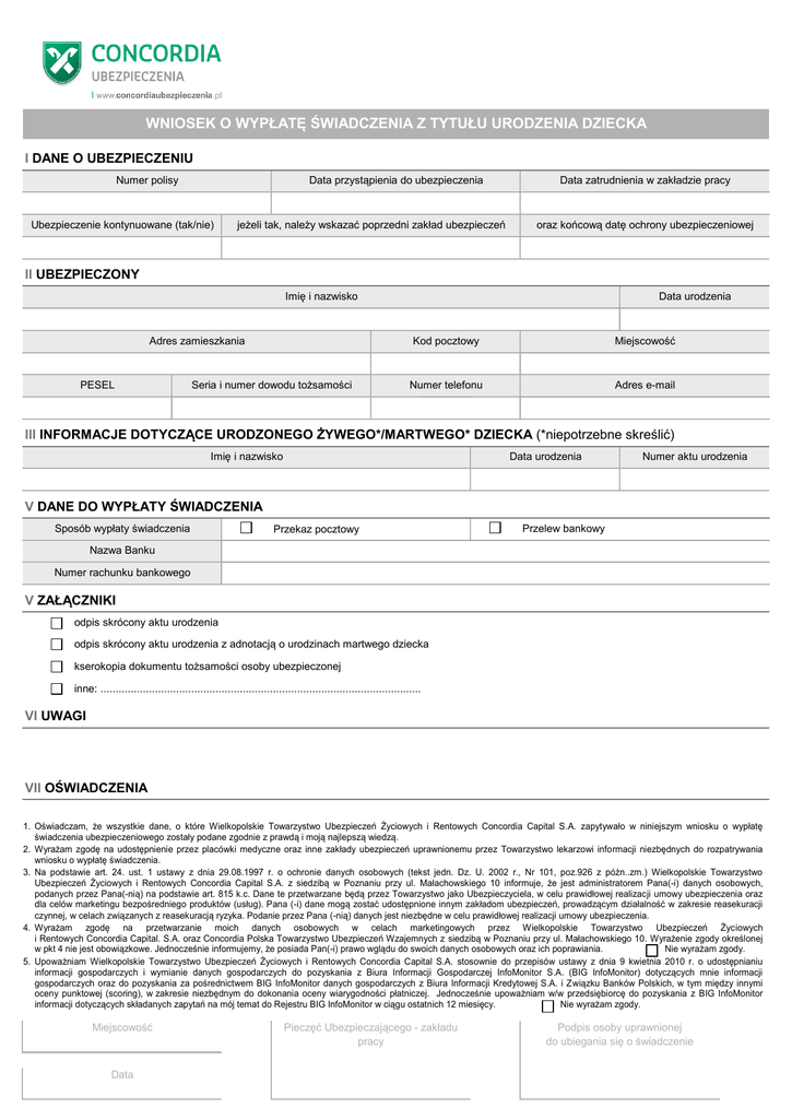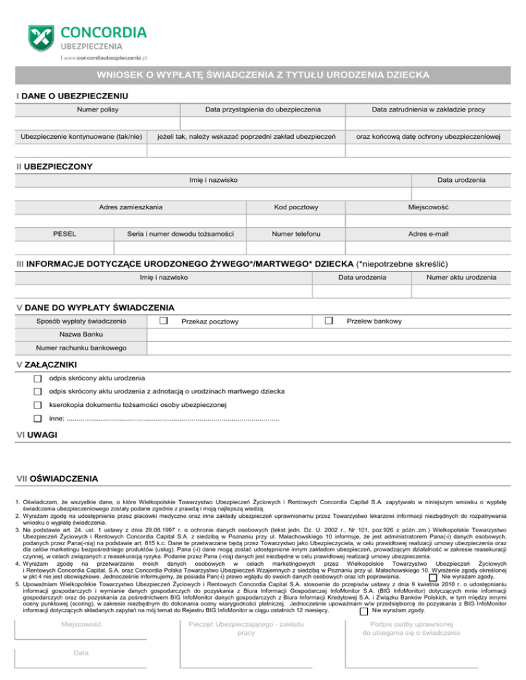 WNIOSEK O WYPŁATĘ ŚWIADCZENIA Z TYTUŁU URODZENIA DZIECKA I DANE O UBEZPIECZENIU Data przystąpienia do ubezpieczenia Numer polisy Ubezpieczenie kontynuowane (tak/nie) jeżeli tak, należy wskazać poprzedni zakład ubezpieczeń Data zatrudnienia w zakładzie pracy oraz końcową datę ochrony ubezpieczeniowej II UBEZPIECZONY Imię i nazwisko Adres zamieszkania PESEL Seria i numer dowodu tożsamości Data urodzenia Kod pocztowy Miejscowość Numer telefonu Adres e-mail III INFORMACJE DOTYCZĄCE URODZONEGO ŻYWEGO*/MARTWEGO* DZIECKA (*niepotrzebne skreślić) Imię i nazwisko Data urodzenia Numer aktu urodzenia V DANE DO WYPŁATY ŚWIADCZENIA Sposób wypłaty świadczenia Przekaz pocztowy Przelew bankowy Nazwa Banku Numer rachunku bankowego V ZAŁĄCZNIKI odpis skrócony aktu urodzenia odpis skrócony aktu urodzenia z adnotacją o urodzinach martwego dziecka kserokopia dokumentu tożsamości osoby ubezpieczonej inne: ............................................................................................................... VI UWAGI VII OŚWIADCZENIA 1. Oświadczam, że wszystkie dane, o które Wielkopolskie Towarzystwo Ubezpieczeń Życiowych i Rentowych Concordia Capital S.A. zapytywało w niniejszym wniosku o wypłatę świadczenia ubezpieczeniowego zostały podane zgodnie z prawdą i moją najlepszą wiedzą. 2. Wyrażam zgodę na udostępnienie przez placówki medyczne oraz inne zakłady ubezpieczeń uprawnionemu przez Towarzystwo lekarzowi informacji niezbędnych do rozpatrywania wniosku o wypłatę świadczenia. 3. Na podstawie art. 24. ust. 1 ustawy z dnia 29.08.1997 r. o ochronie danych osobowych (tekst jedn. Dz. U. 2002 r., Nr 101, poz.926 z późn..zm.) Wielkopolskie Towarzystwo Ubezpieczeń Życiowych i Rentowych Concordia Capital S.A. z siedzibą w Poznaniu przy ul. Małachowskiego 10 informuje, że jest administratorem Pana(-i) danych osobowych, podanych przez Pana(-nią) na podstawie art. 815 k.c. Dane te przetwarzane będą przez Towarzystwo jako Ubezpieczyciela, w celu prawidłowej realizacji umowy ubezpieczenia oraz dla celów marketingu bezpośredniego produktów (usług). Pana (-i) dane mogą zostać udostępnione innym zakładom ubezpieczeń, prowadzącym działalność w zakresie reasekuracji czynnej, w celach związanych z reasekuracją ryzyka. Podanie przez Pana (-nią) danych jest niezbędne w celu prawidłowej realizacji umowy ubezpieczenia. 4. Wyrażam zgodę na przetwarzanie moich danych osobowych w celach marketingowych przez Wielkopolskie Towarzystwo Ubezpieczeń Życiowych i Rentowych Concordia Capital. S.A. oraz Concordia Polska Towarzystwo Ubezpieczeń Wzajemnych z siedzibą w Poznaniu przy ul. Małachowskiego 10. Wyrażenie zgody określonej w pkt 4 nie jest obowiązkowe. Jednocześnie informujemy, że posiada Pan(-i) prawo wglądu do swoich danych osobowych oraz ich poprawiania. Nie wyrażam zgody. 5. Upoważniam Wielkopolskie Towarzystwo Ubezpieczeń Życiowych i Rentowych Concordia Capital S.A. stosownie do przepisów ustawy z dnia 9 kwietnia 2010 r. o udostępnianiu informacji gospodarczych i wymianie danych gospodarczych do pozyskania z Biura Informacji Gospodarczej InfoMonitor S.A. (BIG InfoMonitor) dotyczących mnie informacji gospodarczych oraz do pozyskania za pośrednictwem BIG InfoMonitor danych gospodarczych z Biura Informacji Kredytowej S.A. i Związku Banków Polskich, w tym między innymi oceny punktowej (scoring), w zakresie niezbędnym do dokonania oceny wiarygodności płatniczej. Jednocześnie upoważniam w/w przedsiębiorcę do pozyskania z BIG InfoMonitor informacji dotyczących składanych zapytań na mój temat do Rejestru BIG InfoMonitor w ciągu ostatnich 12 miesięcy. Nie wyrażam zgody. Miejscowość Data Pieczęć Ubezpieczającego - zakładu pracy Podpis osoby uprawnionej do ubiegania się o świadczenie