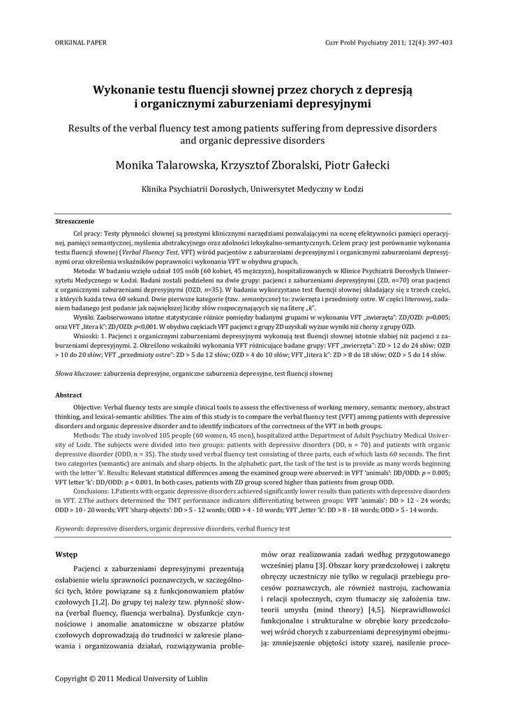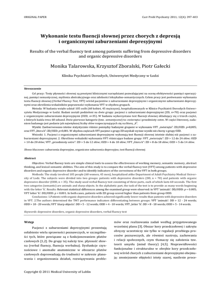 ORIGINAL PAPER Curr Probl Psychiatry 2011; 12(4): 397-403 Wykonanie testu fluencji słownej przez chorych z depresją i organicznymi zaburzeniami depresyjnymi Results of the verbal fluency test among patients suffering from depressive disorders and organic depressive disorders Monika Talarowska, Krzysztof Zboralski, Piotr Gałecki Klinika Psychiatrii Dorosłych, Uniwersytet Medyczny w Łodzi Streszczenie Cel pracy: Testy płynności słownej są prostymi klinicznymi narzędziami pozwalającymi na ocenę efektywności pamięci operacyjnej, pamięci semantycznej, myślenia abstrakcyjnego oraz zdolności leksykalno-semantycznych. Celem pracy jest porównanie wykonania testu fluencji słownej (Verbal Fluency Test, VFT) wśród pacjentów z zaburzeniami depresyjnymi i organicznymi zaburzeniami depresyjnymi oraz określenia wskaźników poprawności wykonania VFT w obydwu grupach. Metoda: W badaniu wzięło udział 105 osób (60 kobiet, 45 mężczyzn), hospitalizowanych w Klinice Psychiatrii Dorosłych Uniwersytetu Medycznego w Łodzi. Badani zostali podzieleni na dwie grupy: pacjenci z zaburzeniami depresyjnymi (ZD, n=70) oraz pacjenci z organicznymi zaburzeniami depresyjnymi (OZD, n=35). W badaniu wykorzystano test fluencji słownej składający się z trzech części, z których każda trwa 60 sekund. Dwie pierwsze kategorie (tzw. semantyczne) to: zwierzęta i przedmioty ostre. W części literowej, zadaniem badanego jest podanie jak największej liczby słów rozpoczynających się na literę „k”. Wyniki: Zaobserwowano istotne statystycznie różnice pomiędzy badanymi grupami w wykonaniu VFT „zwierzęta”: ZD/OZD: p=0,005; oraz VFT „litera k”: ZD/OZD: p<0,001. W obydwu częściach VFT pacjenci z grupy ZD uzyskali wyższe wyniki niż chorzy z grupy OZD. Wnioski: 1. Pacjenci z organicznymi zaburzeniami depresyjnymi wykonują test fluencji słownej istotnie słabiej niż pacjenci z zaburzeniami depresyjnymi. 2. Określono wskaźniki wykonania VFT różnicujące badane grupy: VFT „zwierzęta”: ZD > 12 do 24 słów; OZD > 10 do 20 słów; VFT „przedmioty ostre”: ZD > 5 do 12 słów; OZD > 4 do 10 słów; VFT „litera k”: ZD > 8 do 18 słów; OZD > 5 do 14 słów. Słowa kluczowe: zaburzenia depresyjne, organiczne zaburzenia depresyjne, test fluencji słownej Abstract Objective: Verbal fluency tests are simple clinical tools to assess the effectiveness of working memory, semantic memory, abstract thinking, and lexical-semantic abilities. The aim of this study is to compare the verbal fluency test (VFT) among patients with depressive disorders and organic depressive disorder and to identify indicators of the correctness of the VFT in both groups. Methods: The study involved 105 people (60 women, 45 men), hospitalized atthe Department of Adult Psychiatry Medical University of Lodz. The subjects were divided into two groups: patients with depressive disorders (DD, n = 70) and patients with organic depressive disorder (ODD, n = 35). The study used verbal fluency test consisting of three parts, each of which lasts 60 seconds. The first two categories (semantic) are animals and sharp objects. In the alphabetic part, the task of the test is to provide as many words beginning with the letter ‘k’. Results: Relevant statistical differences among the examined group were observed: in VFT ‘animals’: DD/ODD: p = 0.005; VFT letter ‘k’: DD/ODD: p < 0.001. In both cases, patients with ZD group scored higher than patients from group ODD. Conclusions: 1.Patients with organic depressive disorders achieved significantly lower results than patients with depressive disorders in VFT. 2.The authors determined the TMT performance indicators differentiating between groups: VFT ‘animals’: DD > 12 - 24 words; ODD > 10 - 20 words; VFT ‘sharp objects’: DD > 5 - 12 words; ODD > 4 - 10 words; VFT „letter ‘k’: DD > 8 - 18 words; ODD > 5 - 14 words. Keywords: depressive disorders, organic depressive disorders, verbal fluency test Wstęp Pacjenci z zaburzeniami depresyjnymi prezentują osłabienie wielu sprawności poznawczych, w szczególności tych, które powiązane są z funkcjonowaniem płatów czołowych [1,2]. Do grupy tej należy tzw. płynność słowna (verbal fluency, fluencja werbalna). Dysfunkcje czynnościowe i anomalie anatomiczne w obszarze płatów czołowych doprowadzają do trudności w zakresie planowania i organizowania działań, rozwiązywania proble- Copyright © 2011 Medical University of Lublin mów oraz realizowania zadań według przygotowanego wcześniej planu [3]. Obszar kory przedczołowej i zakrętu obręczy uczestniczy nie tylko w regulacji przebiegu procesów poznawczych, ale również nastroju, zachowania i relacji społecznych, czym tłumaczy się założenia tzw. teorii umysłu (mind theory) [4,5]. Nieprawidłowości funkcjonalne i strukturalne w obrębie kory przedczołowej wśród chorych z zaburzeniami depresyjnymi obejmują: zmniejszenie objętości istoty szarej, nasilenie proce- 398 M. Talarowska, K. Zboralski, P. Gałecki sów zapalnych prowadzących do neurodegeneracji, zmniejszenie wielkości i liczby neuronów oraz zwojów nerwowych, osłabienie metabolizmu, a także nieprawidłowości w przepływie krwi [6,7]. Wiadomo również, iż słabsze wykonanie w zakresie testów oceniających sprawność pamięci operacyjnej koreluje dodatnio z nasileniem objawów depresji [8], jest jednym z czynników ryzyka nawrotów choroby [9,10] oraz zmniejsza skuteczność leczenia przeciwdepresyjnego [11]. Testy płynności słownej (verbal fluency test, VFT) są prostymi klinicznymi narzędziami pozwalającymi na ocenę efektywności pamięci operacyjnej, pamięci semantycznej, myślenia abstrakcyjnego oraz zdolności leksykalno-semantycznych. Są stosowane w trzech wersjach: semantycznej (np. zwierzęta, owoce, warzywa, rośliny, imiona), literowej (tzw. fonologicznej w najpopularniejszej wersji FAS - The Controlled Oral Word Association Test (COWAT), 