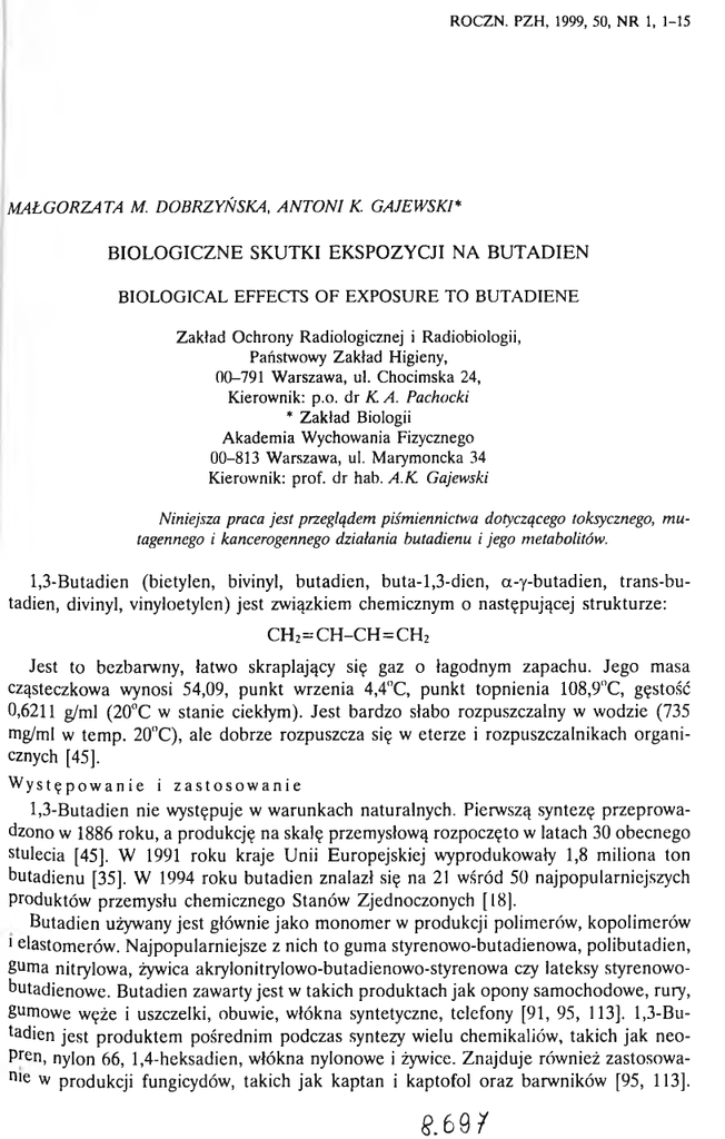ROCZN. PZH, 1999, 50, NR 1, 1-15 M AŁG O RZATA M. DOBRZYŃSKA, A N T O N I K. GAJEWSKI* B IO L O G IC Z N E S K U T K I E K S P O Z Y C JI N A B U T A D IE N BIO LOG ICA L EFFECTS O F EX PO SU RE TO BU TA D IEN E Zakład Ochrony Radiologicznej i Radiobiologii, Państwowy Zakład Higieny, 00-791 Warszawa, ul. Chocimska 24, Kierownik: p.o. dr К A. Pachocki * Zakład Biologii Akademia Wychowania Fizycznego 00-813 Warszawa, ul. Marymoncka 34 Kierownik: prof. dr hab. А. К Gajewski Niniejsza praca jest przeglądem piśmiennictwa dotyczącego toksycznego, m u tagennego i kancerogennego działania butadienu i jego metabolitów. 1.3 -B u tad ien (bietylen, bivinyl, b u ta d ie n , b u ta -l,3 -d ie n , a -y -b u ta d ie n , tran s-b u tadien, divinyl, vinyloetylen) je st zw iązkiem chem icznym o n astęp u jące j stru k tu rze : C H 2= C H - C H = C H 2 Je st to bezbarw ny, łatw o skraplający się gaz o łagodnym za p ac h u . Jeg o m asa cząsteczkow a w ynosi 54,09, p u n k t w rzenia 4,4"C, p u n k t to p n ie n ia 108,9"C, gęstość 0,6211 g/m l (20°C w sta n ie ciekłym ). J e st b ard z o słabo rozpuszczalny w w o d zie (735 mg/ml w te m p . 20"C), ale d o b rze ro zpuszcza się w e te rz e i ro zp u szczaln ik ach o rg a n i cznych [45]. Występowanie i zastosowanie 1 .3 -B u tad ien nie w ystępuje w w aru n k ac h n aturalnych. P ierw szą sy n tezę p rz e p ro w a dzono w 1886 ro k u , a p ro d u k cję n a skalę przem ysłow ą ro zp o c zęto w la tach 30 o b ec n eg o stulecia [45]. W 1991 roku k raje U nii E u ro p e jsk iej w yprodukow ały 1,8 m ilio n a ton b u ta d ien u [35]. W 1994 roku b u ta d ie n znalazł się na 21 w śród 50 n ajp o p u larn iejszy ch pro d u k tó w przem ysłu chem icznego S tan ó w Z jednoczonych [18]. B u tad ie n używ any je st głów nie ja k o m o n o m e r w p rodukcji p o lim eró w , k o p o lim eró w 1 elasto m eró w . N ajp o p u larn iejsze z nich to gum a sty ren o w o -b u ta d ien o w a, p o lib u ta d ie n , gum a nitrylow a, żywica akrylonitry lo w o -b u tad ien o w o -sty ren o w a czy lateksy styrenow obutad ien o w e. B u tad ie n zaw arty je st w takich p ro d u k ta c h ja k o p o n y sa m o ch o d o w e, rury, gum ow e w ęże i uszczelki, obuw ie, w łókna syntetyczne, telefo n y [91, 95, 113]. 1,3-Butadien je st p ro d u k te m p o śred n im p o d cz as syntezy w ielu chem ikaliów , tak ich ja k n eoPren, nylon 66, 1,4-heksadien, w łókna nylonow e i żywice. Z n a jd u je ró w nież za sto so w a nie w p ro d u k cji fungicydów , takich ja k k a p ta n i k ap to fo l o raz b arw n ik ó w [95, 113]. 8. Ь д / 2 М.M. Dobrzyńska, А.К. Gajewski Nr 1 B u ta d ie n je st ta k że zw iązkiem zanieczyszczającym środow isko. Je g o o b e c n o ść stw ie r d zo n o w sp a lin a ch sam ochodow ych, dym ie p apierosow y m o raz w sp o p ielo n y ch p o z o stało ściach paliw k am ienn ych [17, 77, 86]. Ekspozycja zawodowa i środowiskowa Z aw o d o w e n a ra ż e n ie n a 1 ,3-butadien m oże n astąp ić p o d czas rafin acji ro p y n aftow ej, p ro d u k cji czystego m o n o m e ru b u ta d ie n u , po d czas p ro d u k cji ró żn e g o ro d za ju w yrobów gum ow ych i p o lim eró w plastikow ych, których podstaw ow ym sk ład n ik iem je s t b u ta d ie n o raz p o d cz as p rzechow yw ania i tra n sp o rtu tych p ro d u k tó w [45]. P ew n e ilości b u ta d ie n u e m ito w an e są d o środow iska. Szacuje się, ze w raz ze sp alin am i sam o ch o d o w y m i i d ym em p apiero so w y m ro cznie d o po w ietrza tra fia 6,7 tys to n b u ta d ie n u [112]. W S tan a ch Z jed n o czo n y ch niew ielkie ilości b u ta d ie n u stw ierd zo n o w w o d zie d o picia [53, 110] o raz w m a rg ary n ie [106] . N a p o d staw ie danych A m ery k ań sk iej A gencji O ch ro n y Ś ro d o w isk a [ 111] szacuje się, ze w raz ze sp alin am i sam o ch o d o w y m i d o śro d o w isk a w ydzielany je s t b u ta d ie n w ilości 5,6-6,1 m g/km . W dym ie tytoniow ym zn a jd u je się o k o ło 0,4 m g b u ta d ie n u /p a p ie ro s , a zaw artość teg o gazu w p o w ietrzu w zam k n ięty m p o m ieszczen iu , w którym pali się p ap iero sy w ynosi 10-2 0 g /m 3 [57]. Metabolizm B u ta d ie n m etab o lizo w an y je st w m ik ro so m ach w ątro b y w w yniku oksydacji p rzez c y to ch ro m P-450, w o becności system u reg e n eracy jn eg o N A D P H do l,2 -ep o k sy -3 b u te n u . Z w iązek te n m oże n a stę p n ie ulec hydrolizie w o b ecn o ści h y drolazy e p o k sy d o wej d o 3 -b u te n -l,2 -d io lu , lub zo staje p rzekształcony do 1 ,2 ,3 ,4 -d iep o k sy b u tan u w o b e cności m o n ooksygenazy lub kon iu g u je z g lu ta tio n e m w o b ecn o ści tran sfe ra zy S-glutationow ej. D iep o k sy b u tan m oże koniugow ać z g lu ta tio n e m lub u lec h y d ro lizie do 3 ,4 -e p o k sy -l,2 -b u ta n e d io lu , który m oże pow staw ać ta k że w w yniku ep o k sy d acji 3b u te n e -l,2 -d io !u . 3 ,4 -e p o k sy -l,2 -b u tan e d io l m oże rów nież k o n iu g o w ać z g lu ta tio n e m [14-15, 59, 61, 62]. S ch em at m etab o lizm u b u ta d ie n u p rze d staw io n o na rye. 1. C sanady i wsp. [25] stw ierdzili zn aczn e różnice p om ięd zy ludźm i, szczu ram i i m y szam i w zdolności d o m etabolicznej aktyw acji b u ta d ie n u do ep o k sy b u ten u in vitro o raz w deto k sy fikacji ep o k sy b u ten u w wyniku d ziałan ia hydrolazy ep o k sy d o w aej i tra n s fe razy g lu tatio n o w ej. P o n a d to au torzy ci stw ierdzili, że m ik ro so m y w ątro b y myszy m ają zd o ln o ść do w ytw arzania d ie p o k sy b u ta n u w ilościach w ykryw alnych, p o d czas gdy m e ta b o lit te n nie je st w ykryw any w m ikrosom ach ludzi i szczurów . R ó żn ice m ięd zy g atu n kow e w b ad a n ia c h in vitro w ykazali rów nież inni autorzy. Myszy m e tab o lizu ją b u ta d ie n d o m o n o ep o k sy d ó w zn acznie szybciej niż szczury i m ałpy [1