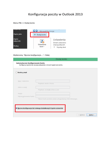 Konfiguracja poczty w Outlook 2013 Menu Plik => Dodaj konto Wybieramy: 'Ręczna konfiguracja….' i Dalej Wybieramy 'POP lub IMAP ' i Dalej Uzupełniamy konfigurację: Imię i nazwisko - adres email - serwerów poczty przychodzącej (nazwa domeny pocztowej) - serwerów poczty wychodzącej (nazwa domeny pocztowej) - nazwa użytkownika (pełny adres email) - hasło A następnie wybieramy opcję 'Więcej ustawień' I tu na zakładce 'Serwer wychodzący' zaznaczamy ptaszka dla pola ‘Serwer wychodzący SMTP wymaga uwierzytelnienia’ Następnie ok, dalej i to byłby koniec.