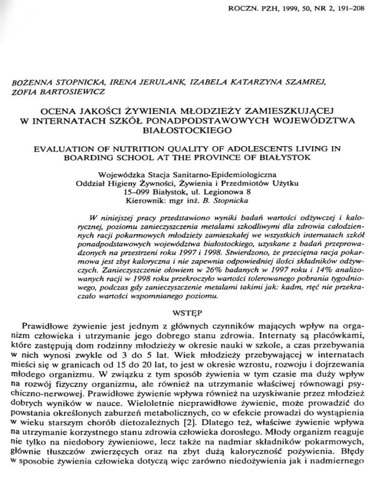 ROCZN. PZH, 1999, 50, NR 2, 191-208 BOŻENNA STOPNICKA, IREN A JERULANK, IZA B E LA K ATARZYN A SZAMREJ, ZOFIA BARTO SIEW ICZ OCENA JAKOŚCI ŻYW IENIA M ŁO DZIEŻY ZAM IESZKUJĄCEJ W INTERNATACH SZKÓŁ PO NADPO DSTAW OW YCH W OJEW ÓDZTW A BIAŁOSTOCKIEGO EV ALU A TIO N O F N U TR ITIO N QUALITY O F ADOLESCENTS LIVING IN B O A RD ING SCH O O L A T T H E PRO VIN CE O F BIAŁYSTOK Wojewódzka Stacja Sanitarno-Epidemiologiczna Oddział Higieny Żywności, Żywienia i Przedmiotów Użytku 15-099 Białystok, ul. Legionowa 8 Kierownik: mgr inż. B. Stopnicka W niniejszej pracy przedstawiono wyniki badań wartości odżywczej i kalo rycznej, poziomu zanieczyszczenia metalami szkodliwymi dla zdrowia całodzien nych racji pokarmowych młodzieży zamieszkałej we wszystkich internatach szkół ponadpodstawowych województwa białostockiego, uzyskane z badań przeprowa dzonych na przestrzeni roku 1997 i 1998. Stwierdzono, że przeciętna racja pokar mowa jest zbyt kaloryczna i nie zapewnia odpowiedniej ilości składników odżyw czych. Zanieczyszczenie ołowiem w 26% badanych w 1997 roku i 14% analizo wanych racji w 1998 roku przekroczyło wartości tolerowanego pobrania tygodnio wego, podczas gdy zanieczyszczenie metalami takimi jak: kadm, rtęć nie przekra czało wartości wspomnianego poziomu. WSTĘP Prawidłowe żywienie jest jednym z głównych czynników mających wpływ na orga nizm człowieka i utrzymanie jego dobrego stanu zdrowia. Internaty są placówkami, które zastępują dom rodzinny młodzieży w okresie nauki w szkole, a czas przebywania w nich wynosi zwykle od 3 do 5 lat. Wiek młodzieży przebywającej w internatach mieści się w granicach od 15 do 20 lat, to jest w okresie wzrostu, rozwoju i dojrzewania młodego organizmu. W związku z tym sposób żywienia w tym czasie ma duży wpływ na rozwój fizyczny organizmu, ale również na utrzymanie właściwej równowagi psychiczno-nerwowej. Prawidłowe żywienie wpływa również na uzyskiwanie przez młodzież dobrych wyników w nauce. W ieloletnie nieprawidłowe żywienie, może prowadzić do powstania określonych zaburzeń metabolicznych, co w efekcie prowadzi do wystąpienia w wieku starszym chorób dietozależnych [2]. Dlatego też, właściwe żywienie wpływa na utrzymanie korzystnego stanu zdrowia człowieka dorosłego. Młody organizm reaguje nie tylko na niedobory żywieniowe, lecz także na nadmiar składników pokarmowych, głównie tłuszczów zwierzęcych oraz na zbyt dużą kaloryczność pożywienia. Błędy w sposobie żywienia człowieka dotyczą więc zarówno niedożywienia jak i nadmiernego 192 В. Stopnicka i in. Nr 2 spożycia żywności. Młody wiek oraz długi czas przebywania młodzieży w internatach stwarza możliwość wyrobienia u wychowanków wielu prawidłowych nawyków żywienio wych, które przeniosą w przyszłości do swoich domów [2, 16]. M A TERIAŁ I M ETO DY BADAŃ Badania sposobu żywienia w roku 1997 objęły wszystkie, tj. 31 internatów w województwie białostockim. Łącznie oceniono sposób żywienia wśród około 3600 osób, w wieku od 16 do 20 lat, w tym około 2100 dziewcząt i 1500 chłopców. Natomiast w roku 1998 tego samego rodzaju badania przeprowadzono wśród młodzieży z 29 internatach (dwa uległy likwidacji), łącznie badano żywienie - około 3685 osób, w tym 1981 dziewcząt i 1704 chłopców. M ateriały do badań pobierane były w okresie marzec - grudzień 1997 i 1998. Badania prowadzono w kierunku oceny wartości odżywczej całodziennych racji pokarmowych oraz określano poziom zanieczyszczenia racji pokarmowych metalami szkodliwymi dla zdrowia człowieka. Badania wartości odżywczej przeprowadzono m etodą teoretyczną i na podstawie analizy laboratoryjnej posiłków stanowiących całodzienną rację pokarmową. Badania teoretyczne przeprowadzono w oparciu o analizę spożycia produktów z 12 podsta wowych grup [9], odzwierciedleniem których jest zawartość podstawowych składników odżyw czych przypadająca na 1 dzień ocenianej dekady na 1 osobę żywioną. Uwzględniono przy tym grupy wiekowe osób (chłopcy, dziewczęta oraz mężczyźni, kobiety) korzystających z żywienia w stołówce przy internacie. Badaniami laboratoryjnymi objęto posiłki stanowiące całodzienną rację pokarmową w okreś lonym dniu. We wszystkich pobranych do badań laboratoryjnych próbkach posiłków oznaczono zawartość białka, tłuszczu, węglowodanów, określono wartość kaloryczną, co stanowiło podstawę do ustalenia udziału energii pochodzącej z białka, z tłuszczu i węglowodanów, zarówno w po szczególnych posiłkach, jak również w całodziennej racji pokarmowej z dnia objętego badaniem. Ponadto w analizowanej całodziennej racji pokarmowej oznaczono zawartość witaminy C, żelaza, wapnia i chlorku sodu oraz określono poziom zanieczyszczenia metalami szkodliwymi dla zdrowia. W artość energetyczną racji pokarmowej i zawartość składników odżywczych, witaminy С oznaczono według metodyki podanej w pracy zbiorowej pod redakcją Rutkowskiej [14]. Zawartość białka oznaczono m etodą Kjeldahla, do przeliczeń azotu na białko stosowano odpowiednie współczynniki [11]. Zawartość tłuszczu oznaczono m etodą Schmidt-Bądzyńskiego [14, 3]. Zawartość popiołu ogólnego oznaczono m etodą polegającą na spopieleniu próbki i wagowym oznaczeniu zawartości popiołu [14]. Zawartość wilgoci (zawartość suchej masy) oznaczono przez suszenie próbek wymieszanych z piaskiem w suszarce elektrycznej w 105°C (± 3°C) do stałej masy [10, 3]. Zawartość węglowodanów wyliczono wg wzoru zamieszczonego w normie BN-81/8131-03: węglowodany = 100 - (woda + popiół ogólny + białko + tłuszcz) [10, 3]. Do oznaczenia zawartości składników mineralnych (wapń, żelazo) oraz metali szkodliwych dla zdrowia (Pb, Cu, Zn, Cd) zastosowano m etodę płomieniowej absorpcyjnej spektrofotometrii atomowej, po uprzednim spopieleniu próbek w tem peraturze